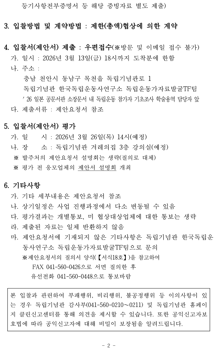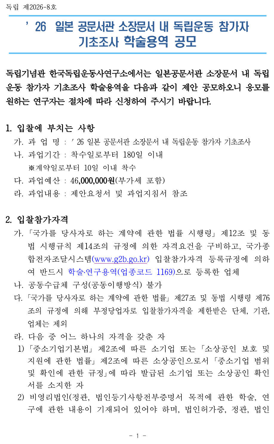 2026 일본 공문서관 소장문서 내 독립운동 참가자 기초조사 학술용역