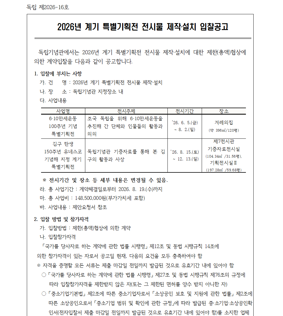 2026년 계기 특별기획전 전시물 제작·설치