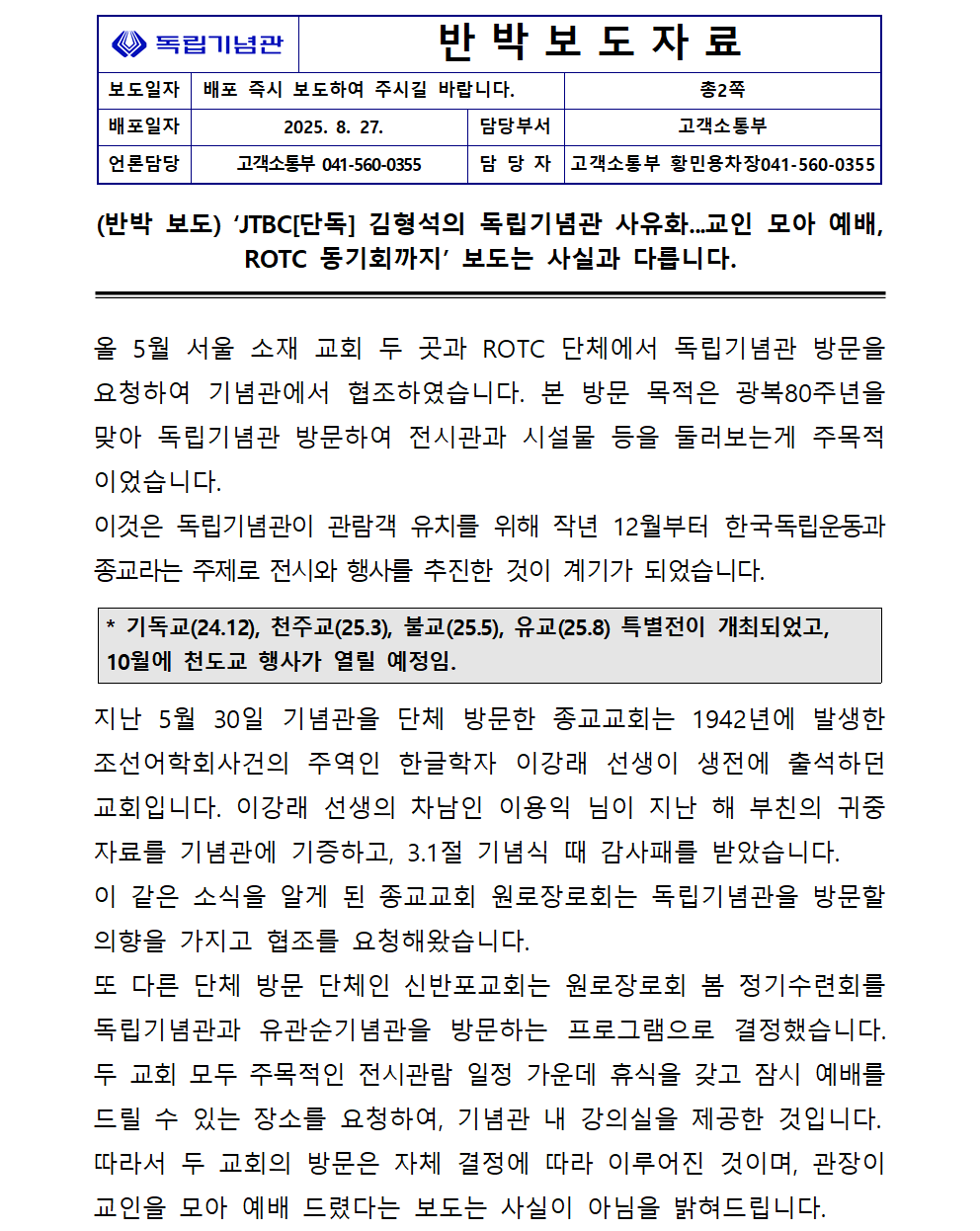 반박보도자료(20250827) JTBC 김형석의 독립기념관 사유화
