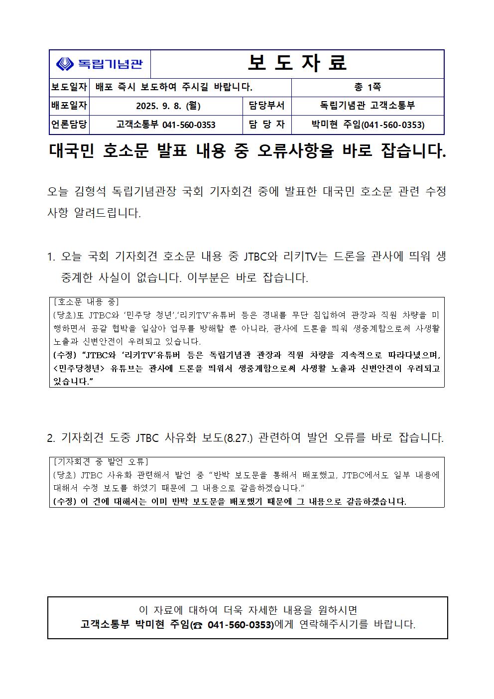 정정보도(20250908) 대국민 호소문 발표 내용 중 오류사항을 바로 잡습니다