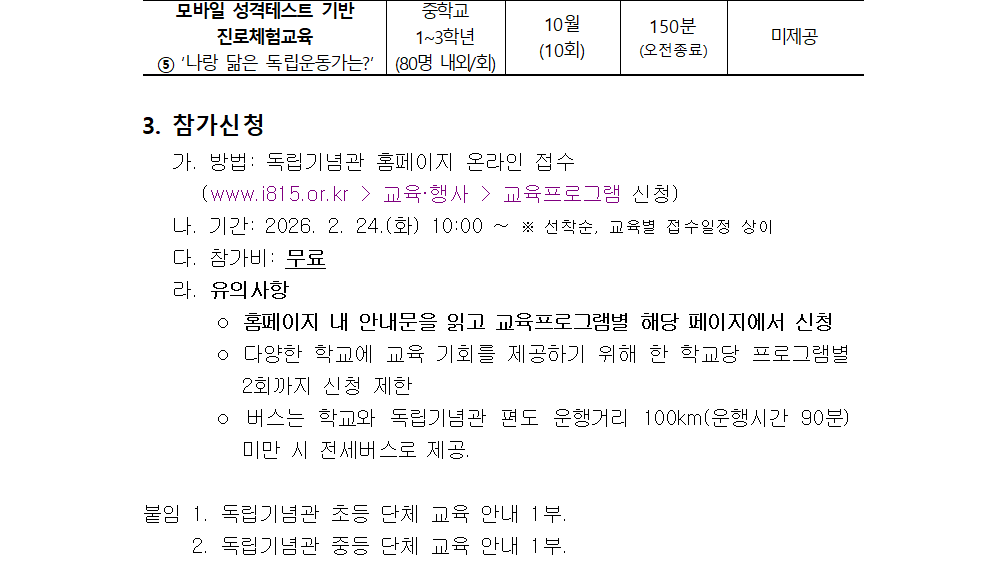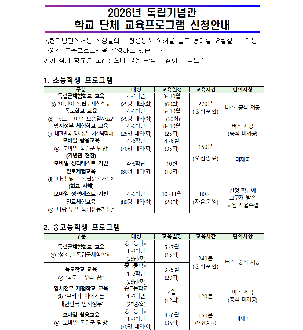 2026년 독립기념관 학교 단체 교육프로그램 신청 안내