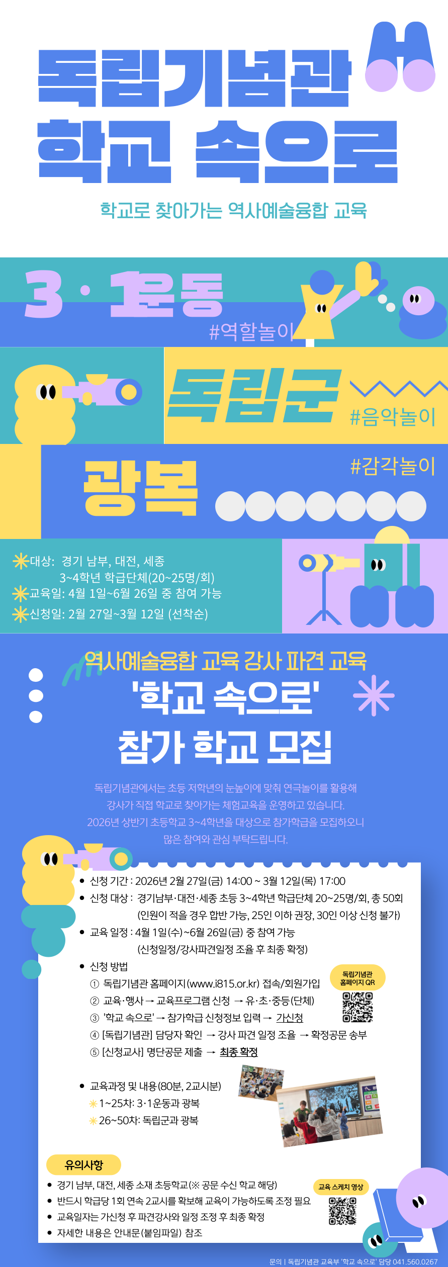 독립기념관에서는 학생들의 눈높이에 맞춰 연극놀이를 활용해 강사가 직접 찾아가는 체험교육을 운영하고 있습니다. 2026년 상반기 초등학교 3~4학년 참가 학급을 모집하오니 많은 참여와 관심 부탁드립니다.