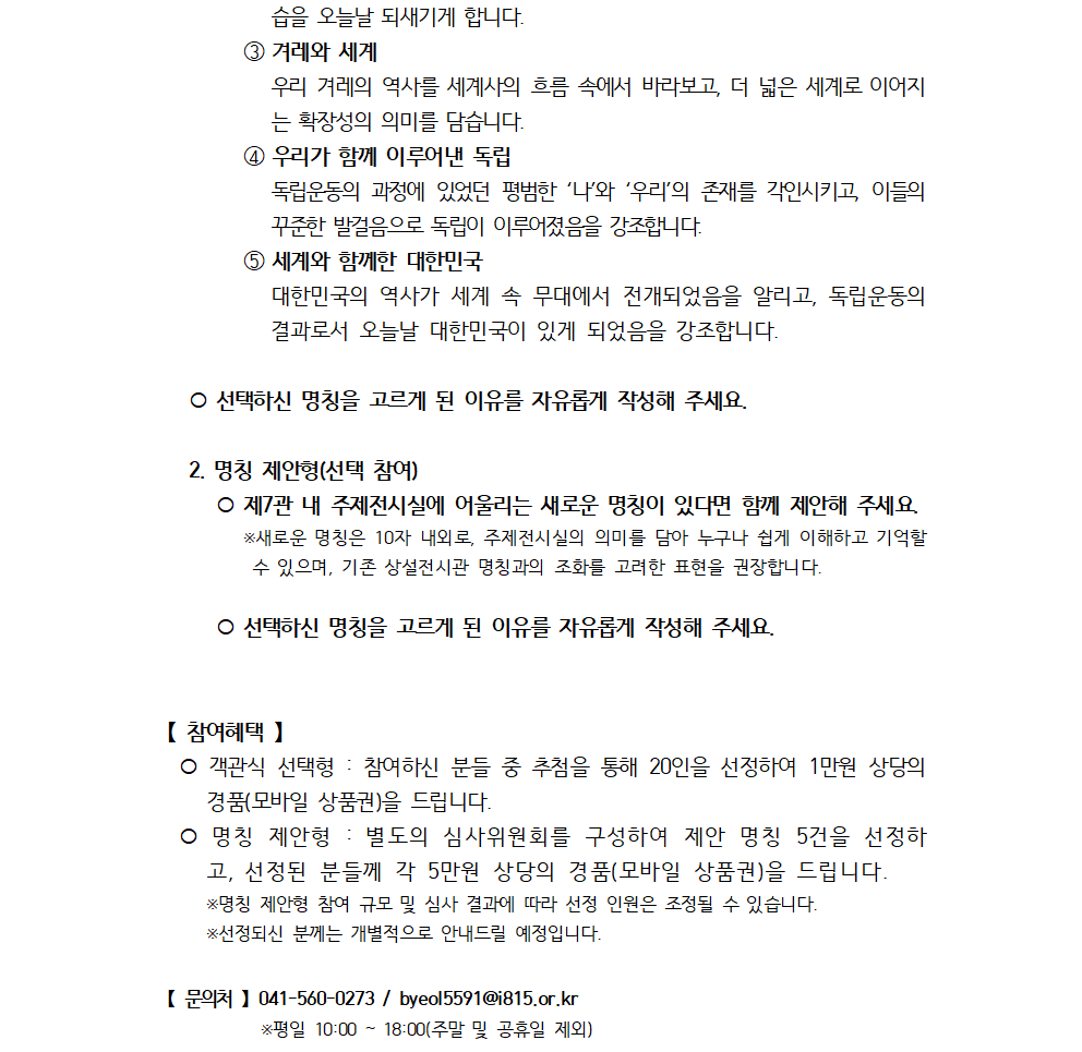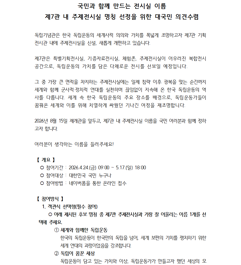 제7관 내 주제전시실 명칭 선정을 위한 대국민 의견 수렴 실시