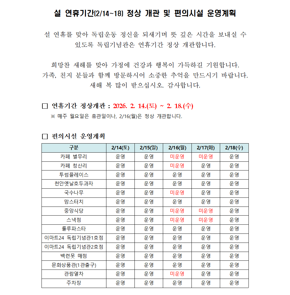 설 연휴기간[2/14~18] 정상 개관 및 편의시설 운영계획