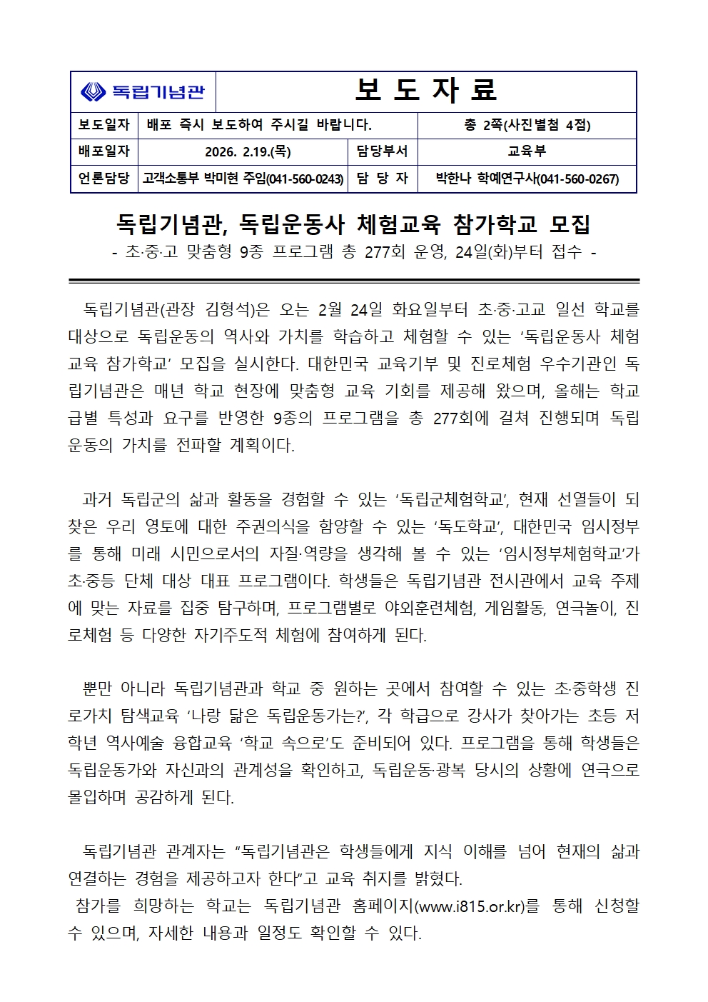 독립기념관, 독립운동사 체험교육 참가학교 모집.hwp