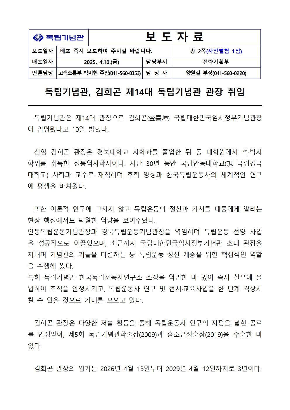 독립기념관, 김희곤 제14대 독립기념관 관장 취임.hwp