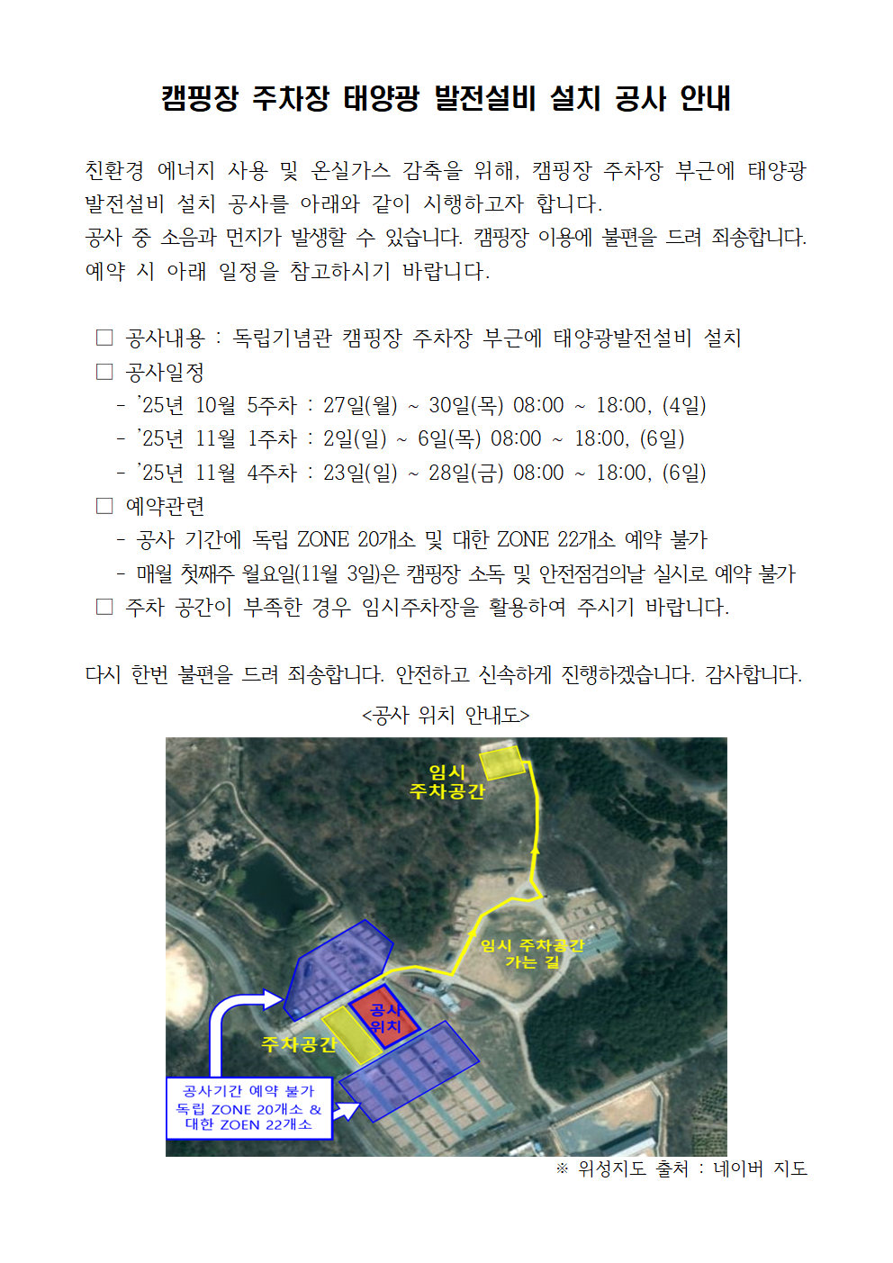 캠핑장 주차장 태양광 발전설비 설치 공사 안내