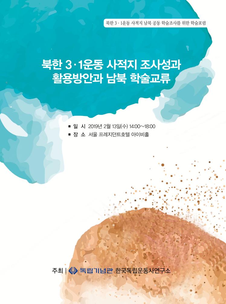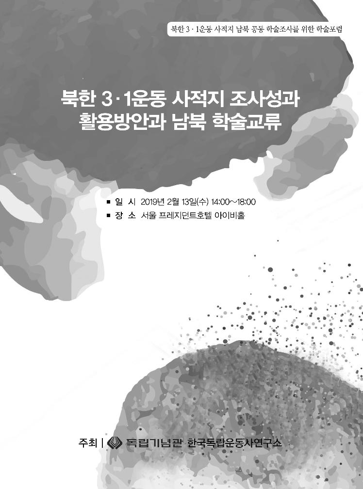 북한 3·1운동 사적지 남북 공동 학술조사를 위한 학술포럼 ■ 일 시 2019년 2월 13일(수) 14:00~18:00 ■ 장 소 서울 프레지던트호텔 아이비홀 북한 3·1운동 사적지 조사성과 활용방안과 남북 학술교류 주최┃ 한국독립운동사연구소