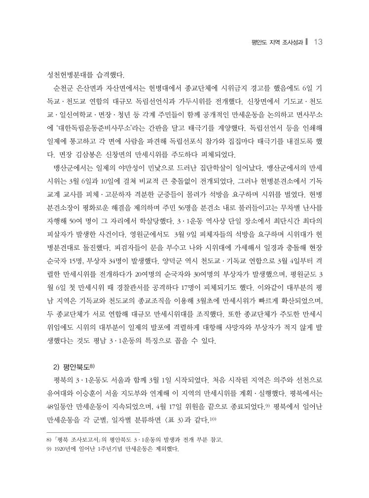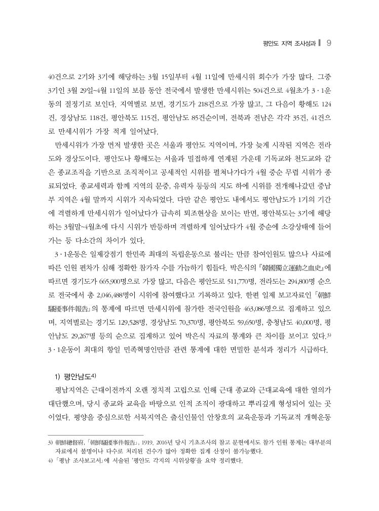 평안도 지역 조사성과❙ 9 40건으로 2기와 3기에 해당하는 3월 15일부터 4월 11일에 만세시위 회수가 가장 많다. 그중 3기인 3월 29일~4월 11일의 보름 동안 전국에서 발생한 만세시위는 504건으로 4월초가 3·1운 동의 절정기로 보인다. 지역별로 보면, 경기도가 218건으로 가장 많고, 그 다음이 황해도 124 건, 경상남도 118건, 평안북도 115건, 평안남도 85건순이며, 전북과 전남은 각각 35건, 41건으 로 만세시위가 가장 적게 일어났다. 만세시위가 가장 먼저 발생한 곳은 서울과 평안도 지역이며, 가장 늦게 시작된 지역은 전라 도와 경상도이다. 평안도나 황해도는 서울과 밀접하게 연계된 가운데 기독교와 천도교와 같 은 종교조직을 기반으로 조직적이고 공세적인 시위를 펼쳐나가다가 4월 중순 무렵 시위가 종 료되었다. 종교세력과 함께 지역의 문중, 유력자 등등의 지도 하에 시위를 전개해나갔던 중남 부 지역은 4월 말까지 시위가 지속되었다. 다만 같은 평안도 내에서도 평안남도가 1기의 기간 에 격렬하게 만세시위가 일어났다가 급속히 퇴조현상을 보이는 반면, 평안북도는 3기에 해당 하는 3월말~4월초에 다시 시위가 반등하며 격렬하게 일어났다가 4월 중순에 소강상태에 들어 가는 등 다소간의 차이가 있다. 3·1운동은 일제강점기 한민족 최대의 독립운동으로 불리는 만큼 참여인원도 많으나 사료에 따른 인원 편차가 심해 정확한 참가자 수를 가늠하기 힘들다. 박은식의 韓國獨立運動之血史에 따르면 경기도가 665,900명으로 가장 많고, 다음은 평안도로 511,770명, 전라도는 294,800명 순으 로 전국에서 총 2,046,488명이 시위에 참여했다고 기록하고 있다. 한편 일제 보고자료인 「朝鮮 騷擾事件報告」의 통계에 따르면 만세시위에 참가한 전국인원을 463,086명으로 집계하고 있으 며, 지역별로는 경기도 129,528명, 경상남도 70,370명, 평안북도 59,650명, 충청남도 40,000명, 평 안남도 29,267명 등의 순으로 집계하고 있어 박은식 자료의 통계와 큰 차이를 보이고 있다.3) 3·1운동이 최대의 항일 민족혁명인만큼 관련 통계에 대한 면밀한 분석과 정리가 시급하다. 1) 평안남도4) 평남지역은 근대이전까지 오랜 정치적 고립으로 인해 근대 종교와 근대교육에 대한 열의가 대단했으며, 당시 종교와 교육을 바탕으로 인적 조직이 광대하고 뿌리깊게 형성되어 있는 곳 이었다. 평양을 중심으로한 서북지역은 출신인물인 안창호의 교육운동과 기독교적 개혁운동 3) 朝鮮總督府, 「朝鮮騷擾事件報告」, 1919. 2016년 당시 기초조사의 참고 문헌에서도 참가 인원 통계는 대부분의 자료에서 불명이나 다수로 처리된 건수가 많아 정확한 집계 산정이 불가능했다. 4) 「평남 조사보고서」에 서술된 ‘평안도 각지의 시위상황’을 요약 정리했다.