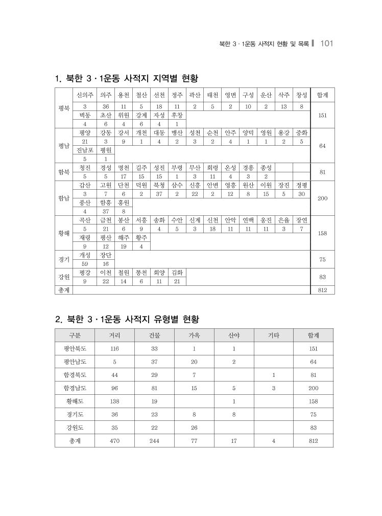 북한 3·1운동 사적지 현황 및 목록❙ 101 1. 북한 3·1운동 사적지 지역별 현황 평북 신의주 의주 용천 철산 선천 정주 곽산 태천 영변 구성 운산 삭주 창성 합계 3 36 11 5 18 11 2 5 2 10 2 13 8 151벽동 초산 위원 강계 자성 후창 4 6 4 6 4 1 평남 평양 강동 강서 개천 대동 맹산 성천 순천 안주 양덕 영원 용강 중화 64 21 3 9 1 4 2 3 2 4 1 1 2 5 진남포 평원 5 1 함북 청진 경성 명천 길주 성진 부령 무산 회령 온성 경흥 종성 81 5 5 17 15 15 1 3 11 4 3 2 함남 갑산 고원 단천 덕원 북청 삼수 신흥 안변 영흥 원산 이원 장진 정평 200 3 7 6 2 37 2 22 2 12 8 15 5 30 풍산 함흥 홍원 4 37 8 황해 곡산 금천 봉산 서흥 송화 수안 신계 신천 안악 연백 옹진 은율 장연 158 5 21 6 9 4 5 3 18 11 11 11 3 7 재령 평산 해주 황주 9 12 19 4 경기 개성 장단 75 59 16 강원 평강 이천 철원 통천 회양 김화 83 9 22 14 6 11 21 총계 812 2. 북한 3·1운동 사적지 유형별 현황 구분 거리 건물 가옥 산야 기타 합계 평안북도 116 33 1 1 151 평안남도 5 37 20 2 64 함경북도 44 29 7 1 81 함경남도 96 81 15 5 3 200 황해도 138 19 1 158 경기도 36 23 8 8 75 강원도 35 22 26 83 총계 470 244 77 17 4 812