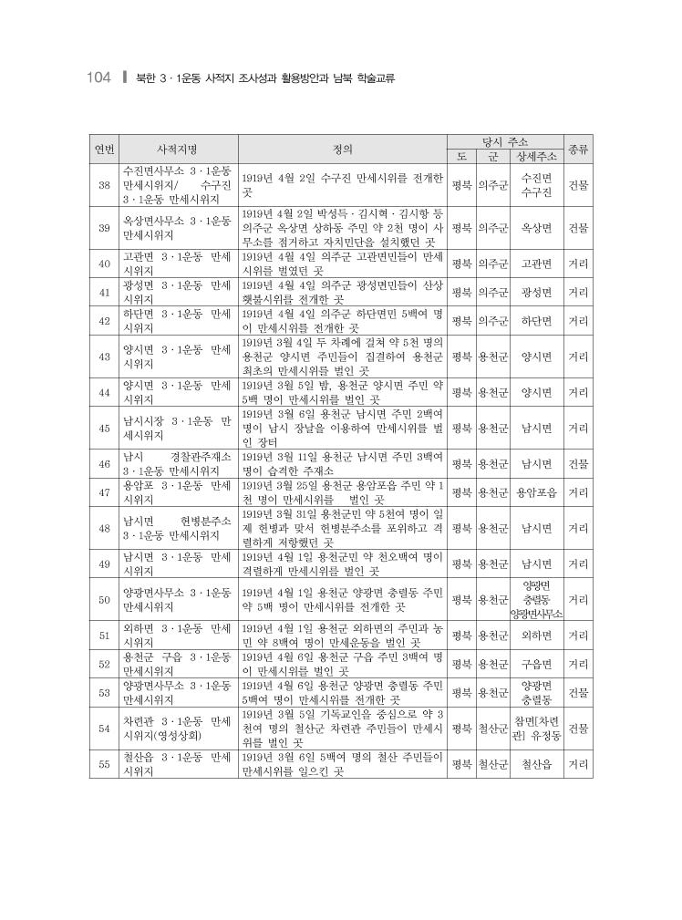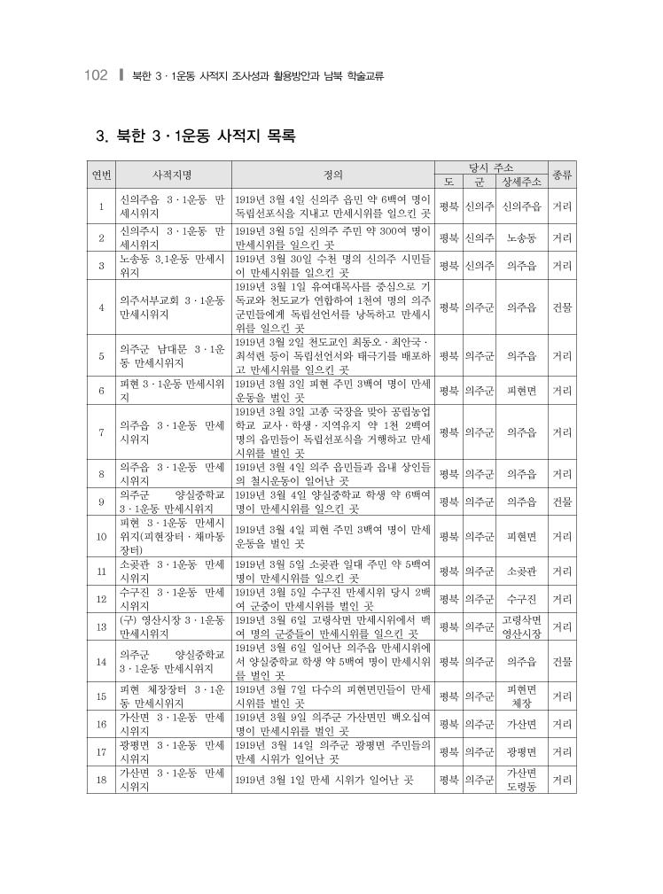 102 ❙ 북한 3·1운동 사적지 조사성과 활용방안과 남북 학술교류 연번 사적지명 정의 당시 주소 종류 도 군 상세주소 1 신의주읍 3·1운동 만 세시위지 1919년 3월 4일 신의주 읍민 약 6백여 명이 독립선포식을 지내고 만세시위를 일으킨 곳 평북 신의주 신의주읍 거리 2 신의주시 3·1운동 만 세시위지 1919년 3월 5일 신의주 주민 약 300여 명이 만세시위를 일으킨 곳 평북 신의주 노송동 거리 3 노송동 3.1운동 만세시 위지 1919년 3월 30일 수천 명의 신의주 시민들 이 만세시위를 일으킨 곳 평북 신의주 의주읍 거리 4 의주서부교회 3·1운동 만세시위지 1919년 3월 1일 유여대목사를 중심으로 기 독교와 천도교가 연합하여 1천여 명의 의주 군민들에게 독립선언서를 낭독하고 만세시 위를 일으킨 곳 평북 의주군 의주읍 건물 5 의주군 남대문 3·1운 동 만세시위지 1919년 3월 2일 천도교인 최동오·최안국· 최석련 등이 독립선언서와 태극기를 배포하 고 만세시위를 일으킨 곳 평북 의주군 의주읍 거리 6 피현 3·1운동 만세시위 지 1919년 3월 3일 피현 주민 3백여 명이 만세 운동을 벌인 곳 평북 의주군 피현면 거리 7 의주읍 3·1운동 만세 시위지 1919년 3월 3일 고종 국장을 맞아 공립농업 학교 교사·학생·지역유지 약 1천 2백여 명의 읍민들이 독립선포식을 거행하고 만세 시위를 벌인 곳 평북 의주군 의주읍 거리 8 의주읍 3·1운동 만세 시위지 1919년 3월 4일 의주 읍민들과 읍내 상인들 의 철시운동이 일어난 곳 평북 의주군 의주읍 거리 9 의주군 양실중학교 3·1운동 만세시위지 1919년 3월 4일 양실중학교 학생 약 6백여 명이 만세시위를 일으킨 곳 평북 의주군 의주읍 건물 10 피현 3·1운동 만세시 위지(피현장터·채마동 장터) 1919년 3월 4일 피현 주민 3백여 명이 만세 운동을 벌인 곳 평북 의주군 피현면 거리 11 소곶관 3·1운동 만세 시위지 1919년 3월 5일 소곶관 일대 주민 약 5백여 명이 만세시위를 일으킨 곳 평북 의주군 소곶관 거리 12 수구진 3·1운동 만세 시위지 1919년 3월 5일 수구진 만세시위 당시 2백 여 군중이 만세시위를 벌인 곳 평북 의주군 수구진 거리 13 (구) 영산시장 3·1운동 만세시위지 1919년 3월 6일 고령삭면 만세시위에서 백 여 명의 군중들이 만세시위를 일으킨 곳 평북 의주군 고령삭면 영산시장 거리 14 의주군 양실중학교 3·1운동 만세시위지 1919년 3월 6일 일어난 의주읍 만세시위에 서 양실중학교 학생 약 5백여 명이 만세시위 를 벌인 곳 평북 의주군 의주읍 건물 15 피현 체장장터 3·1운 동 만세시위지 1919년 3월 7일 다수의 피현면민들이 만세 시위를 벌인 곳 평북 의주군 피현면 체장 거리 16 가산면 3·1운동 만세 시위지 1919년 3월 9일 의주군 가산면민 백오십여 명이 만세시위를 벌인 곳 평북 의주군 가산면 거리 17 광평면 3·1운동 만세 시위지 1919년 3월 14일 의주군 광평면 주민들의 만세 시위가 일어난 곳 평북 의주군 광평면 거리 18 가산면 3·1운동 만세 시위지 1919년 3월 1일 만세 시위가 일어난 곳 평북 의주군 가산면 도령동 거리 3. 북한 3·1운동 사적지 목록