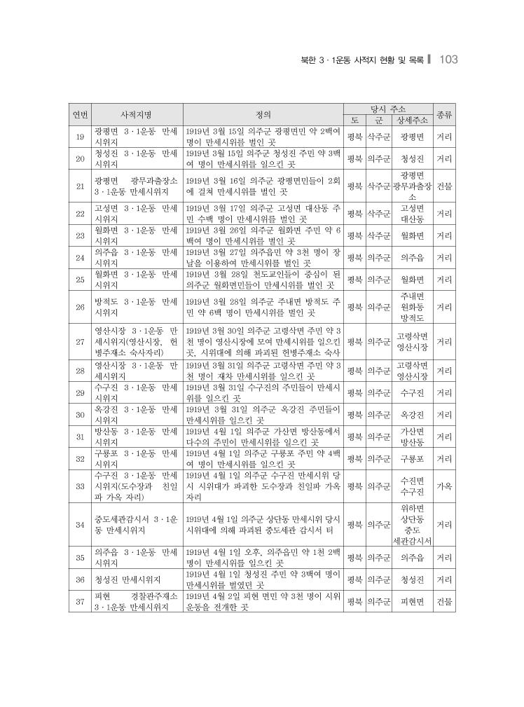 북한 3·1운동 사적지 현황 및 목록❙ 103 연번 사적지명 정의 당시 주소 종류 도 군 상세주소 19 광평면 3·1운동 만세 시위지 1919년 3월 15일 의주군 광평면민 약 2백여 명이 만세시위를 벌인 곳 평북 삭주군 광평면 거리 20 청성진 3·1운동 만세 시위지 1919년 3월 15일 의주군 청성진 주민 약 3백 여 명이 만세시위를 일으킨 곳 평북 의주군 청성진 거리 21 광평면 광무과출장소 3·1운동 만세시위지 1919년 3월 16일 의주군 광평면민들이 2회 에 걸쳐 만세시위를 벌인 곳 평북 삭주군 광평면 광무과출장 소 건물 22 고성면 3·1운동 만세 시위지 1919년 3월 17일 의주군 고성면 대산동 주 민 수백 명이 만세시위를 벌인 곳 평북 삭주군 고성면 대산동 거리 23 월화면 3·1운동 만세 시위지 1919년 3월 26일 의주군 월화면 주민 약 6 백여 명이 만세시위를 벌인 곳 평북 삭주군 월화면 거리 24 의주읍 3·1운동 만세 시위지 1919년 3월 27일 의주읍민 약 3천 명이 장 날을 이용하여 만세시위를 벌인 곳 평북 의주군 의주읍 거리 25 월화면 3·1운동 만세 시위지 1919년 3월 28일 천도교인들이 중심이 된 의주군 월화면민들이 만세시위를 벌인 곳 평북 의주군 월화면 거리 26 방적도 3·1운동 만세 시위지 1919년 3월 28일 의주군 주내면 방적도 주 민 약 6백 명이 만세시위를 벌인 곳 평북 의주군 주내면 원화동 방적도 거리 27 영산시장 3·1운동 만 세시위지(영산시장, 헌 병주재소 숙사자리) 1919년 3월 30일 의주군 고령삭면 주민 약 3 천 명이 영산시장에 모여 만세시위를 일으킨 곳, 시위대에 의해 파괴된 헌병주재소 숙사 평북 의주군 고령삭면 영산시장 거리 28 영산시장 3·1운동 만 세시위지 1919년 3월 31일 의주군 고령삭면 주민 약 3 천 명이 재차 만세시위를 일으킨 곳 평북 의주군 고령삭면 영산시장 거리 29 수구진 3·1운동 만세 시위지 1919년 3월 31일 수구진의 주민들이 만세시 위를 일으킨 곳 평북 의주군 수구진 거리 30 옥강진 3·1운동 만세 시위지 1919년 3월 31일 의주군 옥강진 주민들이 만세시위를 일으킨 곳 평북 의주군 옥강진 거리 31 방산동 3·1운동 만세 시위지 1919년 4월 1일 의주군 가산면 방산동에서 다수의 주민이 만세시위를 일으킨 곳 평북 의주군 가산면 방산동 거리 32 구룡포 3·1운동 만세 시위지 1919년 4월 1일 의주군 구룡포 주민 약 4백 여 명이 만세시위를 일으킨 곳 평북 의주군 구룡포 거리 33 수구진 3·1운동 만세 시위지(도수장과 친일 파 가옥 자리) 1919년 4월 1일 의주군 수구진 만세시위 당 시 시위대가 파괴한 도수장과 친일파 가옥 자리 평북 의주군 수진면 수구진 가옥 34 중도세관감시서 3·1운 동 만세시위지 1919년 4월 1일 의주군 상단동 만세시위 당시 시위대에 의해 파괴된 중도세관 감시서 터 평북 의주군 위하면 상단동 중도 세관감시서 거리 35 의주읍 3·1운동 만세 시위지 1919년 4월 1일 오후, 의주읍민 약 1천 2백 명이 만세시위를 일으킨 곳 평북 의주군 의주읍 거리 36 청성진 만세시위지 1919년 4월 1일 청성진 주민 약 3백여 명이 만세시위를 벌였던 곳 평북 의주군 청성진 거리 37 피현 경찰관주재소 3·1운동 만세시위지 1919년 4월 2일 피현 면민 약 3천 명이 시위 운동을 전개한 곳 평북 의주군 피현면 건물