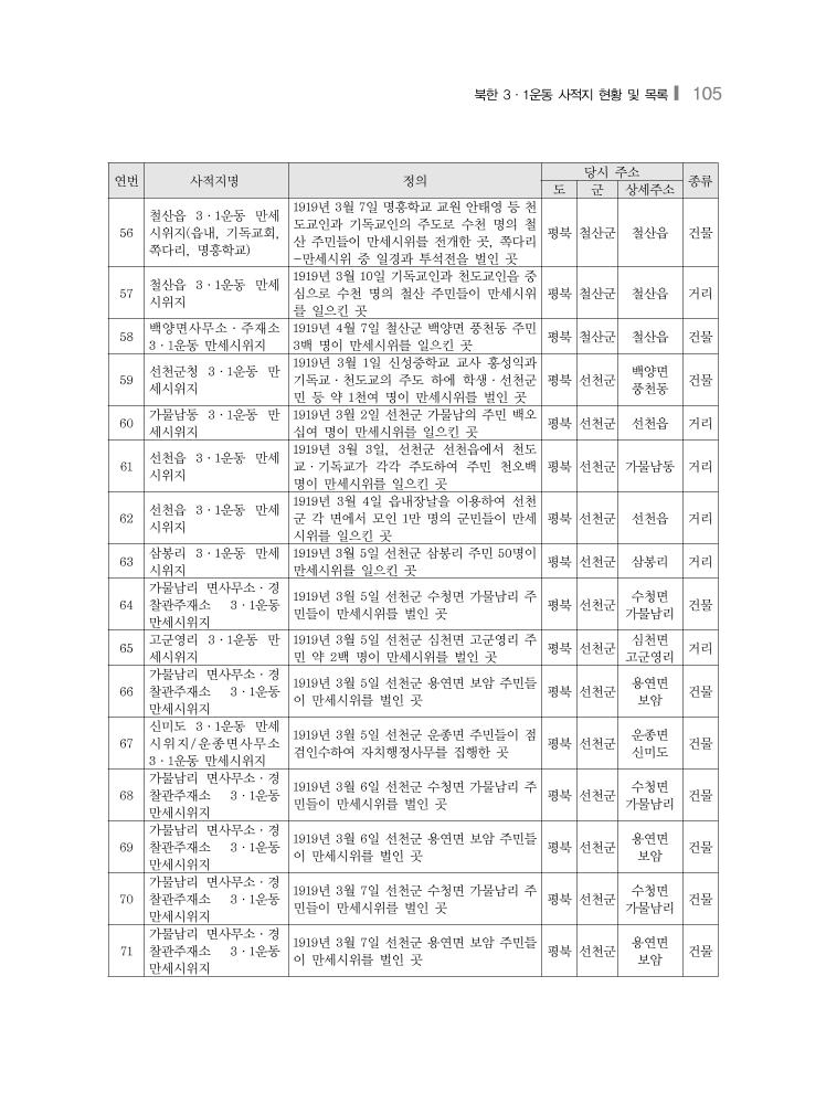 북한 3·1운동 사적지 현황 및 목록❙ 105 연번 사적지명 정의 당시 주소 종류 도 군 상세주소 56 철산읍 3·1운동 만세 시위지(읍내, 기독교회, 쪽다리, 명흥학교) 1919년 3월 7일 명흥학교 교원 안태영 등 천 도교인과 기독교인의 주도로 수천 명의 철 산 주민들이 만세시위를 전개한 곳, 쪽다리 -만세시위 중 일경과 투석전을 벌인 곳 평북 철산군 철산읍 건물 57 철산읍 3·1운동 만세 시위지 1919년 3월 10일 기독교인과 천도교인을 중 심으로 수천 명의 철산 주민들이 만세시위 를 일으킨 곳 평북 철산군 철산읍 거리 58 백양면사무소·주재소 3·1운동 만세시위지 1919년 4월 7일 철산군 백양면 풍천동 주민 3백 명이 만세시위를 일으킨 곳 평북 철산군 철산읍 건물 59 선천군청 3·1운동 만 세시위지 1919년 3월 1일 신성중학교 교사 홍성익과 기독교·천도교의 주도 하에 학생·선천군 민 등 약 1천여 명이 만세시위를 벌인 곳 평북 선천군 백양면 풍천동 건물 60 가물남동 3·1운동 만 세시위지 1919년 3월 2일 선천군 가물남의 주민 백오 십여 명이 만세시위를 일으킨 곳 평북 선천군 선천읍 거리 61 선천읍 3·1운동 만세 시위지 1919년 3월 3일, 선천군 선천읍에서 천도 교·기독교가 각각 주도하여 주민 천오백 명이 만세시위를 일으킨 곳 평북 선천군 가물남동 거리 62 선천읍 3·1운동 만세 시위지 1919년 3월 4일 읍내장날을 이용하여 선천 군 각 면에서 모인 1만 명의 군민들이 만세 시위를 일으킨 곳 평북 선천군 선천읍 거리 63 삼봉리 3·1운동 만세 시위지 1919년 3월 5일 선천군 삼봉리 주민 50명이 만세시위를 일으킨 곳 평북 선천군 삼봉리 거리 64 가물남리 면사무소·경 찰관주재소 3·1운동 만세시위지 1919년 3월 5일 선천군 수청면 가물남리 주 민들이 만세시위를 벌인 곳 평북 선천군 수청면 가물남리 건물 65 고군영리 3·1운동 만 세시위지 1919년 3월 5일 선천군 심천면 고군영리 주 민 약 2백 명이 만세시위를 벌인 곳 평북 선천군 심천면 고군영리 거리 66 가물남리 면사무소·경 찰관주재소 3·1운동 만세시위지 1919년 3월 5일 선천군 용연면 보암 주민들 이 만세시위를 벌인 곳 평북 선천군 용연면 보암 건물 67 신미도 3·1운동 만세 시위지/운종면사무소 3·1운동 만세시위지 1919년 3월 5일 선천군 운종면 주민들이 점 검인수하여 자치행정사무를 집행한 곳 평북 선천군 운종면 신미도 건물 68 가물남리 면사무소·경 찰관주재소 3·1운동 만세시위지 1919년 3월 6일 선천군 수청면 가물남리 주 민들이 만세시위를 벌인 곳 평북 선천군 수청면 가물남리 건물 69 가물남리 면사무소·경 찰관주재소 3·1운동 만세시위지 1919년 3월 6일 선천군 용연면 보암 주민들 이 만세시위를 벌인 곳 평북 선천군 용연면 보암 건물 70 가물남리 면사무소·경 찰관주재소 3·1운동 만세시위지 1919년 3월 7일 선천군 수청면 가물남리 주 민들이 만세시위를 벌인 곳 평북 선천군 수청면 가물남리 건물 71 가물남리 면사무소·경 찰관주재소 3·1운동 만세시위지 1919년 3월 7일 선천군 용연면 보암 주민들 이 만세시위를 벌인 곳 평북 선천군 용연면 보암 건물