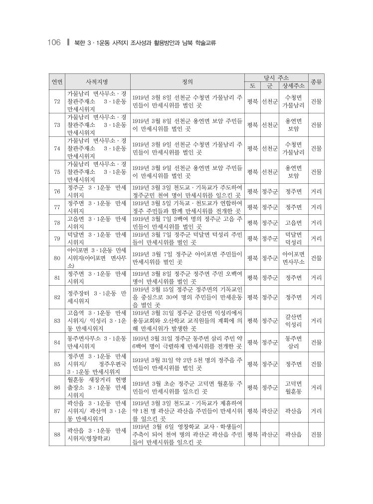 106 ❙ 북한 3·1운동 사적지 조사성과 활용방안과 남북 학술교류 연번 사적지명 정의 당시 주소 종류 도 군 상세주소 72 가물남리 면사무소·경 찰관주재소 3·1운동 만세시위지 1919년 3월 8일 선천군 수청면 가물남리 주 민들이 만세시위를 벌인 곳 평북 선천군 수청면 가물남리 건물 73 가물남리 면사무소·경 찰관주재소 3·1운동 만세시위지 1919년 3월 8일 선천군 용연면 보암 주민들 이 만세시위를 벌인 곳 평북 선천군 용연면 보암 건물 74 가물남리 면사무소·경 찰관주재소 3·1운동 만세시위지 1919년 3월 9일 선천군 수청면 가물남리 주 민들이 만세시위를 벌인 곳 평북 선천군 수청면 가물남리 건물 75 가물남리 면사무소·경 찰관주재소 3·1운동 만세시위지 1919년 3월 9일 선천군 용연면 보암 주민들 이 만세시위를 벌인 곳 평북 선천군 용연면 보암 건물 76 정주군 3·1운동 만세 시위지 1919년 3월 3일 천도교·기독교가 주도하여 정주군민 천여 명이 만세시위를 일으킨 곳 평북 정주군 정주면 거리 77 정주면 3·1운동 만세 시위지 1919년 3월 5일 기독교·천도교가 연합하여 정주 주민들과 함께 만세시위를 전개한 곳 평북 정주군 정주면 거리 78 고읍면 3·1운동 만세 시위지 1919년 3월 7일 3백여 명의 정주군 고읍 주 민들이 만세시위를 벌인 곳 평북 정주군 고읍면 거리 79 덕달면 3·1운동 만세 시위지 1919년 3월 7일 정주군 덕달면 덕성리 주민 들이 만세시위를 벌인 곳 평북 정주군 덕달면 덕성리 거리 80 아이포면 3·1운동 만세 시위지(아이포면 면사무 소) 1919년 3월 7일 정주군 아이포면 주민들이 만세시위를 벌인 곳 평북 정주군 아이포면 면사무소 건물 81 정주면 3·1운동 만세 시위지 1919년 3월 8일 정주군 정주면 주민 오백여 명이 만세시위를 벌인 곳 평북 정주군 정주면 거리 82 정주장터 3·1운동 만 세시위지 1919년 3월 15일 정주군 정주면의 기독교인 을 중심으로 30여 명의 주민들이 만세운동 을 벌인 곳 평북 정주군 정주면 거리 83 고읍역 3·1운동 만세 시위지/ 익성리 3·1운 동 만세시위지 1919년 3월 31일 정주군 갈산면 익성리에서 용동교회와 오산학교 교직원들의 계획에 의 해 만세시위가 발생한 곳 평북 정주군 갈산면 익성리 거리 84 동주면사무소 3·1운동 만세시위지 1919년 3월 31일 정주군 동주면 삼리 주민 약 6백여 명이 극렬하게 만세시위를 전개한 곳 평북 정주군 동주면 삼리 건물 85 정주면 3·1운동 만세 시위지/ 정주우편국 3·1운동 만세시위지 1919년 3월 31일 약 2만 5천 명의 정주읍 주 민들이 만세시위를 벌인 곳 평북 정주군 정주면 건물 86 월훈동 새장거리 헌병 출장소 3·1운동 만세 시위지 1919년 3월 초순 정주군 고덕면 월훈동 주 민들이 만세시위를 일으킨 곳 평북 정주군 고덕면 월훈동 거리 87 곽산읍 3·1운동 만세 시위지/ 곽산역 3·1운 동 만세시위지 1919년 3월 3일 천도교·기독교가 제휴하여 약 1천 명 곽산군 곽산읍 주민들이 만세시위 를 일으킨 곳 평북 곽산군 곽산읍 거리 88 곽산읍 3·1운동 만세 시위지(영창학교) 1919년 3월 6일 영창학교 교사·학생들이 주축이 되어 천여 명의 곽산군 곽산읍 주민 들이 만세시위를 일으킨 곳 평북 곽산군 곽산읍 건물