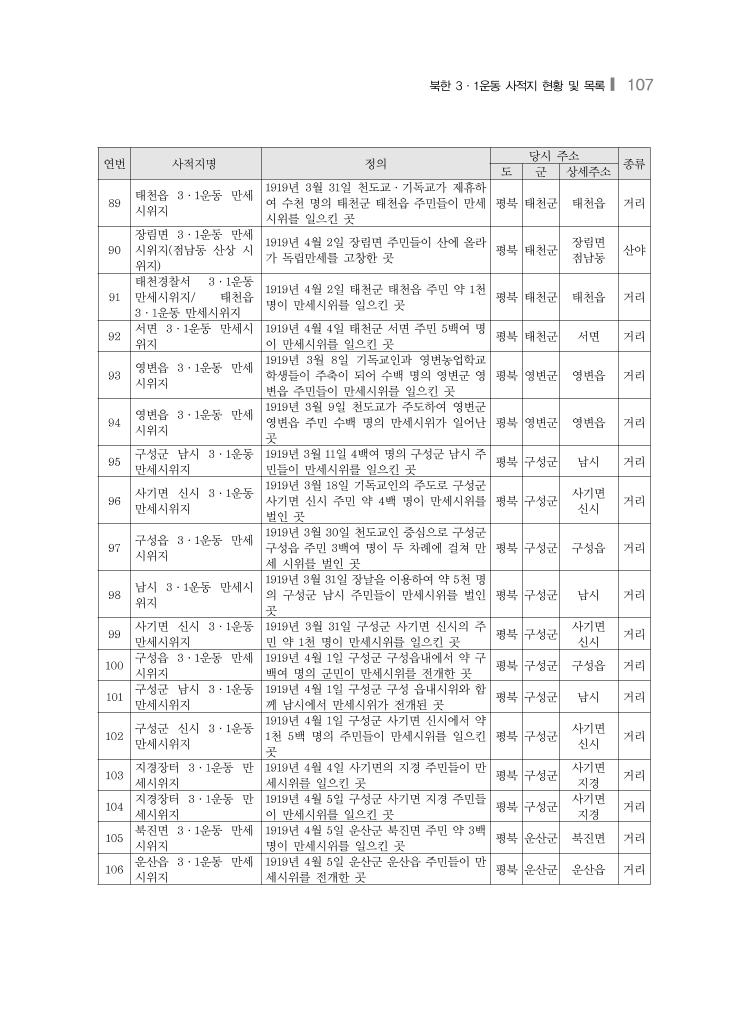 북한 3·1운동 사적지 현황 및 목록❙ 107 연번 사적지명 정의 당시 주소 종류 도 군 상세주소 89 태천읍 3·1운동 만세 시위지 1919년 3월 31일 천도교·기독교가 제휴하 여 수천 명의 태천군 태천읍 주민들이 만세 시위를 일으킨 곳 평북 태천군 태천읍 거리 90 장림면 3·1운동 만세 시위지(점남동 산상 시 위지) 1919년 4월 2일 장림면 주민들이 산에 올라 가 독립만세를 고창한 곳 평북 태천군 장림면 점남동 산야 91 태천경찰서 3·1운동 만세시위지/ 태천읍 3·1운동 만세시위지 1919년 4월 2일 태천군 태천읍 주민 약 1천 명이 만세시위를 일으킨 곳 평북 태천군 태천읍 거리 92 서면 3·1운동 만세시 위지 1919년 4월 4일 태천군 서면 주민 5백여 명 이 만세시위를 일으킨 곳 평북 태천군 서면 거리 93 영변읍 3·1운동 만세 시위지 1919년 3월 8일 기독교인과 영변농업학교 학생들이 주축이 되어 수백 명의 영변군 영 변읍 주민들이 만세시위를 일으킨 곳 평북 영변군 영변읍 거리 94 영변읍 3·1운동 만세 시위지 1919년 3월 9일 천도교가 주도하여 영변군 영변읍 주민 수백 명의 만세시위가 일어난 곳 평북 영변군 영변읍 거리 95 구성군 남시 3·1운동 만세시위지 1919년 3월 11일 4백여 명의 구성군 남시 주 민들이 만세시위를 일으킨 곳 평북 구성군 남시 거리 96 사기면 신시 3·1운동 만세시위지 1919년 3월 18일 기독교인의 주도로 구성군 사기면 신시 주민 약 4백 명이 만세시위를 벌인 곳 평북 구성군 사기면 신시 거리 97 구성읍 3·1운동 만세 시위지 1919년 3월 30일 천도교인 중심으로 구성군 구성읍 주민 3백여 명이 두 차례에 걸쳐 만 세 시위를 벌인 곳 평북 구성군 구성읍 거리 98 남시 3·1운동 만세시 위지 1919년 3월 31일 장날을 이용하여 약 5천 명 의 구성군 남시 주민들이 만세시위를 벌인 곳 평북 구성군 남시 거리 99 사기면 신시 3·1운동 만세시위지 1919년 3월 31일 구성군 사기면 신시의 주 민 약 1천 명이 만세시위를 일으킨 곳 평북 구성군 사기면 신시 거리 100 구성읍 3·1운동 만세 시위지 1919년 4월 1일 구성군 구성읍내에서 약 구 백여 명의 군민이 만세시위를 전개한 곳 평북 구성군 구성읍 거리 101 구성군 남시 3·1운동 만세시위지 1919년 4월 1일 구성군 구성 읍내시위와 함 께 남시에서 만세시위가 전개된 곳 평북 구성군 남시 거리 102 구성군 신시 3·1운동 만세시위지 1919년 4월 1일 구성군 사기면 신시에서 약 1천 5백 명의 주민들이 만세시위를 일으킨 곳 평북 구성군 사기면 신시 거리 103 지경장터 3·1운동 만 세시위지 1919년 4월 4일 사기면의 지경 주민들이 만 세시위를 일으킨 곳 평북 구성군 사기면 지경 거리 104 지경장터 3·1운동 만 세시위지 1919년 4월 5일 구성군 사기면 지경 주민들 이 만세시위를 일으킨 곳 평북 구성군 사기면 지경 거리 105 북진면 3·1운동 만세 시위지 1919년 4월 5일 운산군 북진면 주민 약 3백 명이 만세시위를 일으킨 곳 평북 운산군 북진면 거리 106 운산읍 3·1운동 만세 시위지 1919년 4월 5일 운산군 운산읍 주민들이 만 세시위를 전개한 곳 평북 운산군 운산읍 거리