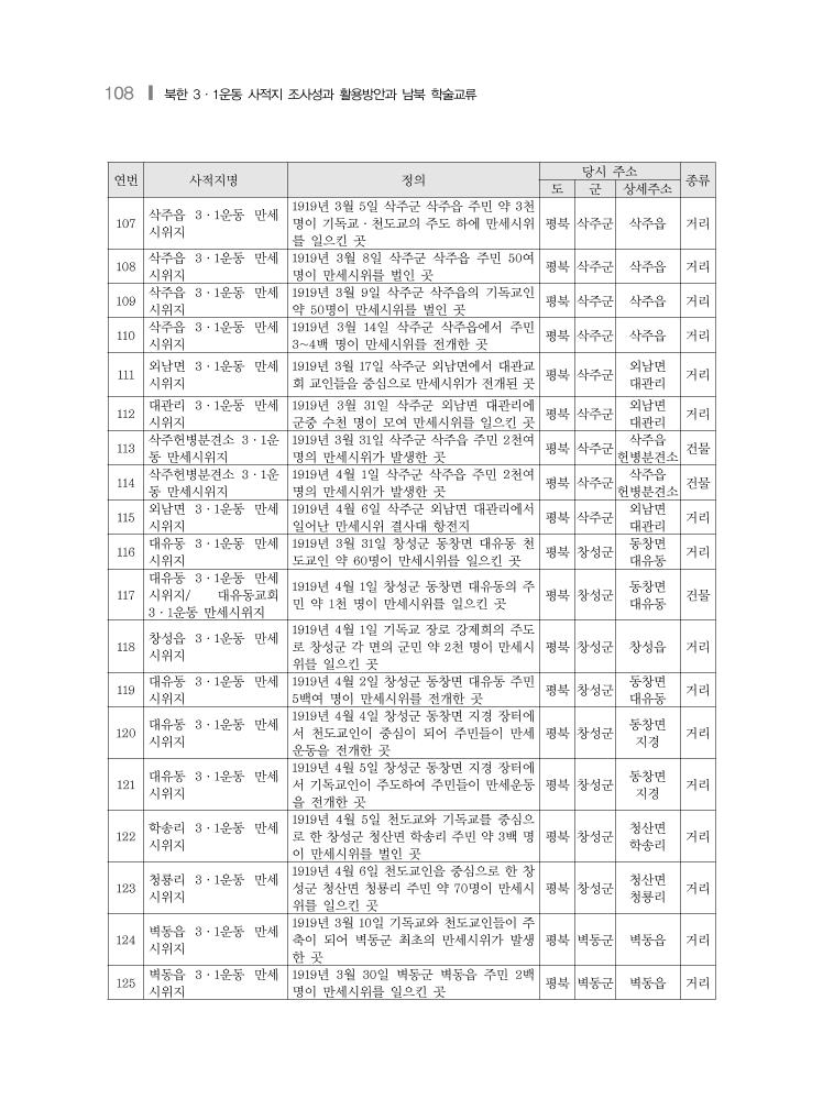 108 ❙ 북한 3·1운동 사적지 조사성과 활용방안과 남북 학술교류 연번 사적지명 정의 당시 주소 종류 도 군 상세주소 107 삭주읍 3·1운동 만세 시위지 1919년 3월 5일 삭주군 삭주읍 주민 약 3천 명이 기독교·천도교의 주도 하에 만세시위 를 일으킨 곳 평북 삭주군 삭주읍 거리 108 삭주읍 3·1운동 만세 시위지 1919년 3월 8일 삭주군 삭주읍 주민 50여 명이 만세시위를 벌인 곳 평북 삭주군 삭주읍 거리 109 삭주읍 3·1운동 만세 시위지 1919년 3월 9일 삭주군 삭주읍의 기독교인 약 50명이 만세시위를 벌인 곳 평북 삭주군 삭주읍 거리 110 삭주읍 3·1운동 만세 시위지 1919년 3월 14일 삭주군 삭주읍에서 주민 3~4백 명이 만세시위를 전개한 곳 평북 삭주군 삭주읍 거리 111 외남면 3·1운동 만세 시위지 1919년 3월 17일 삭주군 외남면에서 대관교 회 교인들을 중심으로 만세시위가 전개된 곳 평북 삭주군 외남면 대관리 거리 112 대관리 3·1운동 만세 시위지 1919년 3월 31일 삭주군 외남면 대관리에 군중 수천 명이 모여 만세시위를 일으킨 곳 평북 삭주군 외남면 대관리 거리 113 삭주헌병분견소 3·1운 동 만세시위지 1919년 3월 31일 삭주군 삭주읍 주민 2천여 명의 만세시위가 발생한 곳 평북 삭주군 삭주읍 헌병분견소 건물 114 삭주헌병분견소 3·1운 동 만세시위지 1919년 4월 1일 삭주군 삭주읍 주민 2천여 명의 만세시위가 발생한 곳 평북 삭주군 삭주읍 헌병분견소 건물 115 외남면 3·1운동 만세 시위지 1919년 4월 6일 삭주군 외남면 대관리에서 일어난 만세시위 결사대 항전지 평북 삭주군 외남면 대관리 거리 116 대유동 3·1운동 만세 시위지 1919년 3월 31일 창성군 동창면 대유동 천 도교인 약 60명이 만세시위를 일으킨 곳 평북 창성군 동창면 대유동 거리 117 대유동 3·1운동 만세 시위지/ 대유동교회 3·1운동 만세시위지 1919년 4월 1일 창성군 동창면 대유동의 주 민 약 1천 명이 만세시위를 일으킨 곳 평북 창성군 동창면 대유동 건물 118 창성읍 3·1운동 만세 시위지 1919년 4월 1일 기독교 장로 강제희의 주도 로 창성군 각 면의 군민 약 2천 명이 만세시 위를 일으킨 곳 평북 창성군 창성읍 거리 119 대유동 3·1운동 만세 시위지 1919년 4월 2일 창성군 동창면 대유동 주민 5백여 명이 만세시위를 전개한 곳 평북 창성군 동창면 대유동 거리 120 대유동 3·1운동 만세 시위지 1919년 4월 4일 창성군 동창면 지경 장터에 서 천도교인이 중심이 되어 주민들이 만세 운동을 전개한 곳 평북 창성군 동창면 지경 거리 121 대유동 3·1운동 만세 시위지 1919년 4월 5일 창성군 동창면 지경 장터에 서 기독교인이 주도하여 주민들이 만세운동 을 전개한 곳 평북 창성군 동창면 지경 거리 122 학송리 3·1운동 만세 시위지 1919년 4월 5일 천도교와 기독교를 중심으 로 한 창성군 청산면 학송리 주민 약 3백 명 이 만세시위를 벌인 곳 평북 창성군 청산면 학송리 거리 123 청룡리 3·1운동 만세 시위지 1919년 4월 6일 천도교인을 중심으로 한 창 성군 청산면 청룡리 주민 약 70명이 만세시 위를 일으킨 곳 평북 창성군 청산면 청룡리 거리 124 벽동읍 3·1운동 만세 시위지 1919년 3월 10일 기독교와 천도교인들이 주 축이 되어 벽동군 최초의 만세시위가 발생 한 곳 평북 벽동군 벽동읍 거리 125 벽동읍 3·1운동 만세 시위지 1919년 3월 30일 벽동군 벽동읍 주민 2백 명이 만세시위를 일으킨 곳 평북 벽동군 벽동읍 거리