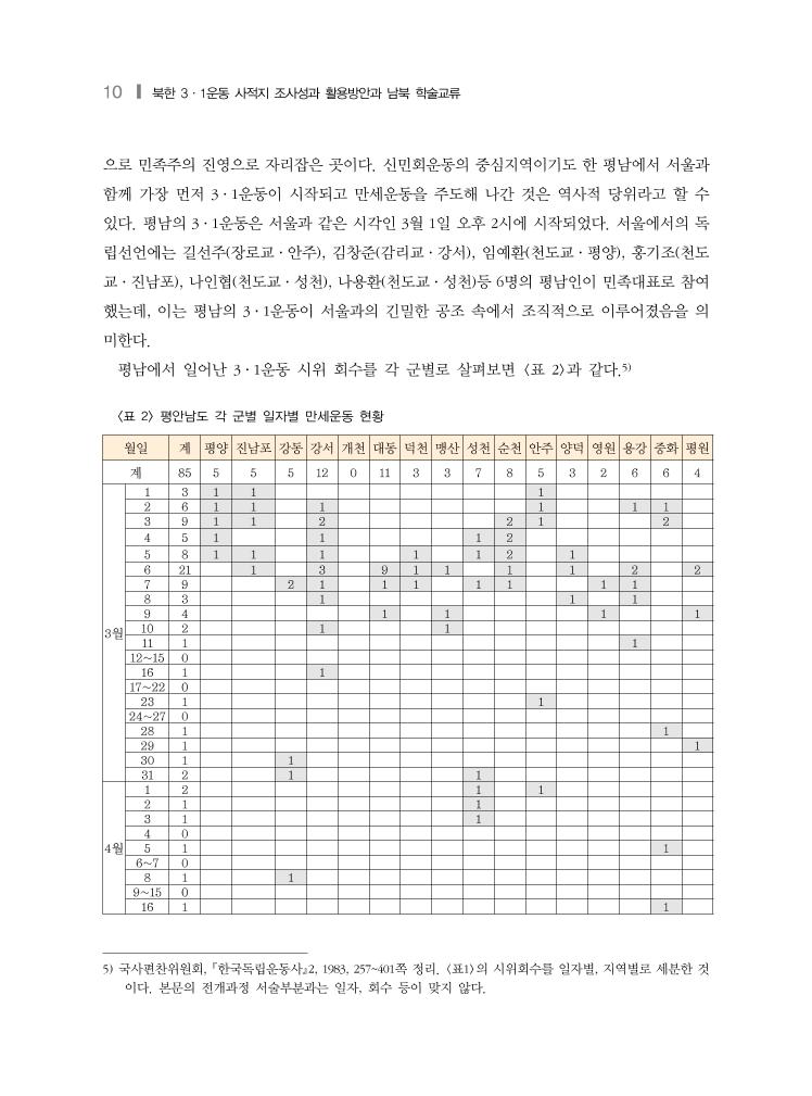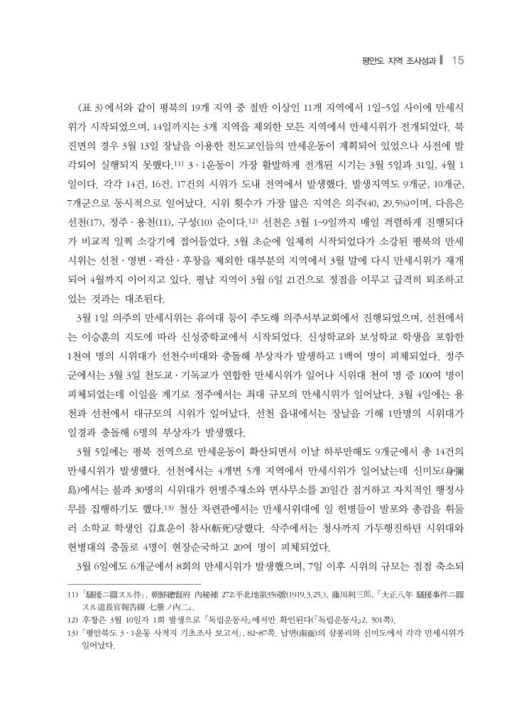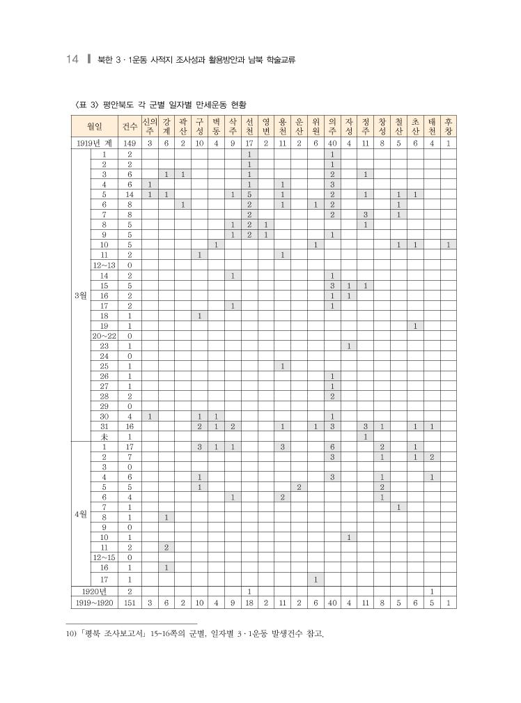 14 ❙ 북한 3·1운동 사적지 조사성과 활용방안과 남북 학술교류 <표 3> 평안북도 각 군별 일자별 만세운동 현황 월일 건수 신의 주 강 계 곽 산 구 성 벽 동 삭 주 선 천 영 변 용 천 운 산 위 원 의 주 자 성 정 주 창 성 철 산 초 산 태 천 후 창 1919년 계 149 3 6 2 10 4 9 17 2 11 2 6 40 4 11 8 5 6 4 1 3월 1 2 1 1 2 2 1 1 3 6 1 1 1 2 1 4 6 1 1 1 3 5 14 1 1 1 5 1 2 1 1 1 6 8 1 2 1 1 2 1 7 8 2 2 3 1 8 5 1 2 1 1 9 5 1 2 1 1 10 5 1 1 1 1 1 11 2 1 1 12~13 0 14 2 1 1 15 5 3 1 1 16 2 1 1 17 2 1 1 18 1 1 19 1 1 20~22 0 23 1 1 24 0 25 1 1 26 1 1 27 1 1 28 2 2 29 0 30 4 1 1 1 1 31 16 2 1 2 1 1 3 3 1 1 1 未 1 1 4월 1 17 3 1 1 3 6 2 1 2 7 3 1 1 2 3 0 4 6 1 3 1 1 5 5 1 2 2 6 4 1 2 1 7 1 1 8 1 1 9 0 10 1 1 11 2 2 12~15 0 16 1 1 17 1 1 1920년 2 1 1 1919~1920 151 3 6 2 10 4 9 18 2 11 2 6 40 4 11 8 5 6 5 1 10) 「평북 조사보고서」 15~16쪽의 군별, 일자별 3·1운동 발생건수 참고.