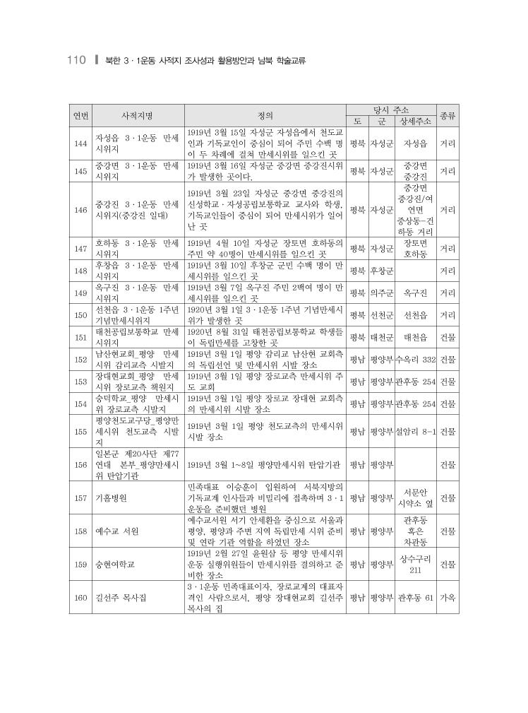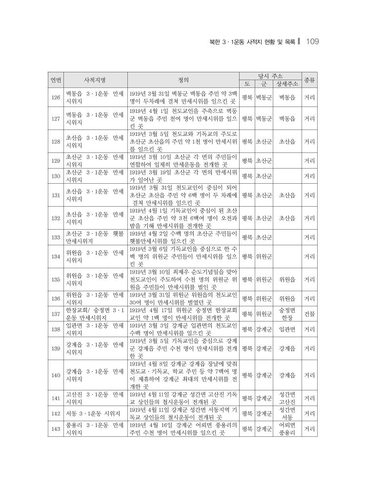 북한 3·1운동 사적지 현황 및 목록❙ 109 연번 사적지명 정의 당시 주소 종류 도 군 상세주소 126 벽동읍 3·1운동 만세 시위지 1919년 3월 31일 벽동군 벽동읍 주민 약 3백 명이 두차례에 걸쳐 만세시위를 일으킨 곳 평북 벽동군 벽동읍 거리 127 벽동읍 3·1운동 만세 시위지 1919년 4월 1일 천도교인을 주축으로 벽동 군 벽동읍 주민 천여 명이 만세시위를 일으 킨 곳 평북 벽동군 벽동읍 거리 128 초산읍 3·1운동 만세 시위지 1919년 3월 5일 천도교와 기독교의 주도로 초산군 초산읍의 주민 약 1천 명이 만세시위 를 일으킨 곳 평북 초산군 초산읍 거리 129 초산군 3·1운동 만세 시위지 1919년 3월 10일 초산군 각 면의 주민들이 연합하여 일제히 만세운동을 전개한 곳 평북 초산군 거리 130 초산군 3·1운동 만세 시위지 1919년 3월 19일 초산군 각 면의 만세시위 가 일어난 곳 평북 초산군 거리 131 초산읍 3·1운동 만세 시위지 1919년 3월 31일 천도교인이 중심이 되어 초산군 초산읍 주민 약 6백 명이 두 차례에 걸쳐 만세시위를 일으킨 곳 평북 초산군 초산읍 거리 132 초산읍 3·1운동 만세 시위지 1919년 4월 1일 기독교인이 중심이 된 초산 군 초산읍 주민 약 3천 6백여 명이 오전과 밤을 기해 만세시위를 전개한 곳 평북 초산군 초산읍 거리 133 초산군 3·1운동 횃불 만세시위지 1919년 4월 2일 수백 명의 초산군 주민들이 횃불만세시위를 일으킨 곳 평북 초산군 거리 134 위원읍 3·1운동 만세 시위지 1919년 3월 6일 기독교인을 중심으로 한 수 백 명의 위원군 주민들이 만세시위를 일으 킨 곳 평북 위원군 거리 135 위원읍 3·1운동 만세 시위지 1919년 3월 10일 최제우 순도기념일을 맞아 천도교인이 주도하여 수천 명의 위원군 위 원읍 주민들이 만세시위를 벌인 곳 평북 위원군 위원읍 거리 136 위원읍 3·1운동 만세 시위지 1919년 3월 31일 위원군 위원읍의 천도교인 30여 명이 만세시위를 벌였던 곳 평북 위원군 위원읍 거리 137 한장교회/ 숭정면 3·1 운동 만세시위지 1919년 4월 17일 위원군 숭정면 한장교회 교인 약 1백 명이 만세시위를 전개한 곳 평북 위원군 숭정면 한장 건물 138 입관면 3·1운동 만세 시위지 1919년 3월 3일 강계군 입관면의 천도교인 수백 명이 만세시위를 일으킨 곳 평북 강계군 입관면 거리 139 강계읍 3·1운동 만세 시위지 1919년 3월 5일 기독교인을 중심으로 강계 군 강계읍 주민 수천 명이 만세시위를 전개 한 곳 평북 강계군 강계읍 거리 140 강계읍 3·1운동 만세 시위지 1919년 4월 8일 강계군 강계읍 장날에 맞춰 천도교·기독교, 학교 주민 등 약 7백여 명 이 제휴하여 강계군 최대의 만세시위를 전 개한 곳 평북 강계군 강계읍 거리 141 고산진 3·1운동 만세 시위지 1919년 4월 11일 강계군 성간면 고산진 기독 교 상인들의 철시운동이 전개된 곳 평북 강계군 성간면 고산진 거리 142 서동 3·1운동 시위지 1919년 4월 11일 강계군 성간면 서동지역 기 독교 상인들의 철시운동이 전개된 곳 평북 강계군 성간면 서동 거리 143 풍용리 3·1운동 만세 시위지 1919년 4월 16일 강계군 어뢰면 풍용리의 주민 수천 명이 만세시위를 일으킨 곳 평북 강계군 어뢰면 풍용리 거리