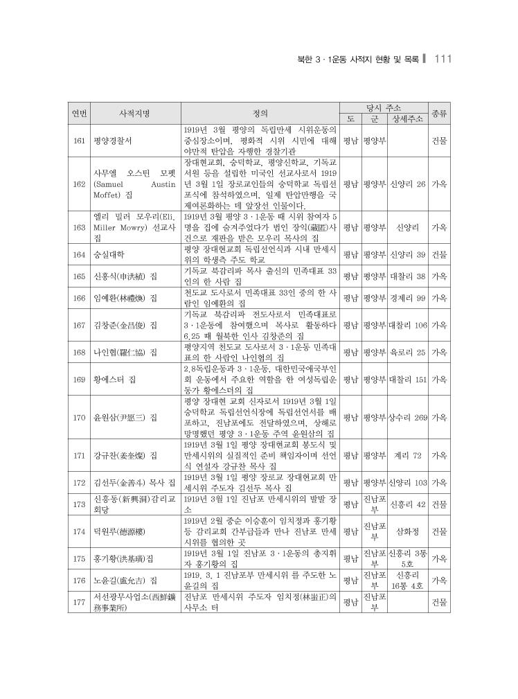 북한 3·1운동 사적지 현황 및 목록❙ 111 연번 사적지명 정의 당시 주소 종류 도 군 상세주소 161 평양경찰서 1919년 3월 평양의 독립만세 시위운동의 중심장소이며, 평화적 시위 시민에 대해 야만적 탄압을 자행한 경찰기관 평남 평양부 건물 162 사무엘 오스틴 모펫 (Samuel Austin Moffet) 집 장대현교회, 숭덕학교, 평양신학교, 기독교 서원 등을 설립한 미국인 선교사로서 1919 년 3월 1일 장로교인들의 숭덕학교 독립선 포식에 참석하였으며, 일제 탄압만행을 국 제여론화하는 데 앞장선 인물이다. 평남 평양부 신양리 26 가옥 163 엘리 밀러 모우리(Eli. Miller Mowry) 선교사 집 1919년 3월 평양 3·1운동 때 시위 참여자 5 명을 집에 숨겨주었다가 범인 장익(藏匿)사 건으로 재판을 받은 모우리 목사의 집 평남 평양부 신양리 가옥 164 숭실대학 평양 장대현교회 독립선언식과 시내 만세시 위의 학생측 주도 학교 평남 평양부 신양리 39 건물 165 신홍식(申洪植) 집 기독교 북감리파 목사 출신의 민족대표 33 인의 한 사람 집 평남 평양부 대찰리 38 가옥 166 임예환(林禮煥) 집 천도교 도사로서 민족대표 33인 중의 한 사 람인 임예환의 집 평남 평양부 경제리 99 가옥 167 김창준(金昌俊) 집 기독교 북감리파 전도사로서 민족대표로 3·1운동에 참여했으며 목사로 활동하다 6.25 때 월북한 인사 김창준의 집 평남 평양부대찰리 106 가옥 168 나인협(羅仁協) 집 평양지역 천도교 도사로서 3·1운동 민족대 표의 한 사람인 나인협의 집 평남 평양부 육로리 25 가옥 169 황에스터 집 2.8독립운동과 3·1운동, 대한민국애국부인 회 운동에서 주요한 역할을 한 여성독립운 동가 황에스더의 집 평남 평양부 대찰리 151 가옥 170 윤원삼(尹愿三) 집 평양 장대현 교회 신자로서 1919년 3월 1일 숭덕학교 독립선언식장에 독립선언서를 배 포하고, 진남포에도 전달하였으며, 상해로 망명했던 평양 3·1운동 주역 윤원삼의 집 평남 평양부상수리 269 가옥 171 강규찬(姜奎燦) 집 1919년 3월 1일 평양 장대현교회 봉도식 및 만세시위의 실질적인 준비 책임자이며 선언 식 연설자 강규찬 목사 집 평남 평양부 계리 72 가옥 172 김선두(金善斗) 목사 집 1919년 3월 1일 평양 장로교 장대현교회 만 세시위 주도자 김선두 목사 집 평남 평양부신양리 103 가옥 173 신흥동(新興洞)감리교 회당 1919년 3월 1일 진남포 만세시위의 발발 장 소 평남 진남포 부 신흥리 42 건물 174 덕원루(德源樓) 1919년 2월 중순 이승훈이 임치정과 홍기황 등 감리교회 간부급들과 만나 진남포 만세 시위를 협의한 곳 평남 진남포 부 삼화정 건물 175 홍기황(洪基璜)집 1919년 3월 1일 진남포 3·1운동의 총지휘 자 홍기황의 집 평남 진남포 부 신흥리 3통 5호 가옥 176 노윤길(盧允吉) 집 1919. 3. 1 진남포부 만세시위 를 주도한 노 윤길의 집 평남 진남포 부 신흥리 16통 4호 가옥 177 서선광무사업소(西鮮鑛 務事業所) 진남포 만세시위 주도자 임치정(林蚩正)의 사무소 터 평남 진남포 부 건물