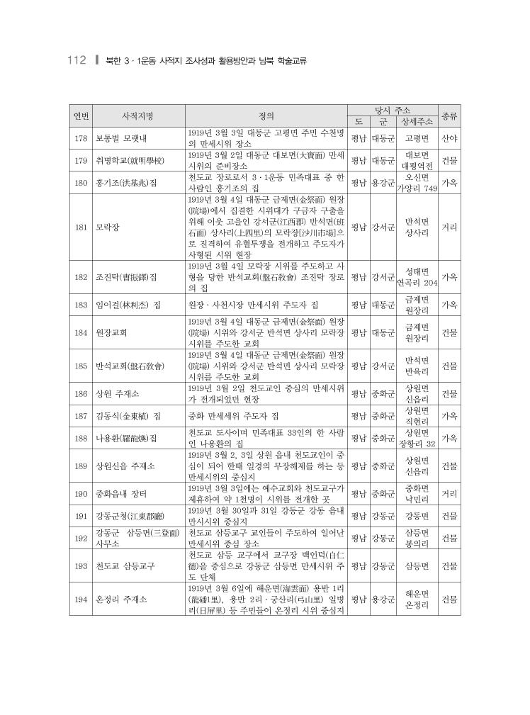 112 ❙ 북한 3·1운동 사적지 조사성과 활용방안과 남북 학술교류 연번 사적지명 정의 당시 주소 종류 도 군 상세주소 178 보통벌 모랫내 1919년 3월 3일 대동군 고평면 주민 수천명 의 만세시위 장소 평남 대동군 고평면 산야 179 취명학교(就明學校) 1919년 3월 2일 대동군 대보면(大寶面) 만세 시위의 준비장소 평남 대동군 대보면 대평역전 건물 180 홍기조(洪基兆)집 천도교 장로로서 3·1운동 민족대표 중 한 사람인 홍기조의 집 평남 용강군 오신면 가양리 749 가옥 181 모락장 1919년 3월 4일 대동군 금제면(金祭面) 원장 (院場)에서 집결한 시위대가 구금자 구출을 위해 이웃 고을인 강서군(江西郡) 반석면(班 石面) 상사리(上四里)의 모락장[沙川市場]으 로 진격하여 유혈투쟁을 전개하고 주도자가 사형된 시위 현장 평남 강서군 반석면 상사리 거리 182 조진탁(曺振鐸)집 1919년 3월 4일 모락장 시위를 주도하고 사 형을 당한 반석교회(盤石敎會) 조진탁 장로 의 집 평남 강서군 성태면 연곡리 204 가옥 183 임이걸(林利杰) 집 원장ㆍ사천시장 만세시위 주도자 집 평남 대동군 금제면 원장리 가옥 184 원장교회 1919년 3월 4일 대동군 금제면(金祭面) 원장 (院場) 시위와 강서군 반석면 상사리 모락장 시위를 주도한 교회 평남 대동군 금제면 원장리 건물 185 반석교회(盤石敎會) 1919년 3월 4일 대동군 금제면(金祭面) 원장 (院場) 시위와 강서군 반석면 상사리 모락장 시위를 주도한 교회 평남 강서군 반석면 반육리 건물 186 상원 주재소 1919년 3월 2일 천도교인 중심의 만세시위 가 전개되었던 현장 평남 중화군 상원면 신읍리 건물 187 김동식(金東植) 집 중화 만세세위 주도자 집 평남 중화군 상원면 직현리 가옥 188 나용환(羅龍煥)집 천도교 도사이며 민족대표 33인의 한 사람 인 나용환의 집 평남 중화군 상원면 장항리 32 가옥 189 상원신읍 주재소 1919년 3월 2, 3일 상원 읍내 천도교인이 중 심이 되어 한때 일경의 무장해제를 하는 등 만세시위의 중심지 평남 중화군 상원면 신읍리 건물 190 중화읍내 장터 1919년 3월 3일에는 예수교회와 천도교구가 제휴하여 약 1천명이 시위를 전개한 곳 평남 중화군 중화면 낙민리 거리 191 강동군청(江東郡廳) 1919년 3월 30일과 31일 강동군 강동 읍내 만시시위 중심지 평남 강동군 강동면 건물 192 강동군 삼등면(三登面) 사무소 천도교 삼등교구 교인들이 주도하여 일어난 만세시위 중심 장소 평남 강동군 삼등면 봉의리 건물 193 천도교 삼등교구 천도교 삼등 교구에서 교구장 백인덕(白仁 德)을 중심으로 강동군 삼등면 만세시위 주 도 단체 평남 강동군 삼등면 건물 194 온정리 주재소 1919년 3월 6일에 해운면(海雲面) 용반 1리 (龍磻1里), 용반 2리·궁산리(弓山里) 일병 리(日屛里) 등 주민들이 온정리 시위 중심지 평남 용강군 해운면 온정리 건물