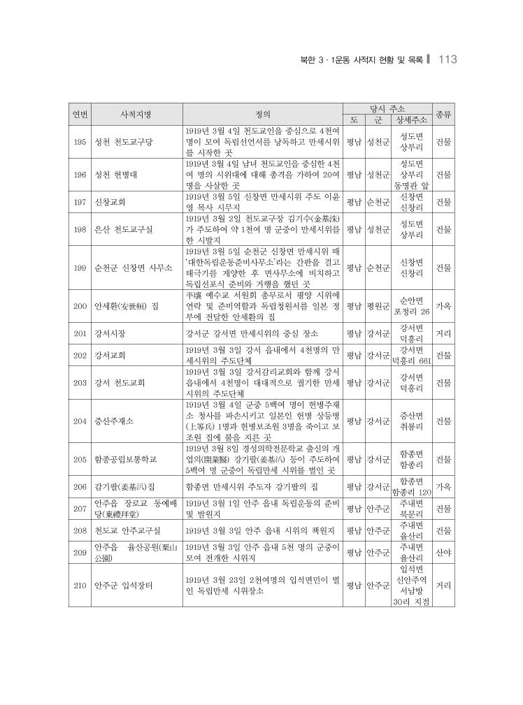 북한 3·1운동 사적지 현황 및 목록❙ 113 연번 사적지명 정의 당시 주소 종류 도 군 상세주소 195 성천 천도교구당 1919년 3월 4일 천도교인을 중심으로 4천여 명이 모여 독립선언서를 낭독하고 만세시위 를 시작한 곳 평남 성천군 성도면 상부리 건물 196 성천 헌병대 1919년 3월 4일 남녀 천도교인을 중심한 4천 여 명의 시위대에 대해 총격을 가하여 20여 명을 사살한 곳 평남 성천군 성도면 상부리 동명관 앞 건물 197 신창교회 1919년 3월 5일 신창면 만세시위 주도 이윤 영 목사 시무지 평남 순천군 신창면 신창리 건물 198 은산 천도교구실 1919년 3월 2일 천도교구장 김기수(金基洙) 가 주도하여 약 1천여 명 군중이 만세시위를 한 시발지 평남 성천군 성도면 상부리 건물 199 순천군 신창면 사무소 1919년 3월 5일 순천군 신창면 만세시위 때 ‘대한독립운동준비사무소’라는 간판을 걸고 태극기를 게양한 후 면사무소에 비치하고 독립선포식 준비와 거행을 했던 곳 평남 순천군 신창면 신창리 건물 200 안세환(安世桓) 집 平壤 예수교 서원회 총무로서 평양 시위에 연락 및 준비역할과 독립청원서를 일본 정 부에 전달한 안세환의 집 평남 평원군 순안면 포정리 26 가옥 201 강서시장 강서군 강서면 만세시위의 중심 장소 평남 강서군 강서면 덕흥리 거리 202 강서교회 1919년 3월 3일 강서 읍내에서 4천명의 만 세시위의 주도단체 평남 강서군 강서면 덕흥리 661 건물 203 강서 천도교회 1919년 3월 3일 강서감리교회와 함께 강서 읍내에서 4천명이 대대적으로 궐기한 만세 시위의 주도단체 평남 강서군 강서면 덕흥리 건물 204 증산주재소 1919년 3월 4일 군중 5백여 명이 헌병주재 소 청사를 파손시키고 일본인 헌병 상등병 (上等兵) 1명과 헌병보조원 3명을 죽이고 보 조원 집에 불을 지른 곳 평남 강서군 증산면 취룡리 건물 205 함종공립보통학교 1919년 3월 8일 경성의학전문학교 출신의 개 업의(開業醫) 강기팔(姜基汃) 등이 주도하여 5백여 명 군중이 독립만세 시위를 벌인 곳 평남 강서군 함종면 함종리 건물 206 감기팔(姜基汃)집 함종면 만세시위 주도자 강기팔의 집 평남 강서군 함종면 함종리 120 가옥 207 안주읍 장로교 동예배 당(東禮拜堂) 1919년 3월 1일 안주 읍내 독립운동의 준비 및 발원지 평남 안주군 주내면 북문리 건물 208 천도교 안주교구실 1919년 3월 3일 안주 읍내 시위의 책원지 평남 안주군 주내면 율산리 건물 209 안주읍 율산공원(栗山 公園) 1919년 3월 3일 안주 읍내 5천 명의 군중이 모여 전개한 시위지 평남 안주군 주내면 율산리 산야 210 안주군 입석장터 1919년 3월 23일 2천여명의 입석면민이 벌 인 독립만세 시위장소 평남 안주군 입석면 신안주역 서남방 30리 지점 거리