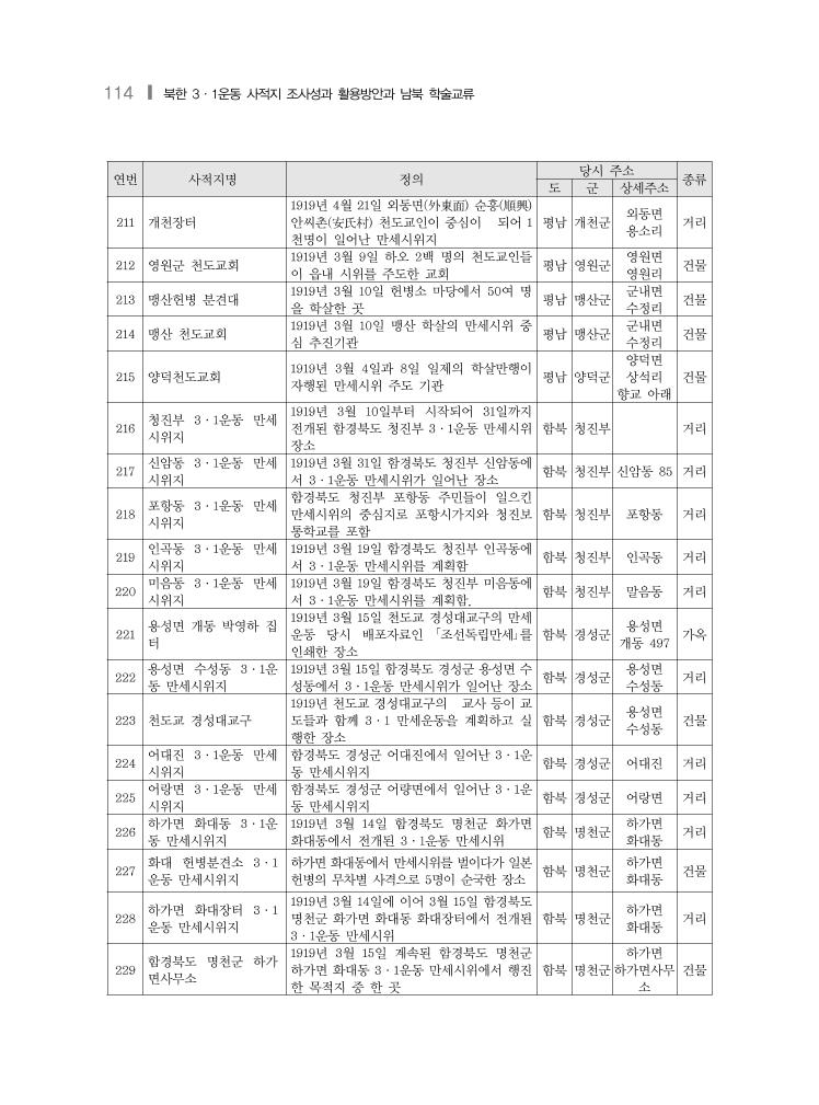 114 ❙ 북한 3·1운동 사적지 조사성과 활용방안과 남북 학술교류 연번 사적지명 정의 당시 주소 종류 도 군 상세주소 211 개천장터 1919년 4월 21일 외동면(外東面) 순흥(順興) 안씨촌(安氏村) 천도교인이 중심이 되어 1 천명이 일어난 만세시위지 평남 개천군 외동면 용소리 거리 212 영원군 천도교회 1919년 3월 9일 하오 2백 명의 천도교인들 이 읍내 시위를 주도한 교회 평남 영원군 영원면 영원리 건물 213 맹산헌병 분견대 1919년 3월 10일 헌병소 마당에서 50여 명 을 학살한 곳 평남 맹산군 군내면 수정리 건물 214 맹산 천도교회 1919년 3월 10일 맹산 학살의 만세시위 중 심 추진기관 평남 맹산군 군내면 수정리 건물 215 양덕천도교회 1919년 3월 4일과 8일 일제의 학살만행이 자행된 만세시위 주도 기관 평남 양덕군 양덕면 상석리 향교 아래 건물 216 청진부 3·1운동 만세 시위지 1919년 3월 10일부터 시작되어 31일까지 전개된 함경북도 청진부 3·1운동 만세시위 장소 함북 청진부 거리 217 신암동 3·1운동 만세 시위지 1919년 3월 31일 함경북도 청진부 신암동에 서 3·1운동 만세시위가 일어난 장소 함북 청진부 신암동 85 거리 218 포항동 3·1운동 만세 시위지 함경북도 청진부 포항동 주민들이 일으킨 만세시위의 중심지로 포항시가지와 청진보 통학교를 포함 함북 청진부 포항동 거리 219 인곡동 3·1운동 만세 시위지 1919년 3월 19일 함경북도 청진부 인곡동에 서 3·1운동 만세시위를 계획함 함북 청진부 인곡동 거리 220 미음동 3·1운동 만세 시위지 1919년 3월 19일 함경북도 청진부 미음동에 서 3·1운동 만세시위를 계획함. 함북 청진부 말음동 거리 221 용성면 개동 박영하 집 터 1919년 3월 15일 천도교 경성대교구의 만세 운동 당시 배포자료인 「조선독립만세」를 인쇄한 장소 함북 경성군 용성면 개동 497 가옥 222 용성면 수성동 3·1운 동 만세시위지 1919년 3월 15일 함경북도 경성군 용성면 수 성동에서 3·1운동 만세시위가 일어난 장소 함북 경성군 용성면 수성동 거리 223 천도교 경성대교구 1919년 천도교 경성대교구의 교사 등이 교 도들과 함께 3·1 만세운동을 계획하고 실 행한 장소 함북 경성군 용성면 수성동 건물 224 어대진 3·1운동 만세 시위지 함경북도 경성군 어대진에서 일어난 3·1운 동 만세시위지 함북 경성군 어대진 거리 225 어랑면 3·1운동 만세 시위지 함경북도 경성군 어량면에서 일어난 3·1운 동 만세시위지 함북 경성군 어랑면 거리 226 하가면 화대동 3·1운 동 만세시위지 1919년 3월 14일 함경북도 명천군 화가면 화대동에서 전개된 3·1운동 만세시위 함북 명천군 하가면 화대동 거리 227 화대 헌병분견소 3·1 운동 만세시위지 하가면 화대동에서 만세시위를 벌이다가 일본 헌병의 무차별 사격으로 5명이 순국한 장소 함북 명천군 하가면 화대동 건물 228 하가면 화대장터 3·1 운동 만세시위지 1919년 3월 14일에 이어 3월 15일 함경북도 명천군 화가면 화대동 화대장터에서 전개된 3·1운동 만세시위 함북 명천군 하가면 화대동 거리 229 함경북도 명천군 하가 면사무소 1919년 3월 15일 계속된 함경북도 명천군 하가면 화대동 3·1운동 만세시위에서 행진 한 목적지 중 한 곳 함북 명천군 하가면 하가면사무 소 건물
