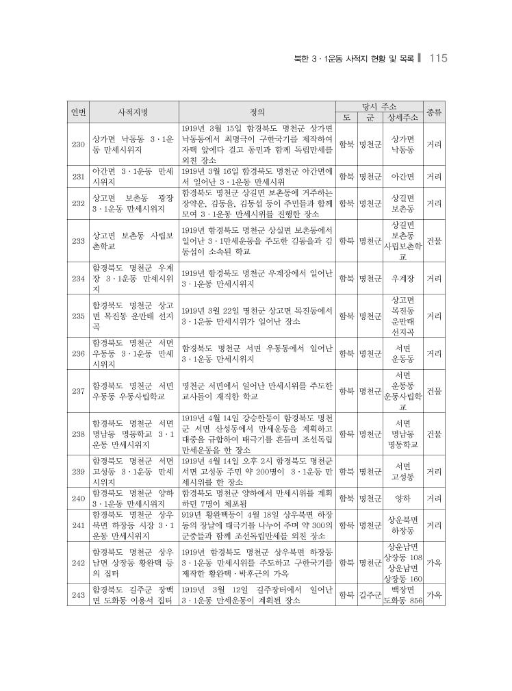북한 3·1운동 사적지 현황 및 목록❙ 115 연번 사적지명 정의 당시 주소 종류 도 군 상세주소 230 상가면 낙동동 3·1운 동 만세시위지 1919년 3월 15일 함경북도 명천군 상가면 낙동동에서 최명극이 구한국기를 제작하여 자택 앞에다 걸고 동민과 함께 독립만세를 외친 장소 함북 명천군 상가면 낙동동 거리 231 아간면 3·1운동 만세 시위지 1919년 3월 16일 함경북도 명천군 아간면에 서 일어난 3·1운동 만세시위 함북 명천군 아간면 거리 232 상고면 보촌동 광장 3·1운동 만세시위지 함경북도 명천군 상길면 보촌동에 거주하는 장약운, 김동을, 김동섭 등이 주민들과 함께 모여 3·1운동 만세시위를 진행한 장소 함북 명천군 상길면 보촌동 거리 233 상고면 보촌동 사립보 촌학교 1919년 함경북도 명천군 상실면 보촌동에서 일어난 3·1만세운동을 주도한 김동을과 김 동섭이 소속된 학교 함북 명천군 상길면 보촌동 사립보촌학 교 건물 234 함경북도 명천군 우계 장 3·1운동 만세시위 지 1919년 함경북도 명천군 우계장에서 일어난 3·1운동 만세시위지 함북 명천군 우계장 거리 235 함경북도 명천군 상고 면 목진동 운만태 선지 곡 1919년 3월 22일 명천군 상고면 목진동에서 3·1운동 만세시위가 일어난 장소 함북 명천군 상고면 목진동 운만태 선지곡 거리 236 함경북도 명천군 서면 우동동 3·1운동 만세 시위지 함경북도 명천군 서면 우동동에서 일어난 3·1운동 만세시위지 함북 명천군 서면 운동동 거리 237 함경북도 명천군 서면 우동동 우동사립학교 명천군 서면에서 일어난 만세시위를 주도한 교사들이 재직한 학교 함북 명천군 서면 운동동 운동사립학 교 건물 238 함경북도 명천군 서면 명남동 명동학교 3·1 운동 만세시위지 1919년 4월 14일 강승한등이 함경북도 명천 군 서면 산성동에서 만세운동을 계획하고 대중을 규합하여 태극기를 흔들며 조선독립 만세운동을 한 장소 함북 명천군 서면 명남동 명동학교 건물 239 함경북도 명천군 서면 고성동 3·1운동 만세 시위지 1919년 4월 14일 오후 2시 함경북도 명천군 서면 고성동 주민 약 200명이 3·1운동 만 세시위를 한 장소 함북 명천군 서면 고성동 거리 240 함경북도 명천군 양하 3·1운동 만세시위지 함경북도 명천군 양하에서 만세시위를 계획 하던 7명이 체포됨 함북 명천군 양하 거리 241 함경북도 명천군 상우 북면 하장동 시장 3·1 운동 만세시위지 919년 황완택등이 4월 18일 상우북면 하장 동의 장날에 태극기를 나누어 주며 약 300의 군중들과 함께 조선독립만세를 외친 장소 함북 명천군 상운북면 하장동 거리 242 함경북도 명천군 상우 남면 상장동 황완택 등 의 집터 1919년 함경북도 명천군 상우북면 하장동 3·1운동 만세시위를 주도하고 구한국기를 제작한 황완택·박후근의 가옥 함북 명천군 상운남면 상장동 108 상운남면 상장동 160 가옥 243 함경북도 길주군 장백 면 도화동 이용서 집터 1919년 3월 12일 길주장터에서 일어난 3·1운동 만세운동이 계획된 장소 함북 길주군 백장면 도화동 856 가옥