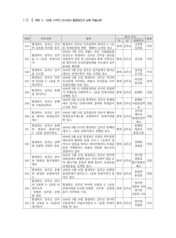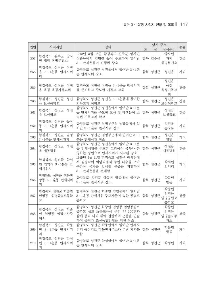 북한 3·1운동 사적지 현황 및 목록❙ 117 연번 사적지명 정의 당시 주소 종류 도 군 상세주소 257 함경북도 길주군 양사 면 재덕 헌병분견소 1919년 3월 16일 함경북도 길주군 양사면 신풍동에서 김병련 등이 주도하여 일어난 3·1만세운동이 진행된 장소 함북 길주군 양사면 재덕 헌병분견소 건물 258 함경북도 성진군 성진 읍 3·1운동 만세시위 터 함경북도 성진군 성진읍에서 일어난 3·1운 동 만세시위 장소 함북 성진군 성진읍 거리 259 함경북도 성진군 성진 읍 욱정 욱정기독교회 함경북도 성진군 성진읍 3·1운동 만세시위 를 준비하고 주도한 기독교 교회 함북 성진군 성진읍 욱정 욱정기독교 회 건물 260 함경북도 성진군 성진 읍 보신여학교 함경북도 성진군 성진읍 3·1운동에 참여한 기독교계 여학교 함북 성진군 성진읍 보신여학교 건물 261 함경북도 성진군 성진 읍 보신학교 함경북도 성진군 성진읍에서 일어난 3·1운 동 만세시위를 주도한 교사 및 학생들이 소 속된 기독교계 학교 함북 성진군 성진읍 보신학교 건물 262 함경북도 성진군 농장 동 3·1운동 만세시위 지 함경북도 성진군 임명부근의 농장동에서 일 어난 3·1운동 만세시위 장소 함북 성진군 성진읍 농장동 거리 263 함경북도 성진군 임명 3·1운동 만세시위지 함경북도 성진군 임명부근에서 일어난 3·1 운동 만세시위 장소 함북 성진군 성진읍 임명 거리 264 함경북도 성진군 성진 읍 제동병원 함경북도 성진군 성진읍에서 일어난 3·1운 동 만세시위를 주도한 그리어슨 목사가 운 영하는 병원으로 만세시위가 시작된 장소 함북 성진군 성진읍 재동병원 건물 265 함경북도 성진군 학서 면 업억리 3·1운동 만 세시위지 1919년 3월 11일 함경북도 성진군 학서면에 서 김승락이 억업리에서 주민 다수를 모아 구한국 국기를 앞세워 군중을 지휘하며 3·1만세운동을 전개함 함북 성진군 학서면 업억리 거리 266 함경북도 성진군 학동면 방동 3·1운동 만세시위 지 함경북도 성진군 학동면 방동에서 일어난 3·1운동 만세시위 장소 함북 성진군 학동면 방동 거리 267 함경북도 성진군 학중면 임명동 임명공립보통학 교 함경북도 성진군 학중면 임명동에서 일어난 3·1운동 만세시위 주도자들이 속한 공립보 통학교 함북 성진군 학중면 임명동 임명공립보 통학교 건물 268 함경북도 성진군 학중 면 임명동 임명순사주 재소 함경북도 성진군 학중면 임명동 임명공립보 통학교 생도 許學鳳등이 주민 약 200명과 함께 동리 다리 위에 집합하여 군중을 인솔 하여 몰려가 조선독립만세를 외친 장소 함북 성진군 학중면 임명동 임명순사주 재소 건물 269 함경북도 성진군 학동 면 3·1운동 만세시위 지 함경북도 성진군 학동면에서 일어난 만세시 위의 중심지로 학동면사무소와 주변 지역을 포함 함북 성진군 학동면 방동 거리 270 함경북도 성진군 학성 면 3·1운동 만세시위 지 함경북도 성진군 학성면에서 일어난 3·1운 동 만세시위 장소 함북 성진군 학성면 거리