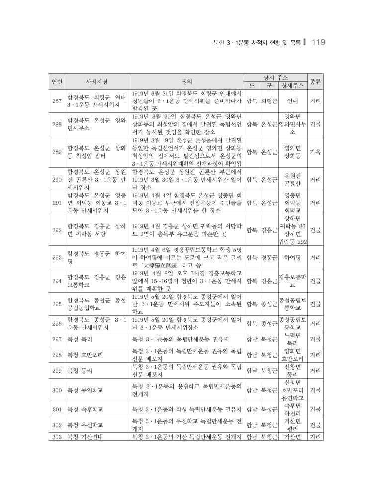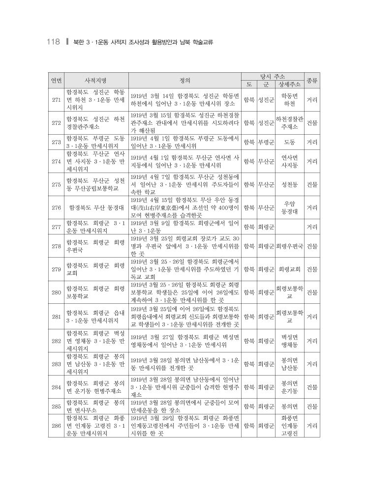북한 3·1운동 사적지 현황 및 목록❙ 119 연번 사적지명 정의 당시 주소 종류 도 군 상세주소 287 함경북도 회령군 연대 3·1운동 만세시위지 1919년 3월 31일 함경북도 회령군 연대에서 청년들이 3·1운동 만세시위를 준비하다가 발각된 곳 함북 회령군 연대 거리 288 함경북도 온성군 영와 면사무소 1919년 3월 20일 함경북도 온성군 영와면 상화동의 최성암의 집에서 발견된 독립선언 서가 등사된 것임을 확인한 장소 함북 온성군 영와면 영와면사무 소 건물 289 함경북도 온성군 상화 동 최성암 집터 1919년 3월 19일 온성군 온성읍에서 발견된 동일한 독립선언서가 온성군 영와면 상화동 최성암의 집에서도 발견됨으로서 온성군의 3·1운동 만세시위계획의 전개과정이 확인됨 함북 온성군 영와면 상화동 가옥 290 함경북도 온성군 상원 진 곤륜산 3·1운동 만 세시위지 함경북도 온성군 상원진 곤륜산 부근에서 1919년 3월 30일 3·1운동 만세시위가 일어 난 장소 함북 온성군 유원진 곤륜산 거리 291 함경북도 온성군 영충 면 회덕동 회동교 3·1 운동 만세시위지 1919년 4월 4일 함경북도 온성군 영충면 회 덕동 회동교 부근에서 전창우등이 주민들을 모아 3·1운동 만세시위를 한 장소 함북 온성군 영충면 회덕동 회덕교 거리 292 함경북도 경흥군 상하 면 귀락동 서당 1919년 4월 경흥군 상하면 귀락동의 서당학 도 2명이 총독부 유고문을 파손한 곳 함북 경흥군 상하면 귀락동 86 상하면 귀락동 292 건물 293 함경북도 경흥군 하여 평 1919년 4월 6일 경흥공립보통학교 학생 5명 이 하여평에 이르는 도로에 크고 작은 글씨 로‘大韓獨立萬歲’라고 씀 함북 경흥군 하여평 거리 294 함경북도 경흥군 경흥 보통학교 1919년 4월 8일 오후 7시경 경흥보통학교 앞에서 15~16명의 청년이 3·1운동 만세시 위를 계획한 곳 함북 경흥군 경흥보통학 교 건물 295 함경북도 종성군 종성 공립농업학교 1919년 5월 20일 함경북도 종성군에서 일어 난 3·1운동 만세시위 주도자들이 소속된 학교 함북 종성군 종성공립보 통학교 건물 296 함경북도 종성군 3·1 운동 만세시위지 1919년 5월 20일 함경북도 종성군에서 일어 난 3·1운동 만세시위장소 함북 종성군 종성공립보 통학교 거리 297 북청 북리 북청 3·1운동의 독립만세운동 권유지 함남 북청군 노덕면 북리 건물 298 북청 호만포리 북청 3·1운동의 독립만세운동 권유와 독립 신문 배포지 함남 북청군 양화면 호만포리 거리 299 북청 동리 북청 3·1운동의 독립만세운동 권유와 독립 신문 배포지 함남 북청군 신창면 동리 거리 300 북청 룡연학교 북청 3·1운동의 용연학교 독립만세운동의 전개지 함남 북청군 신창면 호만포리 용연학교 건물 301 북청 속후학교 북청 3·1운동의 학생 독립만세운동 권유지 함남 북청군 속후면 하천리 건물 302 북청 우신학교 북청 3·1운동의 우신학교 독립만세운동 전 개지 함남 북청군 거산면 평리 건물 303 북청 거산면내 북청 3·1운동의 거산 독립만세운동 전개지 함남 북청군 거산면 거리