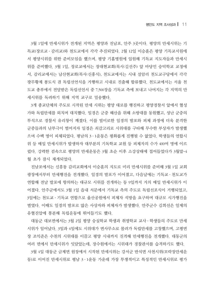 평안도 지역 조사성과❙ 11 3월 1일에 만세시위가 전개된 지역은 평양과 진남포, 안주 3곳이다. 평양의 만세시위는 기 독교(장로교·감리교)와 천도교에서 각각 추진되었다. 2월 12일 이승훈은 평양 기독교서원에 서 평양시위를 위한 준비모임을 했으며, 평양 기홀병원에 입원해 기독교 지도자들과 만세시 위를 준비했다. 3월 1일, 장로교에서는 장대현교회(목사:길선주) 앞 마당인 숭덕학교 교정에 서, 감리교에서는 남산현교회(목사:신홍식), 천도교에서는 시내 설암리 천도교구당에서 각각 광무황제 봉도식 겸 독립선언식을 거행하고 시내로 진출해 합류했다. 천도교에서는 서울 천 도교 총부에서 전달받은 독립선언서 중 7,500장을 기독교 측에 보내고 나머지는 각 지역의 만 세시위를 독려하기 위해 지역 교구로 밀송했다. 3개 종교단체의 주도로 시작된 만세 시위는 평양 대로를 행진하고 평양경찰서 앞에서 혈성 가와 독립만세를 외치며 대치했다. 일경은 군중 해산을 위해 소방대를 동원했고, 성난 군중의 투석으로 경찰서 유리창이 깨졌다. 이를 빌미로한 일경의 발포와 피체 과정에 더욱 분격한 군중들과의 난투극이 벌어지자 일경은 쇠갈고리로 시위대를 구타해 무수한 부상자가 발생했 으며 수백 명이 피체되었다. 평남의 3·1운동은 평화롭게 진행될 수 없었다. 학생들의 연합시 위 등 매일 만세시위가 발생하자 대부분의 기독학교 교원 등 피체자의 수가 400여 명에 이르 렀다. 강력한 검속으로 평양의 만세운동은 3월 초순 이후 소강상태에 접어들었다가 3월말~4 월 초가 잠시 재개되었다. 진남포에서는 신흥동 감리교회에서 이승훈의 지도로 미리 만세시위를 준비해 3월 1일 교회 광장에서부터 만세행진을 전개했다. 일경의 발포가 이어졌고, 다음날에는 기독교·천도교가 연합해 전날 발포에 항의하는 대규모 시위를 전개하는 등 9일까지 거의 매일 만세시위가 이 어졌다. 안주군에서도 3월 1일 읍내 서문에서 기독교 측의 주도로 독립선포식이 거행되었고, 3일에는 천도교·기독교 연합으로 율산공원에서 피체자 석방을 요구하며 대규모 시가행진을 벌였다. 이때도 일경의 발포로 많은 사상자와 피체자가 발생했다. 안주군수 김희선은 일제의 유혈진압에 통분해 독립운동에 뛰어들기도 했다. 대동군 대보면에서는 3월 2일 평양 숭실학교 학생과 취명학교 교사·학생들의 주도로 만세 시위가 일어났다. 3일과 4일에도 시위대가 면사무소로 몰려가 독립만세를 고창했으며, 고평면 장 조익준은 수천의 시위대를 이끌고 평양 시내까지 진격해 만세행진을 전개했다. 대동군의 여러 면에서 만세시위가 잇달았는데, 장수원에서는 시위대가 경찰관서를 습격하기도 했다. 3월 4일 대동군 금제면 원장에서 시작된 만세시위는 강서군 반석면 사천시위(모락장만세운 동)로 이어진 만세시위로 평남 3·1운동 가운데 가장 투쟁적이고 특징적인 만세시위로 평가
