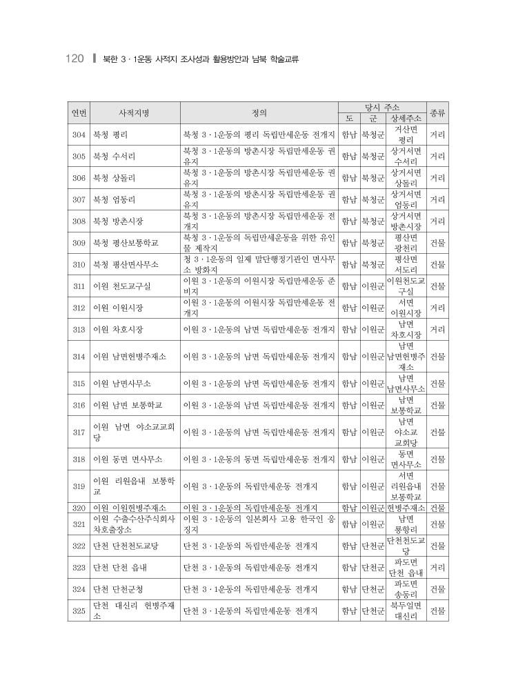 120 ❙ 북한 3·1운동 사적지 조사성과 활용방안과 남북 학술교류 연번 사적지명 정의 당시 주소 종류 도 군 상세주소 304 북청 평리 북청 3·1운동의 평리 독립만세운동 전개지 함남 북청군 거산면 평리 거리 305 북청 수서리 북청 3·1운동의 방촌시장 독립만세운동 권 유지 함남 북청군 상거서면 수서리 거리 306 북청 상돌리 북청 3·1운동의 방촌시장 독립만세운동 권 유지 함남 북청군 상거서면 상돌리 거리 307 북청 엄동리 북청 3·1운동의 방촌시장 독립만세운동 권 유지 함남 북청군 상거서면 엄동리 거리 308 북청 방촌시장 북청 3·1운동의 방촌시장 독립만세운동 전 개지 함남 북청군 상거서면 방촌시장 거리 309 북청 평산보통학교 북청 3·1운동의 독립만세운동을 위한 유인 물 제작지 함남 북청군 평산면 광천리 건물 310 북청 평산면사무소 청 3·1운동의 일제 말단행정기관인 면사무 소 방화지 함남 북청군 평산면 서도리 건물 311 이원 천도교구실 이원 3·1운동의 이원시장 독립만세운동 준 비지 함남 이원군 이원천도교 구실 건물 312 이원 이원시장 이원 3·1운동의 이원시장 독립만세운동 전 개지 함남 이원군 서면 이원시장 거리 313 이원 차호시장 이원 3·1운동의 남면 독립만세운동 전개지 함남 이원군 남면 차호시장 거리 314 이원 남면헌병주재소 이원 3·1운동의 남면 독립만세운동 전개지 함남 이원군 남면 남면헌병주 재소 건물 315 이원 남면사무소 이원 3·1운동의 남면 독립만세운동 전개지 함남 이원군 남면 남면사무소 건물 316 이원 남면 보통학교 이원 3·1운동의 남면 독립만세운동 전개지 함남 이원군 남면 보통학교 건물 317 이원 남면 야소교교회 당 이원 3·1운동의 남면 독립만세운동 전개지 함남 이원군 남면 야소교 교회당 건물 318 이원 동면 면사무소 이원 3·1운동의 동면 독립만세운동 전개지 함남 이원군 동면 면사무소 건물 319 이원 리원읍내 보통학 교 이원 3·1운동의 독립만세운동 전개지 함남 이원군 서면 리원읍내 보통학교 건물 320 이원 이원헌병주재소 이원 3·1운동의 독립만세운동 전개지 함남 이원군헌병주재소 건물 321 이원 수출수산주식회사 차호출장소 이원 3·1운동의 일본회사 고용 한국인 응 징지 함남 이원군 남면 룡항리 건물 322 단천 단천천도교당 단천 3·1운동의 독립만세운동 전개지 함남 단천군 단천천도교 당 건물 323 단천 단천 읍내 단천 3·1운동의 독립만세운동 전개지 함남 단천군 파도면 단천 읍내 거리 324 단천 단천군청 단천 3·1운동의 독립만세운동 전개지 함남 단천군 파도면 송동리 건물 325 단천 대신리 헌병주재 소 단천 3·1운동의 독립만세운동 전개지 함남 단천군 북두일면 대신리 건물