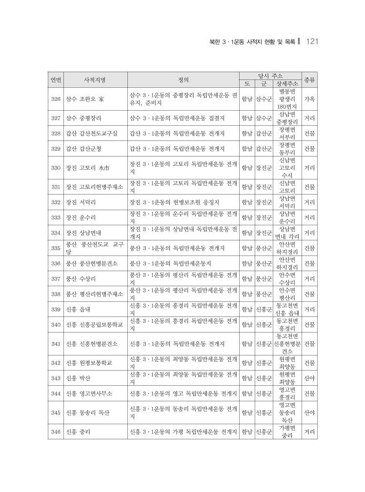 북한 3·1운동 사적지 현황 및 목록❙ 121 연번 사적지명 정의 당시 주소 종류 도 군 상세주소 326 삼수 조완오 家 삼수 3·1운동의 중평장리 독립만세운동 권 유지, 준비지 함남 삼수군 별동면 광생리 180번지 가옥 327 삼수 중평장리 삼수 3·1운동의 독립만세운동 집결지 함남 삼수군 삼남면 중평장리 거리 328 갑산 갑산천도교구실 갑산 3·1운동의 독립만세운동 전개지 함남 갑산군 장평면 서부리 건물 329 갑산 갑산군청 갑산 3·1운동의 독립만세운동 전개지 함남 갑산군 장평면 동부리 건물 330 장진 고토리 水市 장진 3·1운동의 고토리 독립만세운동 전개 지 함남 장진군 신남면 고토리 수시 거리 331 장진 고토리헌병주재소 장진 3·1운동의 고토리 독립만세운동 전개 지 함남 장진군 신남면 고토리 건물 332 장진 서덕리 장진 3·1운동의 헌병보조원 응징지 함남 장진군 상남면 서덕리 거리 333 장진 운수리 장진 3·1운동의 운수리 독립만세운동 전개 지 함남 장진군 상남면 운수리 거리 334 장진 상남면내 장진 3·1운동의 상남면내 독립만세운동 전 개지 함남 장진군 상남면 면내 각리 거리 335 풍산 풍산천도교 교구 당 풍산 3·1운동의 독립만세운동 전개지 함남 풍산군 안산면 하지경리 건물 336 풍산 풍산헌병분견소 풍산 3·1운동의 독립만세운동지 함남 풍산군 안산면 하지경리 건물 337 풍산 수상리 풍산 3·1운동의 펑산리 독립만세운동 전개 지 함남 풍산군 안수면 수상리 거리 338 풍산 평산리헌병주재소 풍산 3·1운동의 평산리 독립만세운동 전개 지 함남 풍산군 안수면 평산리 건물 339 신흥 읍내 신흥 3·1운동의 흥경리 독립만세운동 전개 지 함남 신흥군 동고천면 신흥 읍내 거리 340 신흥 신흥공립보통학교 신흥 3·1운동의 흥경리 독립만세운동 전개 지 함남 신흥군 동고천면 흥경리 건물 341 신흥 신흥헌병분견소 신흥 3·1운동의 독립만세운동 전개지 함남 신흥군 동고천면 신흥헌병분 견소 건물 342 신흥 원평보통학교 신흥 3·1운동의 최양동 독립만세운동 전개 지 함남 신흥군 원평면 최양동 건물 343 신흥 박산 신흥 3·1운동의 최양동 독립만세운동 전개 지 함남 신흥군 원평면 최양동 산야 344 신흥 영고면사무소 신흥 3·1운동의 영고 독립만세운동 전개지 함남 신흥군 영고면 흥경리 건물 345 신흥 동송리 독산 신흥 3·1운동의 동송리 독립만세운동 전개 지 함남 신흥군 영고면 동송리 독산 산야 346 신흥 중리 신흥 3·1운동의 가평 독립만세운동 전개지 함남 신흥군 가평면 중리 거리