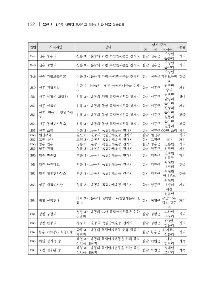 122 ❙ 북한 3·1운동 사적지 조사성과 활용방안과 남북 학술교류 연번 사적지명 정의 당시 주소 종류 도 군 상세주소 347 신흥 동흥리 신흥 3·1운동의 가평 독립만세운동 전개지 함남 신흥군 가평면 동흥리 거리 348 신흥 중양리 신흥 3·1운동의 가평 독립만세운동 전개지 함남 신흥군 가평면 중양리 거리 349 신흥 가평보통학교 신흥 3·1운동의 가평 독립만세운동 전개지 함남 신흥군 가평면 가평보통학 교 건물 350 신흥 원평시장 신흥 3·1운동의 원평 독립만세운동 전개 지 함남 신흥군 원평면 중리 거리 351 신흥 남평리 고당산 신흥 3·1운동의 원평 독립만세운동 전개지 함남 신흥군 원평면 남평리 산야 352 신흥 신성리 신흥 3·1운동의 동상 독립만세운동 전개지 함남 신흥군 동상면 신성리 거리 353 신흥 원풍리 헌병주재 소 신흥 3·1운동의 동상 독립만세운동 전개지 함남 신흥군 동상면 원풍리 건물 354 신흥 동상면사무소 신흥 3·1운동의 동상 독립만세운동 전개지 함남 신흥군 동상면 원풍리 건물 355 신흥 초리 신흥 3·1운동의 독립만세운동 전개지 함남 신흥군 OO면 초리 거리 356 원산부내 원산 3·1운동의 독립만세운동 전개지 함남 원산부 거리 357 고원 읍내 고원 3·1운동의 독립만세운동 전개지 함남 고원군 읍내 거리 358 영흥 인흥 영흥 3·1운동의 독립만세운동 전개지 함남 영흥군 인흥면 거리 359 영흥 진평 영흥 3·1운동의 독립만세운동 전개지 함남 영흥군 진평면 거리 360 영흥 진흥장 영흥 3·1운동의 독립만세운동 전개지 함남 영흥군 진평면 진흥장 거리 361 영흥 동흥학교 영흥 3·1운동의 독립만세운동 권유지 함남 영흥군 횡천면 대평리 건물 362 영흥 횡천면사무소 영흥 3·1운동의 독립만세운동 권유지 함남 영흥군 횡천면 면사무소 건물 363 영흥 대평리시장 영흥 3·1운동의 독립만세운동 권유지 함남 영흥군 횡천면 대평리 시장 거리 364 정평 선덕면내 정평 3·1운동의 선덕면내 독립만세운동 권 유지 함남 정평군 선덕면 구남리;흥 덕리;경흥 리 거리 365 정평 구창리 정평 3·1운동의 고산 독립만세운동을 위한 집결지 함남 정평군 고산면 구창리 거리 366 정평 한동리 정평 3·1운동의 독립만세운동 전개지 함남 정평군 OO면 한동리 거리 367 함흥 이화봉(이화봉) 家 함흥 3·1운동의 독립만세운동 권유 활동가 체포지 함남 함흥군 하기천면 상통리 거리 368 이원 정기옥 家 북청 3·1운동의 독립만세운동을 위해 독립 선언서 배포지 함남 이원군 서면 한당리 가옥 369 북청 김용완 家 북청 3·1운동의 독립만세운동을 위한 독립 선언서 배포지 함남 북청군 성대면 조양리 가옥