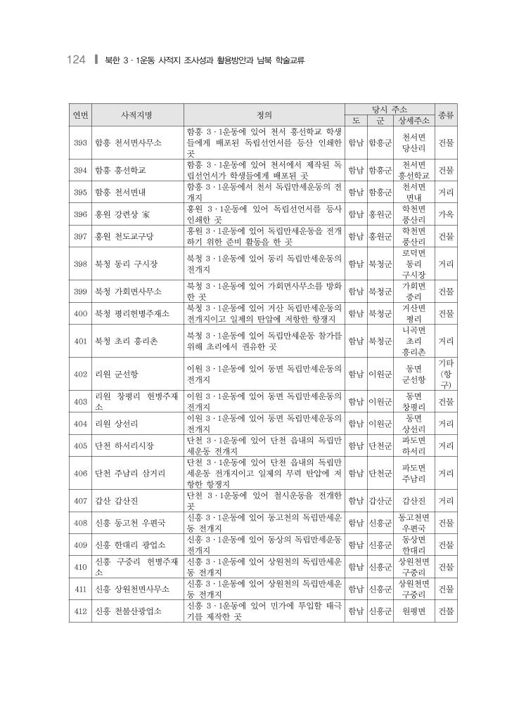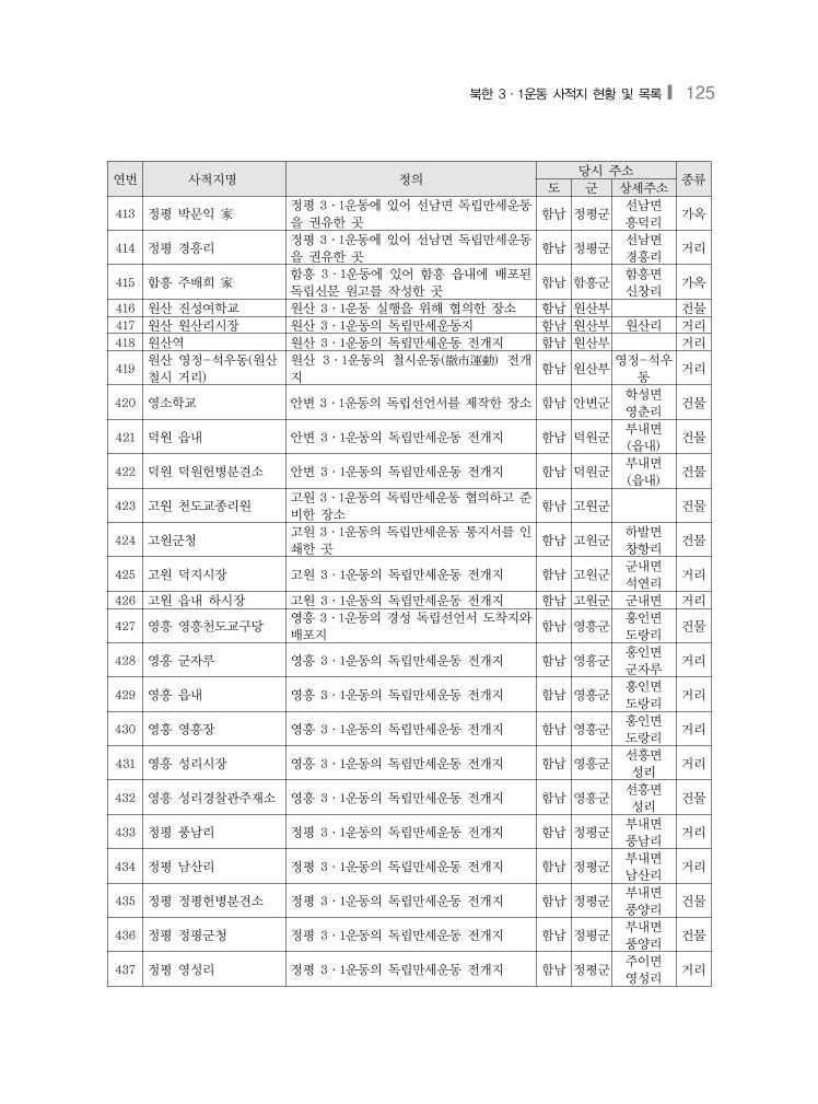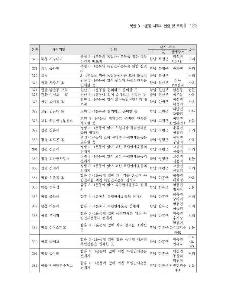 북한 3·1운동 사적지 현황 및 목록❙ 123 연번 사적지명 정의 당시 주소 종류 도 군 상세주소 370 북청 서장내리 북청 3·1운동의 독립만세운동을 위한 독립 선언서 배포지 함남 북청군 덕성면 서장내리 거리 371 북청 중와면 북청 3·1운동의 독립만세운동을 위한 집결 지 함남 북청군 중와면 거리 372 북청 3·1운동을 위한 독립운동자금 모금 활동지 함남 북청군 거리 373 원산 차광은 家 원산 3·1운동에 있어 원산의 독립선언서를 인쇄한 곳 함남 원산부 상동 193번지 가옥 374 원산 남촌동 교회 원산 3·1운동을 협의하고 준비한 곳 함남 원산부 남촌동 건물 375 원산 이성호 家 원산 3·1운동에 있어 순사보를 응징한 곳 함남 원산부 석우동 가옥 376 안변 강진성 家 안변 3·1운동에 있어 조선독립선언서의 배 포지 함남 안변군 학성면 학성리 가옥 377 고원 림근태 家 고원 3·1운동을 협의하고 준비한 곳 함남 고원군 하발면 조양리 가옥 378 고원 하발헌병분견소 고원 3·1운동을 협의하고 준비한 인사를 체포한 곳 함남 고원군 하발면 헌병분견소 건물 379 정평 상흥리 정평 3·1운동에 있어 초원시장 독립만세운 동의 집결지 함남 정평군 춘류면 상흥리 거리 380 정평 최도곤 家 평 3·1운동에 있어 선남면 독립만세운동을 권유한 곳 함남 정평군 선덕면 구남리 가옥 381 정평 신풍리 정평 3·1운동에 있어 고산 독립만세운동의 전개지 함남 정평군 고산면 신풍리 거리 382 정평 고산면사무소 정평 3·1운동에 있어 고산 독립만세운동의 전개지 함남 정평군 고산면 신풍리 건물 383 정평 신경리 정평 3·1운동에 있어 고산 독립만세운동의 전개지 함남 정평군 고산면 신경리 거리 384 함흥 석종점 家 함흥 3·1운동에 있어 태극기를 흔들며 독 립만세를 외친 독립만세운동 전개지 함남 함흥군 함흥면 대화정 가옥 385 함흥 정차장 함흥 3·1운동에 있어 독립만세운동의 전개 지 함남 함흥군 함흥면 정차장 건물 386 함흥 중하리 함흥 3·1운동의 독립만세운동의 전개지 함남 함흥군 함흥면 중하리 거리 387 함흥 하동리 함흥 3·1운동의 독립만세운동 전개지 함남 함흥군 함흥면 하동리 거리 388 함흥 우시장 함흥 3·1운동에 있어 독립만세를 외친 독 립만세운동의 전개지 함남 함흥군 함흥면 우시장 거리 389 함흥 심상소학교 함흥 3·1운동에 있어 학교 창고를 소각한 곳 함남 함흥군 함흥면 公立尋常小 學校 건물 390 함흥 만세교 함흥 3·1운동에 있어 함흥 읍내에 배포된 독립신문을 인쇄한 곳 함남 함흥군 함흥면 만세교 기타 (교 량) 391 함흥 동상리 함흥 3·1운동에 있어 덕천 독립만세운동 전개지 함남 함흥군 덕천면 동상리 거리 392 함흥 덕천헌병주재소 함흥 3·1운동에 있어 덕천 독립만세운동 전개지 함남 함흥군 덕천면 덕천헌병주 재소 건물