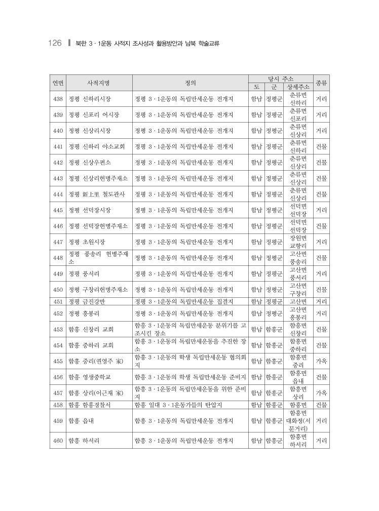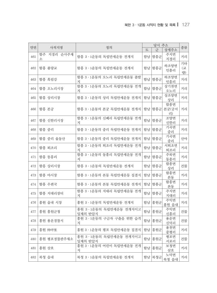 북한 3·1운동 사적지 현황 및 목록❙ 127 연번 사적지명 정의 당시 주소 종류 도 군 상세주소 461 함주 지경리 순사주재 소 함흥 3·1운동의 독립만세운동 전개지 함남 함흥군 주지면 지경리 거리 462 함흥 품량교 함흥 3·1운동의 독립만세운동 전개지 함남 함흥군 하조양면 인흥리 기타 (교 량) 463 함흥 흑림강 함흥 3·1운동의 오노리 독립만세운동 출발 지 함남 함흥군 하조양면 인흥리 거리 464 함흥 오노리시장 함흥 3·1운동의 오노리 독립만세운동 전개 지 함남 함흥군 상기천면 오노리 거리 465 함흥 상리시장 함흥 3·1운동의 상리 독립만세운동 전개지 함남 함흥군 상조양면 상리 거리 466 함흥 본궁 함흥 3·1운동의 본궁 독립만세운동 전개지 함남 함흥군 함흥면 본궁(궁서 리) 거리 467 함흥 신한리시장 함흥 3·1운동의 신폐리 독립만세운동 전개 지 함남 함흥군 조양면 신한리 거리 468 함흥 중리 함흥 3·1운동의 중리 독립만세운동 전개지 함남 함흥군 기곡면 중리 거리 469 함흥 중리 율동산 함흥 3·1운동의 중리 독립만세운동 전개지 함남 함흥군 기곡면 중리 산야 470 함흥 퇴조리 함흥 3·1운동의 퇴조리 독립만세운동 전개 지 함남 함흥군 서퇴조면 퇴조리 거리 471 함흥 동흥리 함흥 3·1운동의 동흥리 독립만세운동 전개 지 함남 함흥군 주북면 동흥리 거리 472 함흥 상리시장 함흥 3·1운동의 독립만세운동 전개지 함남 함흥군 함흥면 상리 건물 473 함흥 야시장 함흥 3·1운동의 본동 독립만세운동 집결지 함남 함흥군 함흥면 본동 거리 474 함흥 우편국 함흥 3·1운동의 본동 독립만세운동 전개지 함남 함흥군 함흥면 본동 거리 475 함흥 지대리장터 함흥 3·1운동의 지대리 독립만세운동 전개 지 함남 함흥군 주지면 지대리 거리 476 홍원 읍내 시장 홍원 3·1운동의 독립만세운동 전개지 함남 홍원군 주익면 홍원 읍내 거리 477 홍원 홍원군청 홍원 3·1운동의 독립만세운동 전개지이고 일제의 탄압지 함남 홍원군 주익면 신흥리 건물 478 홍원 용운경찰서 홍원 3·1운동의 구금자 구출을 위한 습격 지 함남 홍원군 용운면 신덕리 건물 479 홍원 仲坪里 홍원 3·1운동의 평포 독립만세운동 집결지 함남 홍원군 용천면 중평리 거리 480 홍원 평포경찰관주재소 홍원 3·1운동의 독립만세운동 전개지이고 일제의 탄압지 함남 홍원군 평포면 서포리 건물 481 홍원 삼호 홍원 3·1운동의 어린이 독립만세운동 전개 지 함남 홍원군 보청면 삼호 거리 482 북청 읍내 북청 3·1운동의 독립만세운동 전개지 함남 북청군 노덕면 북청 읍내 거리