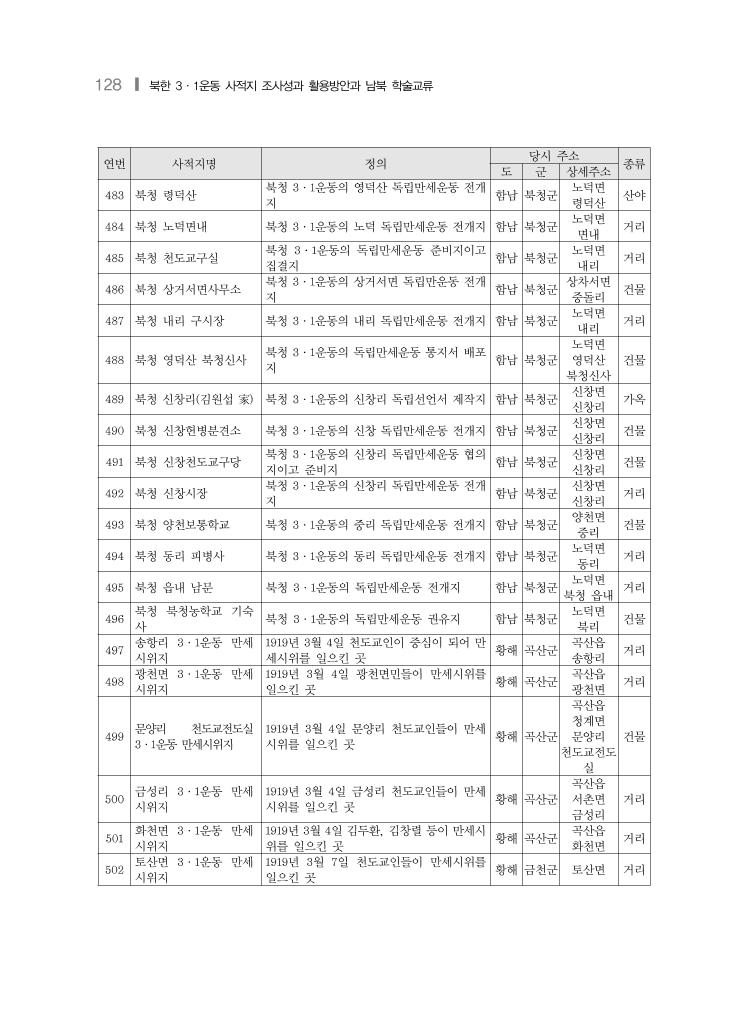 128 ❙ 북한 3·1운동 사적지 조사성과 활용방안과 남북 학술교류 연번 사적지명 정의 당시 주소 종류 도 군 상세주소 483 북청 령덕산 북청 3·1운동의 영덕산 독립만세운동 전개 지 함남 북청군 노덕면 령덕산 산야 484 북청 노덕면내 북청 3·1운동의 노덕 독립만세운동 전개지 함남 북청군 노덕면 면내 거리 485 북청 천도교구실 북청 3·1운동의 독립만세운동 준비지이고 집결지 함남 북청군 노덕면 내리 거리 486 북청 상거서면사무소 북청 3·1운동의 상거서면 독립만운동 전개 지 함남 북청군 상차서면 중돌리 건물 487 북청 내리 구시장 북청 3·1운동의 내리 독립만세운동 전개지 함남 북청군 노덕면 내리 거리 488 북청 영덕산 북청신사 북청 3·1운동의 독립만세운동 통지서 배포 지 함남 북청군 노덕면 영덕산 북청신사 건물 489 북청 신창리(김원섭 家) 북청 3·1운동의 신창리 독립선언서 제작지 함남 북청군 신창면 신창리 가옥 490 북청 신창헌병분견소 북청 3·1운동의 신창 독립만세운동 전개지 함남 북청군 신창면 신창리 건물 491 북청 신창천도교구당 북청 3·1운동의 신창리 독립만세운동 협의 지이고 준비지 함남 북청군 신창면 신창리 건물 492 북청 신창시장 북청 3·1운동의 신창리 독립만세운동 전개 지 함남 북청군 신창면 신창리 거리 493 북청 양천보통학교 북청 3·1운동의 중리 독립만세운동 전개지 함남 북청군 양천면 중리 건물 494 북청 동리 피병사 북청 3·1운동의 동리 독립만세운동 전개지 함남 북청군 노덕면 동리 거리 495 북청 읍내 남문 북청 3·1운동의 독립만세운동 전개지 함남 북청군 노덕면 북청 읍내 거리 496 북청 북청농학교 기숙 사 북청 3·1운동의 독립만세운동 권유지 함남 북청군 노덕면 북리 건물 497 송항리 3·1운동 만세 시위지 1919년 3월 4일 천도교인이 중심이 되어 만 세시위를 일으킨 곳 황해 곡산군 곡산읍 송항리 거리 498 광천면 3·1운동 만세 시위지 1919년 3월 4일 광천면민들이 만세시위를 일으킨 곳 황해 곡산군 곡산읍 광천면 거리 499 문양리 천도교전도실 3·1운동 만세시위지 1919년 3월 4일 문양리 천도교인들이 만세 시위를 일으킨 곳 황해 곡산군 곡산읍 청계면 문양리 천도교전도 실 건물 500 금성리 3·1운동 만세 시위지 1919년 3월 4일 금성리 천도교인들이 만세 시위를 일으킨 곳 황해 곡산군 곡산읍 서촌면 금성리 거리 501 화천면 3·1운동 만세 시위지 1919년 3월 4일 김두환, 김창렬 등이 만세시 위를 일으킨 곳 황해 곡산군 곡산읍 화천면 거리 502 토산면 3·1운동 만세 시위지 1919년 3월 7일 천도교인들이 만세시위를 일으킨 곳 황해 금천군 토산면 거리