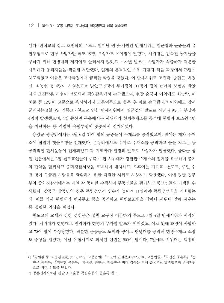 12 ❙ 북한 3·1운동 사적지 조사성과 활용방안과 남북 학술교류 된다. 반석교회 장로 조진탁의 주도로 일어난 원장~사천간 만세시위는 일군경과 군중들의 유 혈투쟁으로 현장 사망자만 해도 19명, 부상자도 40여명에 달했다. 시위대는 검속된 동지들을 구하기 위해 헌병대의 제지에도 물러서지 않았고 무차별 발포로 사망자가 속출하자 격분한 시위대가 총격자들을 색출해 처단했다. 일제의 본격적인 시위 가담자 색출 과정에서 78명이 체포되었고 이들은 조사과정에서 끔찍한 악형을 당했다. 이 만세시위로 조진탁, 송현근, 차정 신, 최능현 등 4명이 사형선고를 받았고 5명이 무기징역, 11명이 징역 15년의 중형을 받았 다.6) 조진탁은 사형이 언도되어 평양감옥에서 순국했으며, 현장 순국자 이외에도 최승탁, 이 혜준 등 12명이 고문으로 옥사하거나 고문여독으로 출옥 후 바로 순국했다.7) 이외에도 강서 군에서는 3월 3일 기독교·천도교 연합 만세시위에서 일군경의 발포로 사망자 9명과 부상자 4명이 발생했으며, 4일 증산면 구읍에서는 시위대가 헌병주재소를 공격해 헌병과 보조원 4명 을 처단하는 등 격렬한 유혈투쟁이 곳곳에서 전개되었다. 용강군 광량만에서는 3월 6일 천여 명의 군중들이 주재소를 공격했으며, 밤에는 재차 주재 소에 집결해 횃불투쟁을 전개했다. 온정리에서도 주야로 주재소를 공격하고 불을 지르는 등 공격적인 만세운동이 전개되었고 각 지역마다 일경의 발포로 사상자가 발생했다. 중화군 상 원 신읍에서는 2일 천도교인들이 주축이 된 시위대가 경찰관 주재소의 철거를 요구하며 총기 와 탄약을 탈취하고 중화경찰서장을 포박하며 대치하고, 오후에는 기독교·천도교, 주민 수 천 명이 구금된 사람들을 탈환하기 위한 격렬한 시위로 사상자가 발생했다. 이에 평양 경무 부와 중화경찰서에서는 매일 각 동네를 수색하며 주동인물을 검거하고 종교인들의 가택을 수 색했다. 강동군 삼등면의 경우 독립선언서 입수가 늦어져 11일에야 독립선언식을 개최했는 데, 이들 역시 헌병대와 면사무소 등을 공격하고 헌병보조원을 잡아다 시위대 앞에 세우는 등 맹렬한 양상을 띠었다. 천도교의 교세가 강한 성천군은 성천 교구장 이돈하의 주도로 3월 4일 만세시위가 시작되 었다. 시위대가 헌병대로 진격하자 헌병의 무차별 발포가 이어졌고, 이로 인해 28명이 사망하 고 70여 명이 부상당했다. 격분한 군중들도 도끼와 괭이로 헌병대를 공격해 헌병주재소 소장 도 중상을 입었다. 이날 유혈시위로 피체된 인원은 500여 명이다. 7일에도 시위대는 덕흥리 6) 「임원걸 등 14인 판결문」(1919.12.6., 고등법원), 「조진탁 판결문」(1922.9.28., 고등법원), 「차정신 공훈록」, 「송 현근 공훈록」, 「최능현 공훈록」. 차정신, 송현근, 최능현은 미리 검속을 피해 중국으로 망명했으며 궐석재판 으로 사형 언도를 받았다. 7) 공훈전자사료관 평남 3·1운동 독립유공자 공훈록 참조.