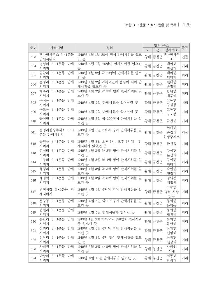 북한 3·1운동 사적지 현황 및 목록❙ 129 연번 사적지명 정의 당시 주소 종류 도 군 상세주소 503 백마면사무소 3·1운동 만세시위지 1919년 4월 1일 80여 명이 만세시위를 일으 킨 곳 황해 금천군 백마면사무 소 건물 504 명성리 3·1운동 만세 시위지 1919년 4월 2일 76명이 만세시위를 일으킨 곳 황해 금천군 백마면 명성리 거리 505 입암리 3·1운동 만세 시위지 1919년 4월 2일 약 70명이 만세시위를 일으 킨 곳 황해 금천군 백마면 입암리 거리 506 송정리 3·1운동 만세 시위지 1919년 4월 2일 기독교인이 중심이 되어 만 세시위를 일으킨 곳 황해 금천군 현내면 송정리 거리 507 매후리 3·1운동 만세 시위지 1919년 4월 2일 약 3백 명이 만세시위를 일 으킨 곳 황해 금천군 합탄면 매후리 거리 508 구성동 3·1운동 만세 시위지 1919년 4월 2일 만세시위가 일어났던 곳 황해 금천군 고동면 구성동 거리 509 구포동 3·1운동 만세 시위지 1919년 4월 2일 만세시위가 일어났던 곳 황해 금천군 고동면 구포동 거리 510 금천면 3·1운동 만세 시위지 1919년 4월 3일 약 300명이 만세시위를 일 으킨 곳 황해 금천군 금천면 거리 511 송정리헌병주재소 3·1 운동 만세시위지 1919년 4월 3일 3백여 명이 만세시위를 일 으킨 곳 황해 금천군 현내면 송정리 헌병주재소 건물 512 금천읍 3·1운동 만세 시위지 1919년 4월 3일 오후 1시, 오후 7시에 만 세시위가 있었던 곳 황해 금천군 금천읍 거리 513 문성리 3·1운동 만세 시위지 1919년 4월 3일 약 3백 명이 만세시위를 일 으킨 곳 황해 금천군 구이면 문성리 거리 514 미당리 3·1운동 만세 시위지 1919년 4월 3일 약 1백 명이 만세시위를 일 으킨 곳 황해 금천군 구이면 미당리 거리 515 행정리 3·1운동 만세 시위지 1919년 4월 3일 약 3백 명이 만세시위를 일 으킨 곳 황해 금천군 숙인면 행정리 거리 516 계정역 3·1운동 만세 시위지 1919년 4월 3일 약 6백 명이 만세시위를 일 으킨 곳 황해 금천군 경의선 계정역 거리 517 병점시장 3·1운동 만 세시위지 1919년 4월 4일 6백여 명이 만세시위를 일 으킨 곳 황해 금천군 고동면 병점 시장 입구 거리 518 문양동 3·1운동 만세 시위지 1919년 4월 5일 약 100명이 만세시위를 일 으킨 곳 황해 금천군 동화면 문양동 거리 519 법천리 3·1운동 만세 시위지 1919년 4월 5일 만세시위가 일어난 곳 황해 금천군 동화면 법천리 거리 520 문탄리 3·1운동 만세 시위지 1919년 4월 6일 기독교도 350명이 만세시위 를 일으킨 곳 황해 금천군 동화면 문탄리 거리 521 신명리 3·1운동 만세 시위지 1919년 4월 6일 6백여 명이 만세시위를 일 으킨 곳 황해 금천군 산외면 신명리 거리 522 신장리 3·1운동 만세 시위지 1919년 4월 8일 6백 명이 만세시위를 일으 킨 곳 황해 금천군 산외면 신장리 거리 523 사리원 3·1운동 만세 시위지 1919년 3월 3일 4~5백 명이 만세시위를 일 으킨 곳 황해 봉산군 사리원 시내 거리 524 단장리 3·1운동 만세 시위지 1919년 3월 11일 만세시위가 일어난 곳 황해 봉산군 서종면 단장리 거리