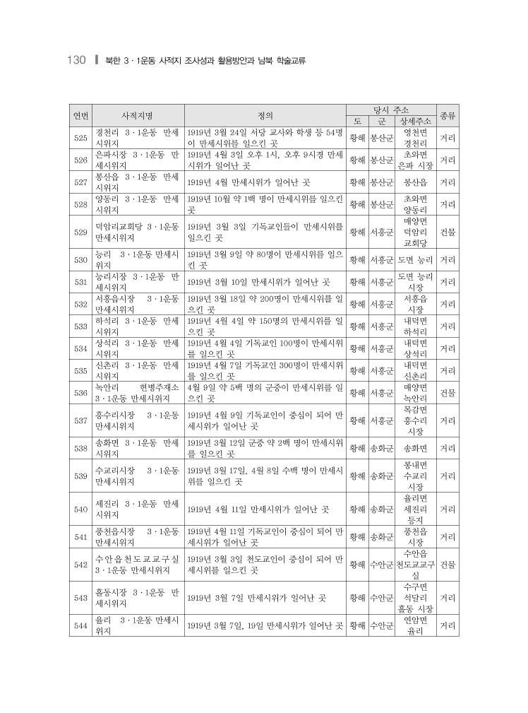 130 ❙ 북한 3·1운동 사적지 조사성과 활용방안과 남북 학술교류 연번 사적지명 정의 당시 주소 종류 도 군 상세주소 525 경천리 3·1운동 만세 시위지 1919년 3월 24일 서당 교사와 학생 등 54명 이 만세시위를 일으킨 곳 황해 봉산군 영천면 경천리 거리 526 은파시장 3·1운동 만 세시위지 1919년 4월 3일 오후 1시, 오후 9시경 만세 시위가 일어난 곳 황해 봉산군 초와면 은파 시장 거리 527 봉산읍 3·1운동 만세 시위지 1919년 4월 만세시위가 일어난 곳 황해 봉산군 봉산읍 거리 528 양동리 3·1운동 만세 시위지 1919년 10월 약 1백 명이 만세시위를 일으킨 곳 황해 봉산군 초와면 양동리 거리 529 덕암리교회당 3·1운동 만세시위지 1919년 3월 3일 기독교인들이 만세시위를 일으킨 곳 황해 서흥군 매양면 덕암리 교회당 건물 530 능리 3·1운동 만세시 위지 1919년 3월 9일 약 80명이 만세시위를 일으 킨 곳 황해 서흥군 도면 능리 거리 531 능리시장 3·1운동 만 세시위지 1919년 3월 10일 만세시위가 일어난 곳 황해 서흥군 도면 능리 시장 거리 532 서흥읍시장 3·1운동 만세시위지 1919년 3월 18일 약 200명이 만세시위를 일 으킨 곳 황해 서흥군 서흥읍 시장 거리 533 하석리 3·1운동 만세 시위지 1919년 4월 4일 약 150명의 만세시위를 일 으킨 곳 황해 서흥군 내덕면 하석리 거리 534 상석리 3·1운동 만세 시위지 1919년 4월 4일 기독교인 100명이 만세시위 를 일으킨 곳 황해 서흥군 내덕면 상석리 거리 535 신촌리 3·1운동 만세 시위지 1919년 4월 7일 기독교인 300명이 만세시위 를 일으킨 곳 황해 서흥군 내덕면 신촌리 거리 536 녹안리 헌병주재소 3·1운동 만세시위지 4월 9일 약 5백 명의 군중이 만세시위를 일 으킨 곳 황해 서흥군 매양면 녹안리 건물 537 흥수리시장 3·1운동 만세시위지 1919년 4월 9일 기독교인이 중심이 되어 만 세시위가 일어난 곳 황해 서흥군 목감면 흥수리 시장 거리 538 송화면 3·1운동 만세 시위지 1919년 3월 12일 군중 약 2백 명이 만세시위 를 일으킨 곳 황해 송화군 송화면 거리 539 수교리시장 3·1운동 만세시위지 1919년 3월 17일, 4월 8일 수백 명이 만세시 위를 일으킨 곳 황해 송화군 봉내면 수교리 시장 거리 540 세진리 3·1운동 만세 시위지 1919년 4월 11일 만세시위가 일어난 곳 황해 송화군 율리면 세진리 등지 거리 541 풍천읍시장 3·1운동 만세시위지 1919년 4월 11일 기독교인이 중심이 되어 만 세시위가 일어난 곳 황해 송화군 풍천읍 시장 거리 542 수안읍천도교교구실 3·1운동 만세시위지 1919년 3월 3일 천도교인이 중심이 되어 만 세시위를 일으킨 곳 황해 수안군 수안읍 천도교교구 실 건물 543 홀동시장 3·1운동 만 세시위지 1919년 3월 7일 만세시위가 일어난 곳 황해 수안군 수구면 석달리 홀동 시장 거리 544 율리 3·1운동 만세시 위지 1919년 3월 7일, 19일 만세시위가 일어난 곳 황해 수안군 연암면 율리 거리