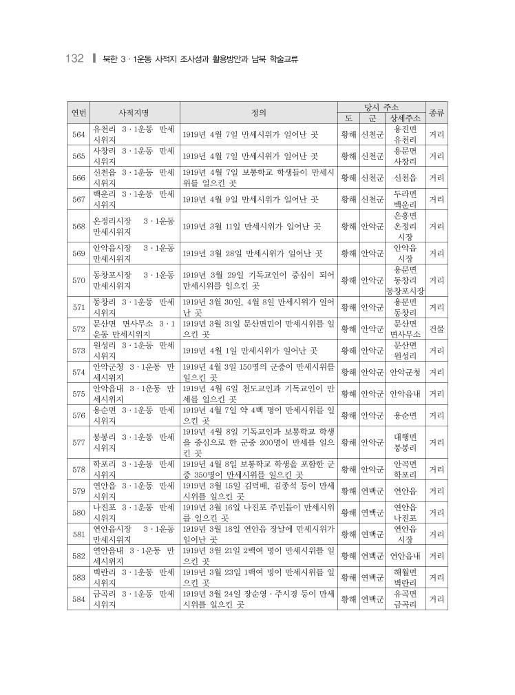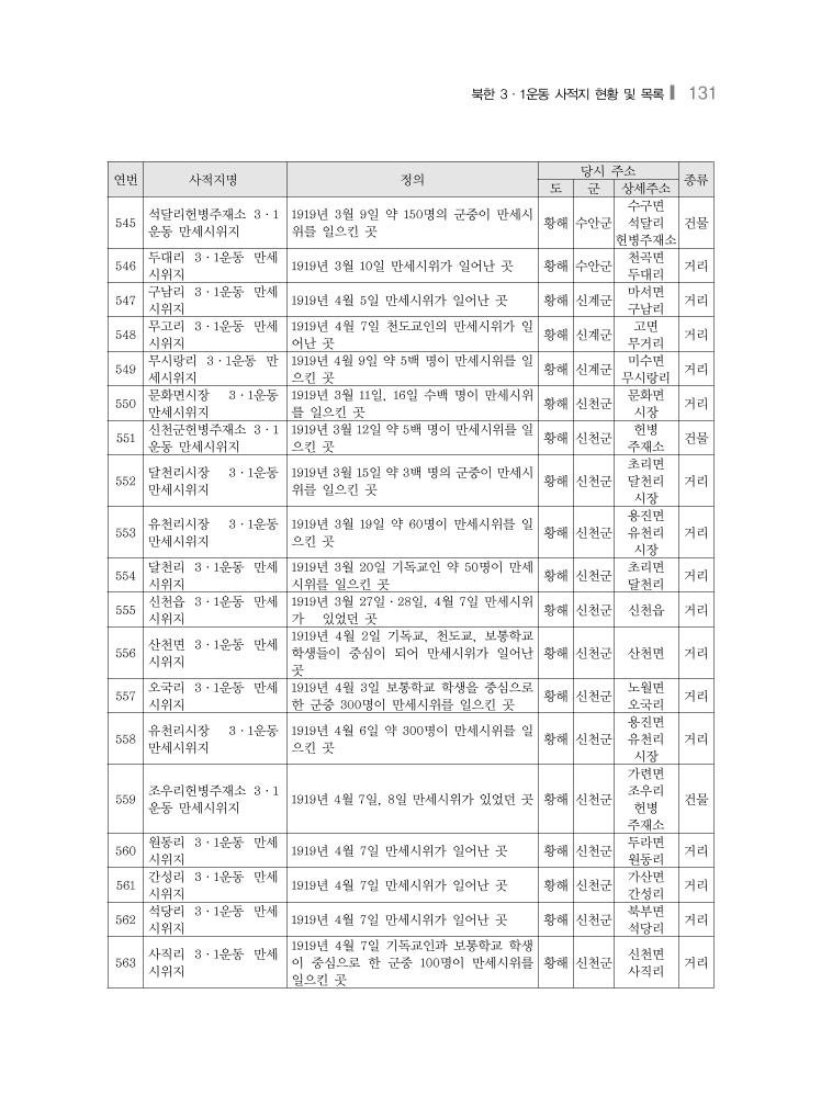 북한 3·1운동 사적지 현황 및 목록❙ 131 연번 사적지명 정의 당시 주소 종류 도 군 상세주소 545 석달리헌병주재소 3·1 운동 만세시위지 1919년 3월 9일 약 150명의 군중이 만세시 위를 일으킨 곳 황해 수안군 수구면 석달리 헌병주재소 건물 546 두대리 3·1운동 만세 시위지 1919년 3월 10일 만세시위가 일어난 곳 황해 수안군 천곡면 두대리 거리 547 구남리 3·1운동 만세 시위지 1919년 4월 5일 만세시위가 일어난 곳 황해 신계군 마서면 구남리 거리 548 무고리 3·1운동 만세 시위지 1919년 4월 7일 천도교인의 만세시위가 일 어난 곳 황해 신계군 고면 무거리 거리 549 무시랑리 3·1운동 만 세시위지 1919년 4월 9일 약 5백 명이 만세시위를 일 으킨 곳 황해 신계군 미수면 무시랑리 거리 550 문화면시장 3·1운동 만세시위지 1919년 3월 11일, 16일 수백 명이 만세시위 를 일으킨 곳 황해 신천군 문화면 시장 거리 551 신천군헌병주재소 3·1 운동 만세시위지 1919년 3월 12일 약 5백 명이 만세시위를 일 으킨 곳 황해 신천군 헌병 주재소 건물 552 달천리시장 3·1운동 만세시위지 1919년 3월 15일 약 3백 명의 군중이 만세시 위를 일으킨 곳 황해 신천군 초리면 달천리 시장 거리 553 유천리시장 3·1운동 만세시위지 1919년 3월 19일 약 60명이 만세시위를 일 으킨 곳 황해 신천군 용진면 유천리 시장 거리 554 달천리 3·1운동 만세 시위지 1919년 3월 20일 기독교인 약 50명이 만세 시위를 일으킨 곳 황해 신천군 초리면 달천리 거리 555 신천읍 3·1운동 만세 시위지 1919년 3월 27일·28일, 4월 7일 만세시위 가 있었던 곳 황해 신천군 신천읍 거리 556 산천면 3·1운동 만세 시위지 1919년 4월 2일 기독교, 천도교, 보통학교 학생들이 중심이 되어 만세시위가 일어난 곳 황해 신천군 산천면 거리 557 오국리 3·1운동 만세 시위지 1919년 4월 3일 보통학교 학생을 중심으로 한 군중 300명이 만세시위를 일으킨 곳 황해 신천군 노월면 오국리 거리 558 유천리시장 3·1운동 만세시위지 1919년 4월 6일 약 300명이 만세시위를 일 으킨 곳 황해 신천군 용진면 유천리 시장 거리 559 조우리헌병주재소 3·1 운동 만세시위지 1919년 4월 7일, 8일 만세시위가 있었던 곳 황해 신천군 가련면 조우리 헌병 주재소 건물 560 원동리 3·1운동 만세 시위지 1919년 4월 7일 만세시위가 일어난 곳 황해 신천군 두라면 원동리 거리 561 간성리 3·1운동 만세 시위지 1919년 4월 7일 만세시위가 일어난 곳 황해 신천군 가산면 간성리 거리 562 석당리 3·1운동 만세 시위지 1919년 4월 7일 만세시위가 일어난 곳 황해 신천군 북부면 석당리 거리 563 사직리 3·1운동 만세 시위지 1919년 4월 7일 기독교인과 보통학교 학생 이 중심으로 한 군중 100명이 만세시위를 일으킨 곳 황해 신천군 신천면 사직리 거리
