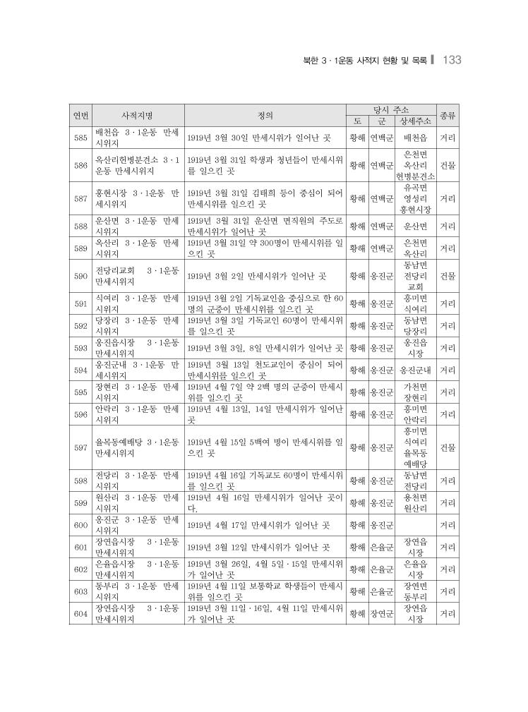 북한 3·1운동 사적지 현황 및 목록❙ 133 연번 사적지명 정의 당시 주소 종류 도 군 상세주소 585 배천읍 3·1운동 만세 시위지 1919년 3월 30일 만세시위가 일어난 곳 황해 연백군 배천읍 거리 586 옥산리헌병분견소 3·1 운동 만세시위지 1919년 3월 31일 학생과 청년들이 만세시위 를 일으킨 곳 황해 연백군 은천면 옥산리 헌병분견소 건물 587 홍현시장 3·1운동 만 세시위지 1919년 3월 31일 김태희 등이 중심이 되어 만세시위를 일으킨 곳 황해 연백군 유곡면 영성리 홍현시장 거리 588 운산면 3·1운동 만세 시위지 1919년 3월 31일 운산면 면직원의 주도로 만세시위가 일어난 곳 황해 연백군 운산면 거리 589 옥산리 3·1운동 만세 시위지 1919년 3월 31일 약 300명이 만세시위를 일 으킨 곳 황해 연백군 은천면 옥산리 거리 590 전당리교회 3·1운동 만세시위지 1919년 3월 2일 만세시위가 일어난 곳 황해 옹진군 동남면 전당리 교회 건물 591 식여리 3·1운동 만세 시위지 1919년 3월 2일 기독교인을 중심으로 한 60 명의 군중이 만세시위를 일으킨 곳 황해 옹진군 흥미면 식여리 거리 592 당장리 3·1운동 만세 시위지 1919년 3월 3일 기독교인 60명이 만세시위 를 일으킨 곳 황해 옹진군 동남면 당장리 거리 593 옹진읍시장 3·1운동 만세시위지 1919년 3월 3일, 8일 만세시위가 일어난 곳 황해 옹진군 옹진읍 시장 거리 594 옹진군내 3·1운동 만 세시위지 1919년 3월 13일 천도교인이 중심이 되어 만세시위를 일으킨 곳 황해 옹진군 옹진군내 거리 595 장현리 3·1운동 만세 시위지 1919년 4월 7일 약 2백 명의 군중이 만세시 위를 일으킨 곳 황해 옹진군 가천면 장현리 거리 596 안락리 3·1운동 만세 시위지 1919년 4월 13일, 14일 만세시위가 일어난 곳 황해 옹진군 흥미면 안락리 거리 597 율목동예배당 3·1운동 만세시위지 1919년 4월 15일 5백여 명이 만세시위를 일 으킨 곳 황해 옹진군 흥미면 식여리 율목동 예배당 건물 598 전당리 3·1운동 만세 시위지 1919년 4월 16일 기독교도 60명이 만세시위 를 일으킨 곳 황해 옹진군 동남면 전당리 거리 599 원산리 3·1운동 만세 시위지 1919년 4월 16일 만세시위가 일어난 곳이 다. 황해 옹진군 용천면 원산리 거리 600 옹진군 3·1운동 만세 시위지 1919년 4월 17일 만세시위가 일어난 곳 황해 옹진군 거리 601 장연읍시장 3·1운동 만세시위지 1919년 3월 12일 만세시위가 일어난 곳 황해 은율군 장연읍 시장 거리 602 은율읍시장 3·1운동 만세시위지 1919년 3월 26일, 4월 5일·15일 만세시위 가 일어난 곳 황해 은율군 은율읍 시장 거리 603 동부리 3·1운동 만세 시위지 1919년 4월 11일 보통학교 학생들이 만세시 위를 일으킨 곳 황해 은율군 장연면 동부리 거리 604 장연읍시장 3·1운동 만세시위지 1919년 3월 11일·16일, 4월 11일 만세시위 가 일어난 곳 황해 장연군 장연읍 시장 거리