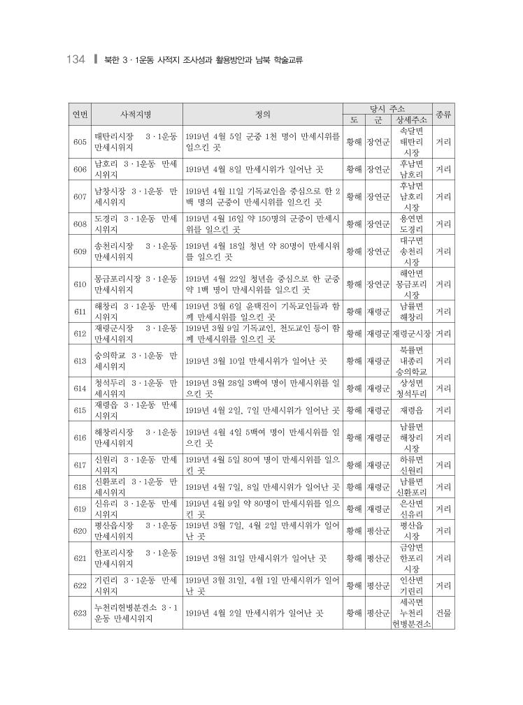 134 ❙ 북한 3·1운동 사적지 조사성과 활용방안과 남북 학술교류 연번 사적지명 정의 당시 주소 종류 도 군 상세주소 605 태탄리시장 3·1운동 만세시위지 1919년 4월 5일 군중 1천 명이 만세시위를 일으킨 곳 황해 장연군 속달면 태탄리 시장 거리 606 남호리 3·1운동 만세 시위지 1919년 4월 8일 만세시위가 일어난 곳 황해 장연군 후남면 남호리 거리 607 남창시장 3·1운동 만 세시위지 1919년 4월 11일 기독교인을 중심으로 한 2 백 명의 군중이 만세시위를 일으킨 곳 황해 장연군 후남면 남호리 시장 거리 608 도경리 3·1운동 만세 시위지 1919년 4월 16일 약 150명의 군중이 만세시 위를 일으킨 곳 황해 장연군 용연면 도경리 거리 609 송천리시장 3·1운동 만세시위지 1919년 4월 18일 청년 약 80명이 만세시위 를 일으킨 곳 황해 장연군 대구면 송천리 시장 거리 610 몽금포리시장 3·1운동 만세시위지 1919년 4월 22일 청년을 중심으로 한 군중 약 1백 명이 만세시위를 일으킨 곳 황해 장연군 해안면 몽금포리 시장 거리 611 해창리 3·1운동 만세 시위지 1919년 3월 6일 윤택진이 기독교인들과 함 께 만세시위를 일으킨 곳 황해 재령군 남률면 해창리 거리 612 재령군시장 3·1운동 만세시위지 1919년 3월 9일 기독교인, 천도교인 등이 함 께 만세시위를 일으킨 곳 황해 재령군재령군시장 거리 613 숭의학교 3·1운동 만 세시위지 1919년 3월 10일 만세시위가 일어난 곳 황해 재령군 북률면 내종리 숭의학교 거리 614 청석두리 3·1운동 만 세시위지 1919년 3월 28일 3백여 명이 만세시위를 일 으킨 곳 황해 재령군 상성면 청석두리 거리 615 재령읍 3·1운동 만세 시위지 1919년 4월 2일, 7일 만세시위가 일어난 곳 황해 재령군 재령읍 거리 616 해창리시장 3·1운동 만세시위지 1919년 4월 4일 5백여 명이 만세시위를 일 으킨 곳 황해 재령군 남률면 해창리 시장 거리 617 신원리 3·1운동 만세 시위지 1919년 4월 5일 80여 명이 만세시위를 일으 킨 곳 황해 재령군 하류면 신원리 거리 618 신환포리 3·1운동 만 세시위지 1919년 4월 7일, 8일 만세시위가 일어난 곳 황해 재령군 남률면 신환포리 거리 619 신유리 3·1운동 만세 시위지 1919년 4월 9일 약 80명이 만세시위를 일으 킨 곳 황해 재령군 은산면 신유리 거리 620 평산읍시장 3·1운동 만세시위지 1919년 3월 7일, 4월 2일 만세시위가 일어 난 곳 황해 평산군 평산읍 시장 거리 621 한포리시장 3·1운동 만세시위지 1919년 3월 31일 만세시위가 일어난 곳 황해 평산군 금암면 한포리 시장 거리 622 기린리 3·1운동 만세 시위지 1919년 3월 31일, 4월 1일 만세시위가 일어 난 곳 황해 평산군 인산면 기린리 거리 623 누천리헌병분견소 3·1 운동 만세시위지 1919년 4월 2일 만세시위가 일어난 곳 황해 평산군 세곡면 누천리 헌병분견소 건물