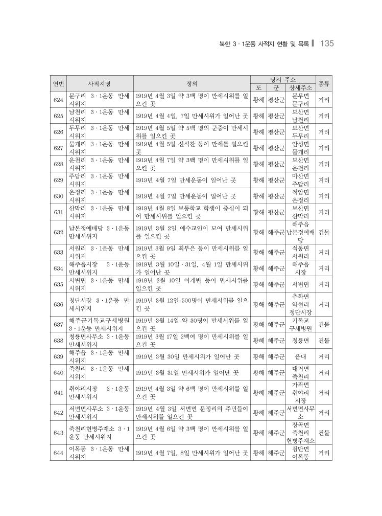 북한 3·1운동 사적지 현황 및 목록❙ 135 연번 사적지명 정의 당시 주소 종류 도 군 상세주소 624 문구리 3·1운동 만세 시위지 1919년 4월 3일 약 3백 명이 만세시위를 일 으킨 곳 황해 평산군 문무면 문구리 거리 625 남천리 3·1운동 만세 시위지 1919년 4월 4일, 7일 만세시위가 일어난 곳 황해 평산군 보산면 남천리 거리 626 두무리 3·1운동 만세 시위지 1919년 4월 5일 약 5백 명의 군중이 만세시 위를 일으킨 곳 황해 평산군 보산면 두무리 거리 627 물개리 3·1운동 만세 시위지 1919년 4월 5일 신석찬 등이 만세를 일으킨 곳 황해 평산군 안성면 물개리 거리 628 운천리 3·1운동 만세 시위지 1919년 4월 7일 약 3백 명이 만세시위를 일 으킨 곳 황해 평산군 보산면 운천리 거리 629 주답리 3·1운동 만세 시위지 1919년 4월 7일 만세운동이 일어난 곳 황해 평산군 마산면 주답리 거리 630 온정리 3·1운동 만세 시위지 1919년 4월 7일 만세운동이 일어난 곳 황해 평산군 적암면 온정리 거리 631 산막리 3·1운동 만세 시위지 1919년 4월 8일 보통학교 학생이 중심이 되 어 만세시위를 일으킨 곳 황해 평산군 보산면 산막리 거리 632 남본정예배당 3·1운동 만세시위지 1919년 3월 2일 예수교인이 모여 만세시위 를 일으킨 곳 황해 해주군 해주읍 남본정예배 당 건물 633 서원리 3·1운동 만세 시위지 1919년 3월 9일 최부은 등이 만세시위를 일 으킨 곳 황해 해주군 석동면 서원리 거리 634 해주읍시장 3·1운동 만세시위지 1919년 3월 10일·31일, 4월 1일 만세시위 가 일어난 곳 황해 해주군 해주읍 시장 거리 635 서변면 3·1운동 만세 시위지 1919년 3월 10일 이계빈 등이 만세시위를 일으킨 곳 황해 해주군 서변면 거리 636 청단시장 3·1운동 만 세시위지 1919년 3월 12일 500명이 만세시위를 일으 킨 곳 황해 해주군 추화면 약현리 청단시장 거리 637 해주군기독교구세병원 3·1운동 만세시위지 1919년 3월 14일 약 30명이 만세시위를 일 으킨 곳 황해 해주군 기독교 구세병원 건물 638 청룡면사무소 3·1운동 만세시위지 1919년 3월 17일 2백여 명이 만세시위를 일 으킨 곳 황해 해주군 청룡면 건물 639 해주읍 3·1운동 만세 시위지 1919년 3월 30일 만세시위가 일어난 곳 황해 해주군 읍내 거리 640 죽천리 3·1운동 만세 시위지 1919년 3월 31일 만세시위가 일어난 곳 황해 해주군 대거면 죽천리 거리 641 취야리시장 3·1운동 만세시위지 1919년 4월 3일 약 6백 명이 만세시위를 일 으킨 곳 황해 해주군 가좌면 취야리 시장 거리 642 서변면사무소 3·1운동 만세시위지 1919년 4월 3일 서변면 문정리의 주민들이 만세시위를 일으킨 곳 황해 해주군 서변면사무 소 거리 643 죽천리헌병주재소 3·1 운동 만세시위지 1919년 4월 6일 약 3백 명이 만세시위를 일 으킨 곳 황해 해주군 장곡면 죽천리 헌병주재소 건물 644 이목동 3·1운동 만세 시위지 1919년 4월 7일, 8일 만세시위가 일어난 곳 황해 해주군 검단면 이목동 거리