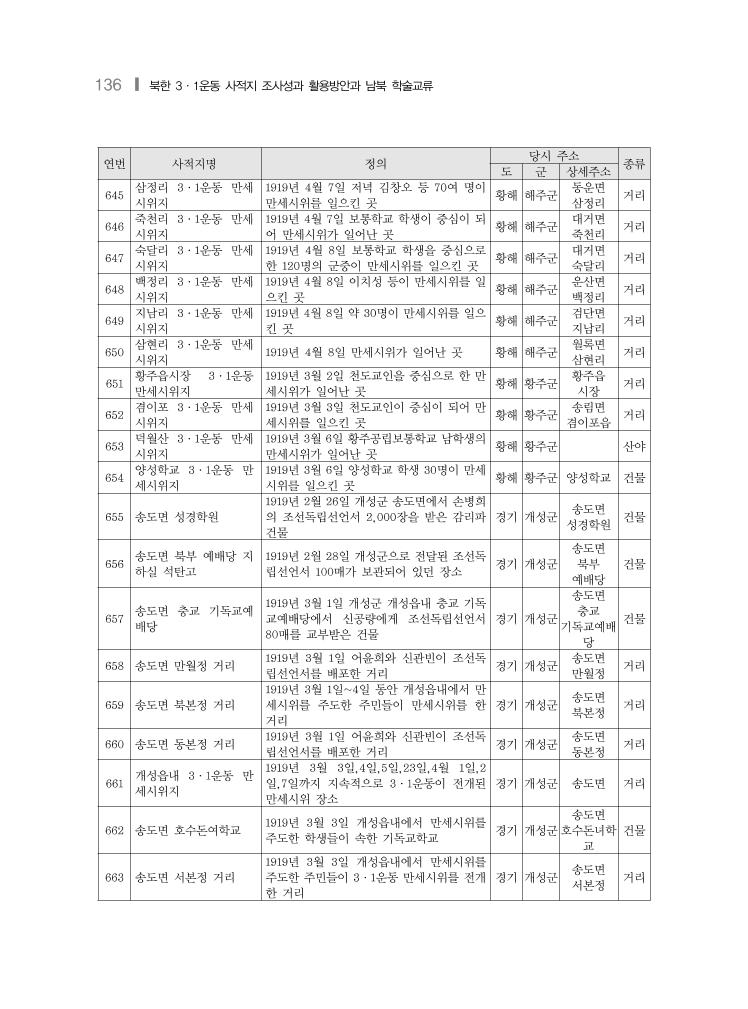 136 ❙ 북한 3·1운동 사적지 조사성과 활용방안과 남북 학술교류 연번 사적지명 정의 당시 주소 종류 도 군 상세주소 645 삼정리 3·1운동 만세 시위지 1919년 4월 7일 저녁 김창오 등 70여 명이 만세시위를 일으킨 곳 황해 해주군 동운면 삼정리 거리 646 죽천리 3·1운동 만세 시위지 1919년 4월 7일 보통학교 학생이 중심이 되 어 만세시위가 일어난 곳 황해 해주군 대거면 죽천리 거리 647 숙달리 3·1운동 만세 시위지 1919년 4월 8일 보통학교 학생을 중심으로 한 120명의 군중이 만세시위를 일으킨 곳 황해 해주군 대거면 숙달리 거리 648 백정리 3·1운동 만세 시위지 1919년 4월 8일 이치성 등이 만세시위를 일 으킨 곳 황해 해주군 운산면 백정리 거리 649 지남리 3·1운동 만세 시위지 1919년 4월 8일 약 30명이 만세시위를 일으 킨 곳 황해 해주군 검단면 지남리 거리 650 삼현리 3·1운동 만세 시위지 1919년 4월 8일 만세시위가 일어난 곳 황해 해주군 월록면 삼현리 거리 651 황주읍시장 3·1운동 만세시위지 1919년 3월 2일 천도교인을 중심으로 한 만 세시위가 일어난 곳 황해 황주군 황주읍 시장 거리 652 겸이포 3·1운동 만세 시위지 1919년 3월 3일 천도교인이 중심이 되어 만 세시위를 일으킨 곳 황해 황주군 송림면 겸이포읍 거리 653 덕월산 3·1운동 만세 시위지 1919년 3월 6일 황주공립보통학교 남학생의 만세시위가 일어난 곳 황해 황주군 산야 654 양성학교 3·1운동 만 세시위지 1919년 3월 6일 양성학교 학생 30명이 만세 시위를 일으킨 곳 황해 황주군 양성학교 건물 655 송도면 성경학원 1919년 2월 26일 개성군 송도면에서 손병희 의 조선독립선언서 2,000장을 받은 감리파 건물 경기 개성군 송도면 성경학원 건물 656 송도면 북부 예배당 지 하실 석탄고 1919년 2월 28일 개성군으로 전달된 조선독 립선언서 100매가 보관되어 있던 장소 경기 개성군 송도면 북부 예배당 건물 657 송도면 충교 기독교예 배당 1919년 3월 1일 개성군 개성읍내 충교 기독 교예배당에서 신공량에게 조선독립선언서 80매를 교부받은 건물 경기 개성군 송도면 충교 기독교예배 당 건물 658 송도면 만월정 거리 1919년 3월 1일 어윤희와 신관빈이 조선독 립선언서를 배포한 거리 경기 개성군 송도면 만월정 거리 659 송도면 북본정 거리 1919년 3월 1일~4일 동안 개성읍내에서 만 세시위를 주도한 주민들이 만세시위를 한 거리 경기 개성군 송도면 북본정 거리 660 송도면 동본정 거리 1919년 3월 1일 어윤희와 신관빈이 조선독 립선언서를 배포한 거리 경기 개성군 송도면 동본정 거리 661 개성읍내 3·1운동 만 세시위지 1919년 3월 3일,4일,5일,23일,4월 1일,2 일,7일까지 지속적으로 3·1운동이 전개된 만세시위 장소 경기 개성군 송도면 거리 662 송도면 호수돈여학교 1919년 3월 3일 개성읍내에서 만세시위를 주도한 학생들이 속한 기독교학교 경기 개성군 송도면 호수돈녀학 교 건물 663 송도면 서본정 거리 1919년 3월 3일 개성읍내에서 만세시위를 주도한 주민들이 3·1운동 만세시위를 전개 한 거리 경기 개성군 송도면 서본정 거리