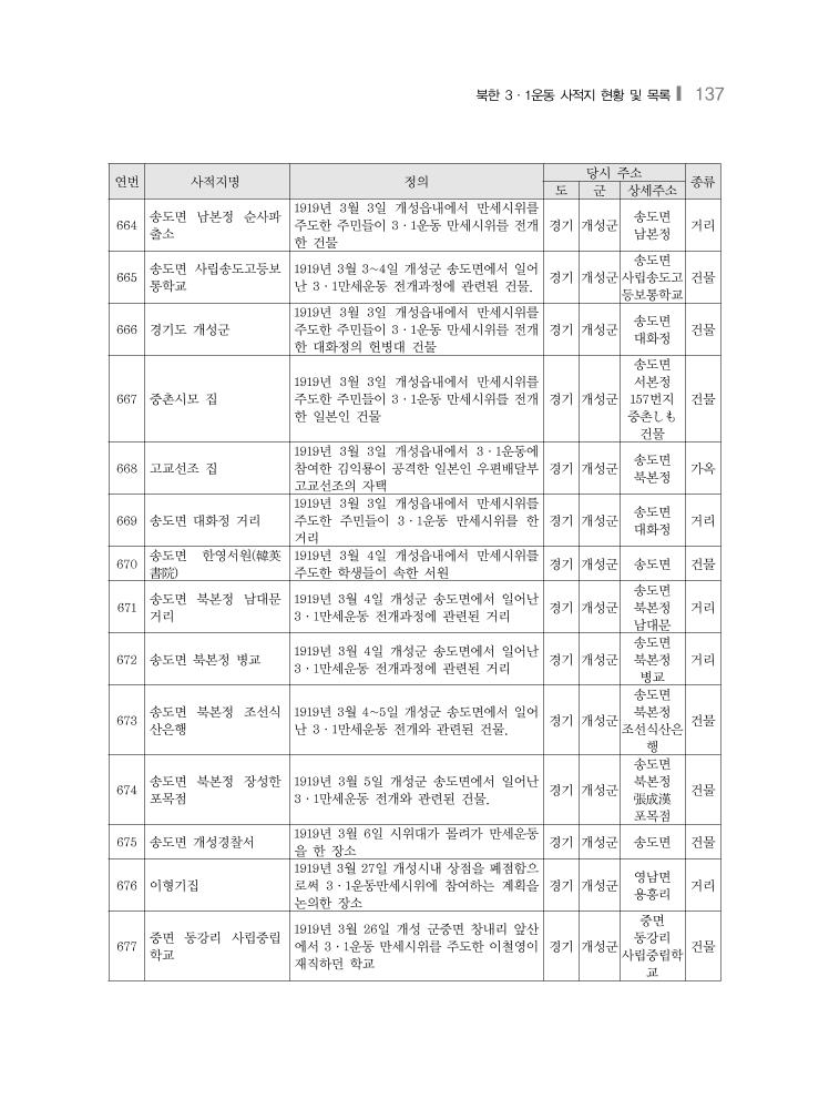 북한 3·1운동 사적지 현황 및 목록❙ 137 연번 사적지명 정의 당시 주소 종류 도 군 상세주소 664 송도면 남본정 순사파 출소 1919년 3월 3일 개성읍내에서 만세시위를 주도한 주민들이 3·1운동 만세시위를 전개 한 건물 경기 개성군 송도면 남본정 거리 665 송도면 사립송도고등보 통학교 1919년 3월 3~4일 개성군 송도면에서 일어 난 3·1만세운동 전개과정에 관련된 건물. 경기 개성군 송도면 사립송도고 등보통학교 건물 666 경기도 개성군 1919년 3월 3일 개성읍내에서 만세시위를 주도한 주민들이 3·1운동 만세시위를 전개 한 대화정의 헌병대 건물 경기 개성군 송도면 대화정 건물 667 중촌시모 집 1919년 3월 3일 개성읍내에서 만세시위를 주도한 주민들이 3·1운동 만세시위를 전개 한 일본인 건물 경기 개성군 송도면 서본정 157번지 중촌しも 건물 건물 668 고교선조 집 1919년 3월 3일 개성읍내에서 3·1운동에 참여한 김익룡이 공격한 일본인 우편배달부 고교선조의 자택 경기 개성군 송도면 북본정 가옥 669 송도면 대화정 거리 1919년 3월 3일 개성읍내에서 만세시위를 주도한 주민들이 3·1운동 만세시위를 한 거리 경기 개성군 송도면 대화정 거리 670 송도면 한영서원(韓英 書院) 1919년 3월 4일 개성읍내에서 만세시위를 주도한 학생들이 속한 서원 경기 개성군 송도면 건물 671 송도면 북본정 남대문 거리 1919년 3월 4일 개성군 송도면에서 일어난 3·1만세운동 전개과정에 관련된 거리 경기 개성군 송도면 북본정 남대문 거리 672 송도면 북본정 병교 1919년 3월 4일 개성군 송도면에서 일어난 3·1만세운동 전개과정에 관련된 거리 경기 개성군 송도면 북본정 병교 거리 673 송도면 북본정 조선식 산은행 1919년 3월 4~5일 개성군 송도면에서 일어 난 3·1만세운동 전개와 관련된 건물. 경기 개성군 송도면 북본정 조선식산은 행 건물 674 송도면 북본정 장성한 포목점 1919년 3월 5일 개성군 송도면에서 일어난 3·1만세운동 전개와 관련된 건물. 경기 개성군 송도면 북본정 張成漢 포목점 건물 675 송도면 개성경찰서 1919년 3월 6일 시위대가 몰려가 만세운동 을 한 장소 경기 개성군 송도면 건물 676 이형기집 1919년 3월 27일 개성시내 상점을 폐점함으 로써 3·1운동만세시위에 참여하는 계획을 논의한 장소 경기 개성군 영남면 용흥리 거리 677 중면 동강리 사립중립 학교 1919년 3월 26일 개성 군중면 창내리 앞산 에서 3·1운동 만세시위를 주도한 이철영이 재직하던 학교 경기 개성군 중면 동강리 사립중립학 교 건물