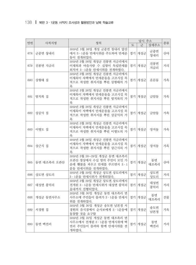 138 ❙ 북한 3·1운동 사적지 조사성과 활용방안과 남북 학술교류 연번 사적지명 정의 당시 주소 종류 도 군 상세주소 678 군중면 창내리 1919년 3월 26일 개성 군중면 창내리 앞산 에서 3·1운동 만세시위를 주도하여 만세운 동이 전개되었다. 경기 개성군 군중면 창내리 산야 679 진봉면 지금리 1919년 3월 26일 개성군 진봉면 지금리에서 이재록과 마을사람 수 십명이 독립만세를 외치며 3·1운동 만세시위를 전개하였다. 경기 개성군 진봉면 지금리 거리 680 상형태 집 1919년 3월 26일 개성군 진봉면 지금리에서 이재록이 자택에서 만세운동을 고조시킬 목 적으로 작성한 취지서를 뿌린 상형태의 가 옥 경기 개성군 운문동 가옥 681 방치록 집 1919년 3월 26일 개성군 진봉면 지금리에서 이재록이 자택에서 만세운동을 고조시킬 목 적으로 작성한 취지서를 뿌린 방치록의 가 옥 경기 개성군 금암동 가옥 682 상공익 집 1919년 3월 26일 개성군 진봉면 지금리에서 이재록이 자택에서 만세운동을 고조시킬 목 적으로 작성한 취지서를 뿌린 상공익의 가 옥 경기 개성군 금암동 가옥 683 이병도 집 1919년 3월 26일 개성군 진봉면 지금리에서 이재록이 자택에서 만세운동을 고조시킬 목 적으로 작성한 취지서를 뿌린 이병도의 가 옥 경기 개성군 장지동 가옥 684 상근식 집 1919년 3월 26일 개성군 진봉면 지금리에서 이재록이 자택에서 만세운동을 고조시킬 목 적으로 작성한 취지서를 뿌린 상근식의 가 옥 경기 개성군 장지동 가옥 685 동면 대조족리 오관산 1919년 3월 28~29일 개성군 동면 대조족리 오관산 정상에서 수십 명의 주민이 모인 가 운데 횃불을 피우고 만세를 부르면서 3·1 운동 만세시위를 전개하였다. 경기 개성군 동면 대조족리 산야 686 상도면 상도리 1919년 3월 29일 개성군 상도면 상도리에서 3·1운동 만세시위가 전개되었다. 경기 개성군 상도면 상도리 거리 687 대성면 풍덕리 1919년 3월 29일 개성군 상도면 상도리에서 전개된 3·1운동 만세시위가 대성면 풍덕리 읍내까지 진행되었다. 경기 개성군 대성면 풍덕리 거리 688 개성군 동면사무소 1919년 3월 30일 개성군 동면 대조족리 면 사무소에 주민들이 몰려가 3·1운동 만세시 위를 전개하였다. 경기 개성군 동면 대조족리 건물 689 서경원 집 1919년 3월 30일 개성군 송도면 남본정 서 경원의 음식점에서 순사보에게 3·1운동에 동참할 것을 요구함 경기 개성군 송도면 남본정 가옥 690 동면 백전리 1919년 3월 31일 개성군 동면 대조족리 면 사무소에서 전개된 3·1운동 만세시위에 백 전리 주민들이 몰려와 함께 만세시위를 전 개하였다. 경기 개성군 동면 백전리 거리