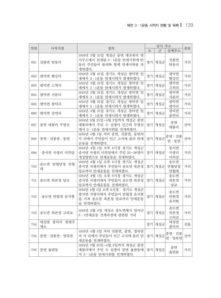 북한 3·1운동 사적지 현황 및 목록❙ 139 연번 사적지명 정의 당시 주소 종류 도 군 상세주소 691 진봉면 탄동리 1919년 3월 31일 개성군 동면 대조족리 면 사무소에서 전개된 3·1운동 만세시위에 탄 동리 주민들이 몰려와 함께 만세시위를 전 개하였다. 경기 개성군 진봉면 탄동리 거리 692 광덕면 황강리 1919년 3월 31일 경기도 개성군 광덕면 일 대에서 3·1운동 만세시위가 발생하였다. 경기 개성군 광덕면 황강리 거리 693 광덕면 고척리 1919년 3월 31일 경기도 개성군 광덕면 일 대에서 3·1운동 만세시위가 발생하였다. 경기 개성군 광덕면 고척리 거리 694 광덕면 사분리 1919년 3월 31일 경기도 개성군 광덕면 일 대에서 3·1운동 만세시위가 발생하였다. 경기 개성군 광덕면 사분리 거리 695 광덕면 광덕리 1919년 3월 31일 경기도 개성군 광덕면 일 대에서 3·1운동 만세시위가 발생하였다. 경기 개성군 광덕면 광덕리 거리 696 광덕면 중연리 1919년 3월 31일 경기도 개성군 광덕면 일 대에서 3·1운동 만세시위가 발생하였다. 경기 개성군 광덕면 중연리 거리 697 중면 대룡리 무명산 1919년 3월 31일~4월 2일까지 개성군 중면 대룡리에서 주민 수 십명이 인근의 무명산 에서 3·1운동 만세시위를 전개하였다. 경기 개성군 중면 대룡리 산야 698 중면·진봉면·동면 1919년 4월 1일 저녁 중면, 진봉면, 동면의 각 리에서 주민들이 인근 고지에 올라 만세 운동을 전개하였다. 경기 개성군 중면·진봉 면·동면 산야 699 중서면 곡령리 미륵당 1919년 4월 1일 오후 8시경 경기도 개성군 중서면 곡령리 미륵당에서 주민 35~36명이 개성방면으로 만세운동을 전개하였다. 경기 개성군 중서면 곡령리 미륵당 거리 700 송도면 만월당정 만월 대 1919년 4월 1일 오후 8시경 경기도 개성군 중서면 곡령리에서 주민들이 송도면 북본정 당교까지 만세운동을 전개하였다. 경기 개성군 송도면 만월당정 만월대 거리 701 송도면 북본정 당교 1919년 4월 1일 오후 8시경 경기도 개성군 중서면 곡령리에서 주민들이 송도면 북본정 당교까지 만세운동을 전개하였다. 경기 개성군 송도면 북본정 당교 거리 702 송도면 만월정 음지현 1919년 4월 1일 오후 8시경 경기도 개성군 중서면 곡령리에서 주민들이 만월정 음지현 을 거쳐 송도면 북본정 당교까지 만세운동 을 전개하였다. 경기 개성군 송도면 만월정 음지현 거리 703 송도면 북본정 고려교 1919년 3월 4일 개성군 송도면에서 일어난 3·1만세운동 전개과정에 관련된 거리 경기 개성군 송도면 북본정 고려교 거리 704 대성면 풍덕리 헌병주 재소 경기 개성군 대성면 풍덕리 건물 705 중면·진봉면·영북면 1919년 4월 2일 저녁 진봉면, 중면, 영북면 의 각 리에서 주민들이 인근 고지에 올라 만 세운동을 전개하였다. 경기 개성군 중면·진봉 면·영북면 산야 706 중면 율관동 1919년 3월 31일~4월 2일까지 개성군 중면 대룡리에서 주민 수 십명이 중면 율관동에 서 3·1운동 만세시위를 전개하였다. 경기 개성군 중면 율관동 거리
