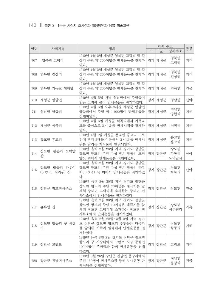 140 ❙ 북한 3·1운동 사적지 조사성과 활용방안과 남북 학술교류 연번 사적지명 정의 당시 주소 종류 도 군 상세주소 707 영북면 고덕리 1919년 4월 2일 개성군 영북면 고덕리 및 길 상리 주민 약 200여명은 만세운동을 전개하 였다. 경기 개성군 영북면 고덕리 거리 708 영북면 길상리 1919년 4월 2일 개성군 영북면 고덕리 및 길 상리 주민 약 200여명은 만세운동을 전개하 였다. 경기 개성군 영북면 길상리 거리 709 영북면 기독교 예배당 1919년 4월 2일 개성군 영북면 고덕리 및 길 상리 주민 약 200여명은 만세운동을 전개하 였다. 경기 개성군 영북면 건물 710 개성군 영남면 1919년 4월 5일 저녁 영남면에서 주민들이 인근 고지에 올라 만세운동을 전개하였다. 경기 개성군 영남면 산야 711 영남면 양합리 1919년 4월 6일 오후 9시경 개성군 영남면 양합리에서 주민 약 1,000명이 만세운동을 전개하였다. 경기 개성군 영남면 양합리 거리 712 개성군 석곡리 1919년 4월 6일 개성군 석곡리에서 기독교 도를 중심으로 3·1운동 만세시위를 전개하 였다. 경기 개성군 석곡리 거리 713 흥교면 흥교리 1919년 4월 1일 개성군 흥교면 흥교리 도로 위에 백지 2매를 이용해서 3·1운동 만세시 위를 알리는 게시물이 발견되었다. 경기 개성군 흥교면 흥교리 거리 714 장도면 항동리 도덕암 산 1919년 음력 2월 28일 저녁 경기도 장단군 장도면 향도리 주민 수십 명은 항동리 도덕 암산 위에서 만세운동을 전개하였다. 경기 장단군 장도면 항동리 도덕암산 산야 715 장도면 항동리 라우이 (ラウイ, 시라위) 산 1919년 음력 2월 29일 저녁 경기도 장단군 장도면 향도리 주민 수십 명은 항동리 라우 이(ラウイ) 산 위에서 만세운동을 전개하였 다. 경기 장단군 장도면 항동리 산야 716 장단군 장도면사무소 1919년 음력 2월 30일 저녁 경기도 장단군 장도면 향도리 주민 70여명은 태극기를 앞 세워 장도면 고딕리에 소재하는 장도면 면 사무소에서 만세운동을 전개하였다. 경기 장단군 장도면 건물 717 윤우영 집 1919년 음력 2월 30일 저녁 경기도 장단군 장도면 향도리 주민 70여명은 태극기를 앞 세워 장도면 고딕리에 소재하는 장도면 면 사무소에서 만세운동을 전개하였다. 경기 장단군 장도면 석주원리 가옥 718 장도면 항동리 구 시장 터 1919년 음력 2월 28일~3월 2일 저녁 경기 도 장단군 장도면 향도리 주민들은 태극기 를 앞세워 거주지 일대에서 만세운동을 전 개하였다. 경기 장단군 장도면 항동리 거리 719 장단군 고랑포 1919년 음력 3월 2일 경기도 장단군 장도면 향도리 구 시장터에서 고랑포 시장 통행인 100여명이 주민들과 함께 만세운동을 전개 하였다. 경기 장단군 고랑포 거리 720 장단군 진남면사무소 1919년 3월 26일 장단군 진남면 동장리에서 주민 150명이 면사무소를 향해 3·1운동 만 세시위를 전개하였다. 경기 장단군 진남면 동장리 건물