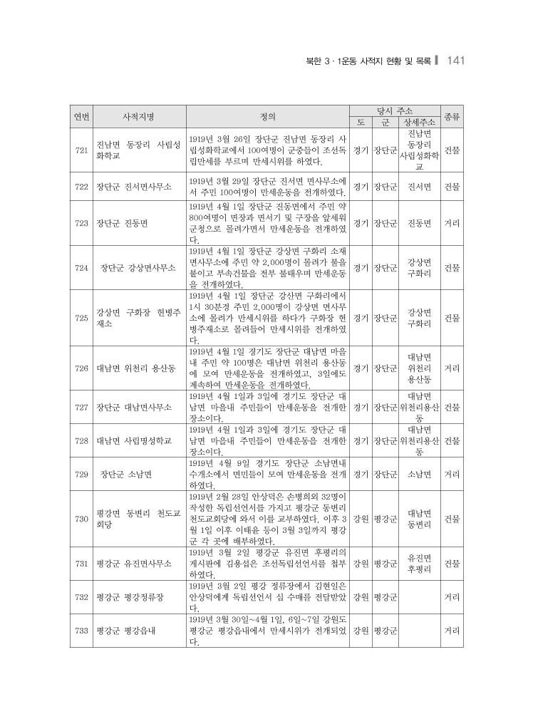 북한 3·1운동 사적지 현황 및 목록❙ 141 연번 사적지명 정의 당시 주소 종류 도 군 상세주소 721 진남면 동장리 사립성 화학교 1919년 3월 26일 장단군 진남면 동장리 사 립성화학교에서 100여명이 군중들이 조선독 립만세를 부르며 만세시위를 하였다. 경기 장단군 진남면 동장리 사립성화학 교 건물 722 장단군 진서면사무소 1919년 3월 29일 장단군 진서면 면사무소에 서 주민 100여명이 만세운동을 전개하였다. 경기 장단군 진서면 건물 723 장단군 진동면 1919년 4월 1일 장단군 진동면에서 주민 약 800여명이 면장과 면서기 및 구장을 앞세워 군청으로 몰려가면서 만세운동을 전개하였 다. 경기 장단군 진동면 거리 724 장단군 강상면사무소 1919년 4월 1일 장단군 강상면 구화리 소재 면사무소에 주민 약 2,000명이 몰려가 불을 붙이고 부속건물을 전부 불태우며 만세운동 을 전개하였다. 경기 장단군 강상면 구화리 건물 725 강상면 구화장 헌병주 재소 1919년 4월 1일 장단군 강산면 구화리에서 1시 30분경 주민 2,000명이 강상면 면사무 소에 몰려가 만세시위를 하다가 구화장 헌 병주재소로 몰려들어 만세시위를 전개하였 다. 경기 장단군 강상면 구화리 건물 726 대남면 위천리 용산동 1919년 4월 1일 경기도 장단군 대남면 마을 내 주민 약 100명은 대남면 위천리 용산동 에 모여 만세운동을 전개하였고, 3일에도 계속하여 만세운동을 전개하였다. 경기 장단군 대남면 위천리 용산동 거리 727 장단군 대남면사무소 1919년 4월 1일과 3일에 경기도 장단군 대 남면 마을내 주민들이 만세운동을 전개한 장소이다. 경기 장단군 대남면 위천리용산 동 건물 728 대남면 사립명성학교 1919년 4월 1일과 3일에 경기도 장단군 대 남면 마을내 주민들이 만세운동을 전개한 장소이다. 경기 장단군 대남면 위천리용산 동 건물 729 장단군 소남면 1919년 4월 9일 경기도 장단군 소남면내 수개소에서 면민들이 모여 만세운동을 전개 하였다. 경기 장단군 소남면 거리 730 평강면 동변리 천도교 회당 1919년 2월 28일 안상덕은 손병희외 32명이 작성한 독립선언서를 가지고 평강군 동변리 천도교회당에 와서 이를 교부하였다. 이후 3 월 1일 이후 이태윤 등이 3월 3일까지 평강 군 각 곳에 배부하였다. 강원 평강군 대남면 동변리 건물 731 평강군 유진면사무소 1919년 3월 2일 평강군 유진면 후평리의 게시판에 김용섭은 조선독립선언서를 첩부 하였다. 강원 평강군 유진면 후평리 건물 732 평강군 평강정류장 1919년 3월 2일 평강 정류장에서 김현일은 안상덕에게 독립선언서 십 수매를 전달받았 다. 강원 평강군 거리 733 평강군 평강읍내 1919년 3월 30일~4월 1일, 6일~7일 강원도 평강군 평강읍내에서 만세시위가 전개되었 다. 강원 평강군 거리