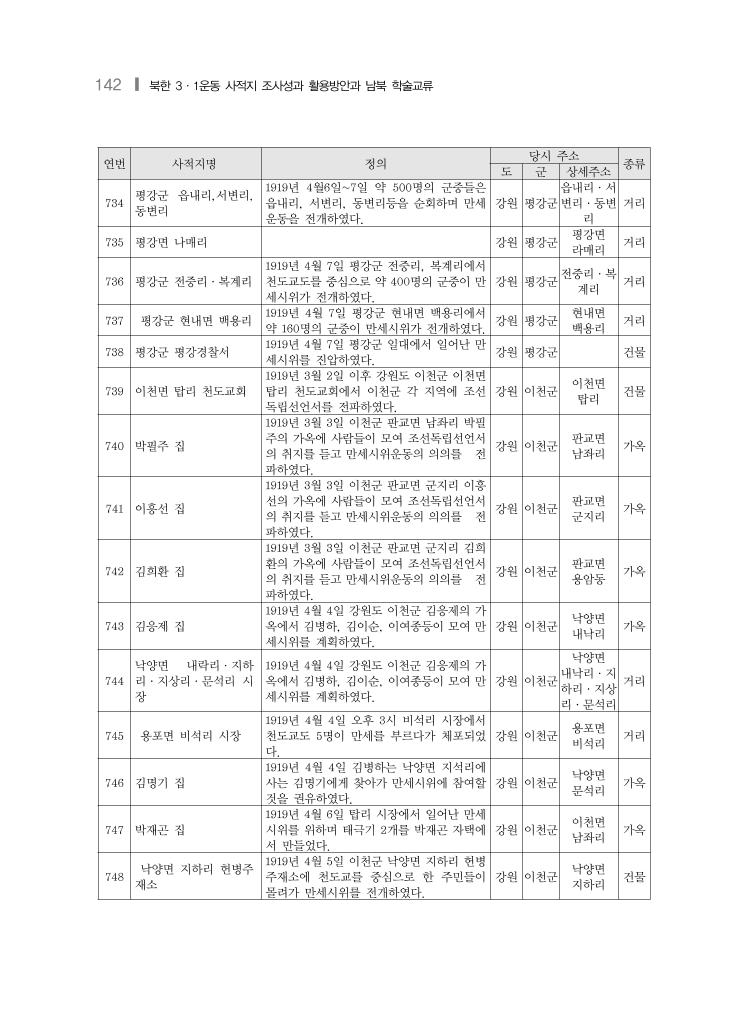 142 ❙ 북한 3·1운동 사적지 조사성과 활용방안과 남북 학술교류 연번 사적지명 정의 당시 주소 종류 도 군 상세주소 734 평강군 읍내리,서변리, 동변리 1919년 4월6일~7일 약 500명의 군중들은 읍내리, 서변리, 동변리등을 순회하며 만세 운동을 전개하였다. 강원 평강군 읍내리·서 변리·동변 리 거리 735 평강면 나매리 강원 평강군 평강면 라매리 거리 736 평강군 전중리·복계리 1919년 4월 7일 평강군 전중리, 복계리에서 천도교도를 중심으로 약 400명의 군중이 만 세시위가 전개하였다. 강원 평강군 전중리·복 계리 거리 737 평강군 현내면 백용리 1919년 4월 7일 평강군 현내면 백용리에서 약 160명의 군중이 만세시위가 전개하였다. 강원 평강군 현내면 백용리 거리 738 평강군 평강경찰서 1919년 4월 7일 평강군 일대에서 일어난 만 세시위를 진압하였다. 강원 평강군 건물 739 이천면 탑리 천도교회 1919년 3월 2일 이후 강원도 이천군 이천면 탑리 천도교회에서 이천군 각 지역에 조선 독립선언서를 전파하였다. 강원 이천군 이천면 탑리 건물 740 박필주 집 1919년 3월 3일 이천군 판교면 남좌리 박필 주의 가옥에 사람들이 모여 조선독립선언서 의 취지를 듣고 만세시위운동의 의의를 전 파하였다. 강원 이천군 판교면 남좌리 가옥 741 이흥선 집 1919년 3월 3일 이천군 판교면 군지리 이흥 선의 가옥에 사람들이 모여 조선독립선언서 의 취지를 듣고 만세시위운동의 의의를 전 파하였다. 강원 이천군 판교면 군지리 가옥 742 김희환 집 1919년 3월 3일 이천군 판교면 군지리 김희 환의 가옥에 사람들이 모여 조선독립선언서 의 취지를 듣고 만세시위운동의 의의를 전 파하였다. 강원 이천군 판교면 용암동 가옥 743 김응제 집 1919년 4월 4일 강원도 이천군 김응제의 가 옥에서 김병하, 김이순, 이여종등이 모여 만 세시위를 계획하였다. 강원 이천군 낙양면 내낙리 가옥 744 낙양면 내락리·지하 리·지상리·문석리 시 장 1919년 4월 4일 강원도 이천군 김응제의 가 옥에서 김병하, 김이순, 이여종등이 모여 만 세시위를 계획하였다. 강원 이천군 낙양면 내낙리·지 하리·지상 리·문석리 거리 745 용포면 비석리 시장 1919년 4월 4일 오후 3시 비석리 시장에서 천도교도 5명이 만세를 부르다가 체포되었 다. 강원 이천군 용포면 비석리 거리 746 김명기 집 1919년 4월 4일 김병하는 낙양면 지석리에 사는 김명기에게 찾아가 만세시위에 참여할 것을 권유하였다. 강원 이천군 낙양면 문석리 가옥 747 박재곤 집 1919년 4월 6일 탑리 시장에서 일어난 만세 시위를 위하며 태극기 2개를 박재곤 자택에 서 만들었다. 강원 이천군 이천면 남좌리 가옥 748 낙양면 지하리 헌병주 재소 1919년 4월 5일 이천군 낙양면 지하리 헌병 주재소에 천도교를 중심으로 한 주민들이 몰려가 만세시위를 전개하였다. 강원 이천군 낙양면 지하리 건물